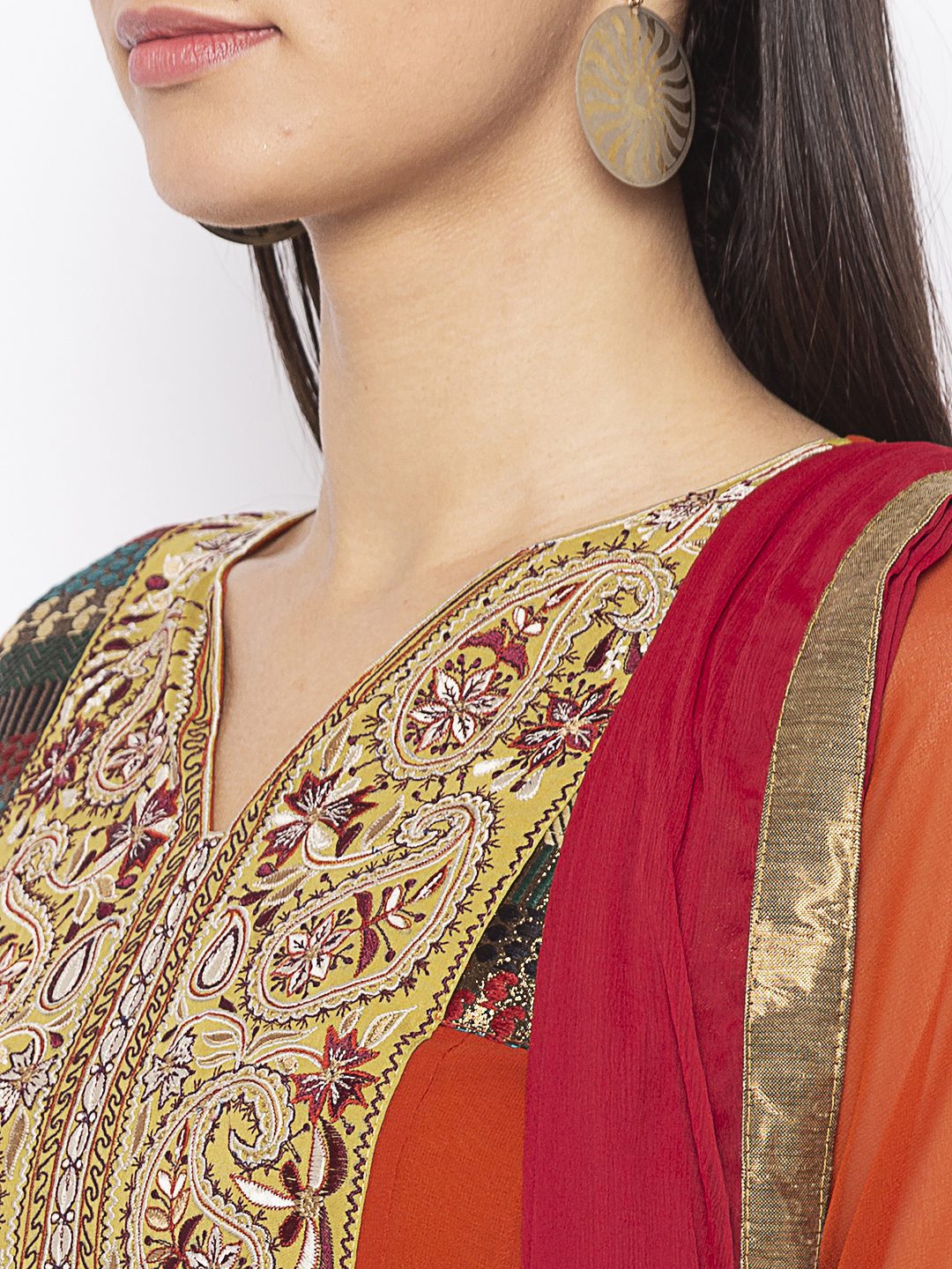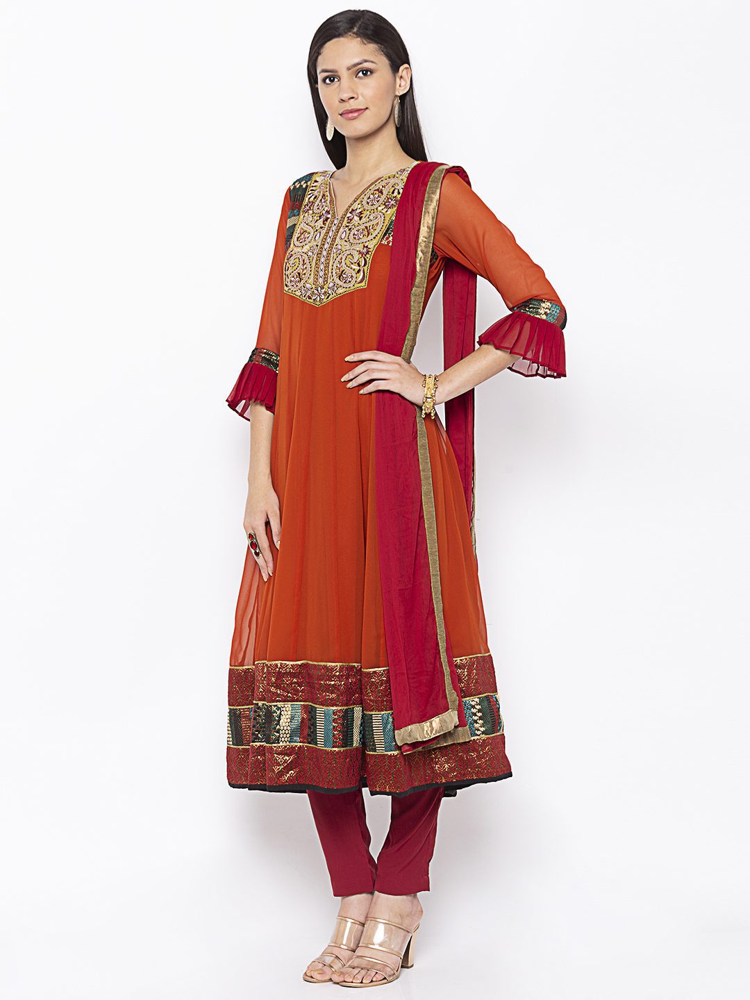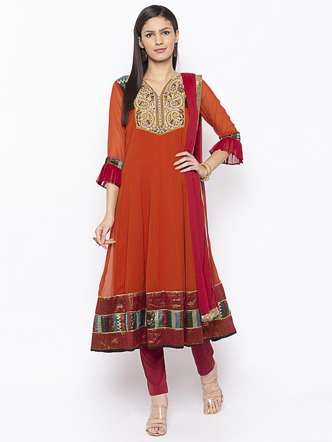 Rust Georgette Kalidar Kurta With Three Fourth Semi Bell Sleeves Thread Embroidered Yoke With Brocade Borders On Empire Line Sleeves Edge And Hemline Of Kurta Worn With Maroon Pants And Maroon Chiffon Dupatta.