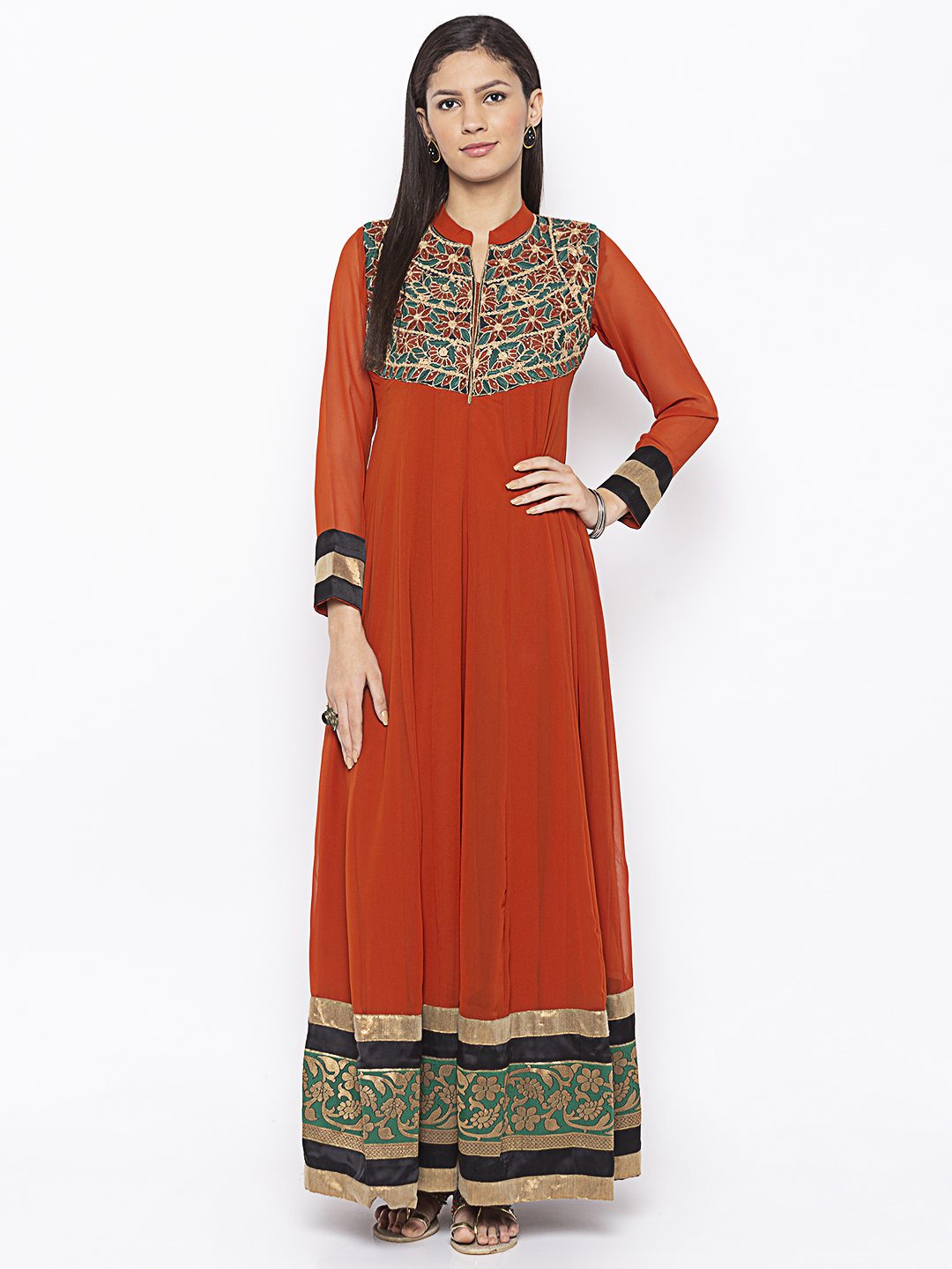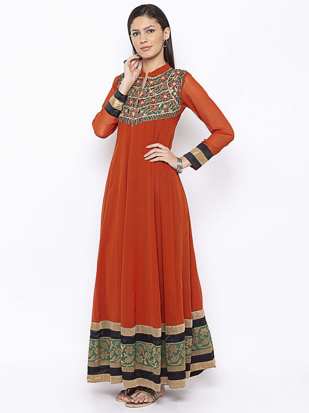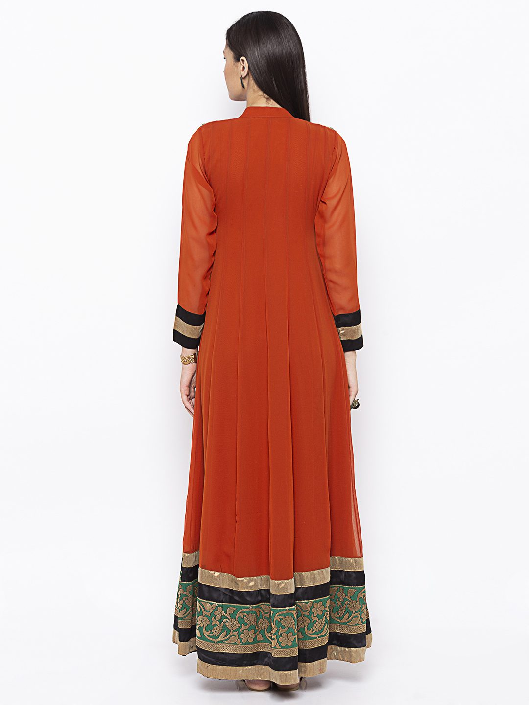 Rust Full Length Kalidar Georgette Kurta With Embroidery Of Swarovski And Resham On Yoke.. Black And Antique Gold Tissue Border Detailing On Full Sleeves With Brocade Detailing Also Added In The Hemline.