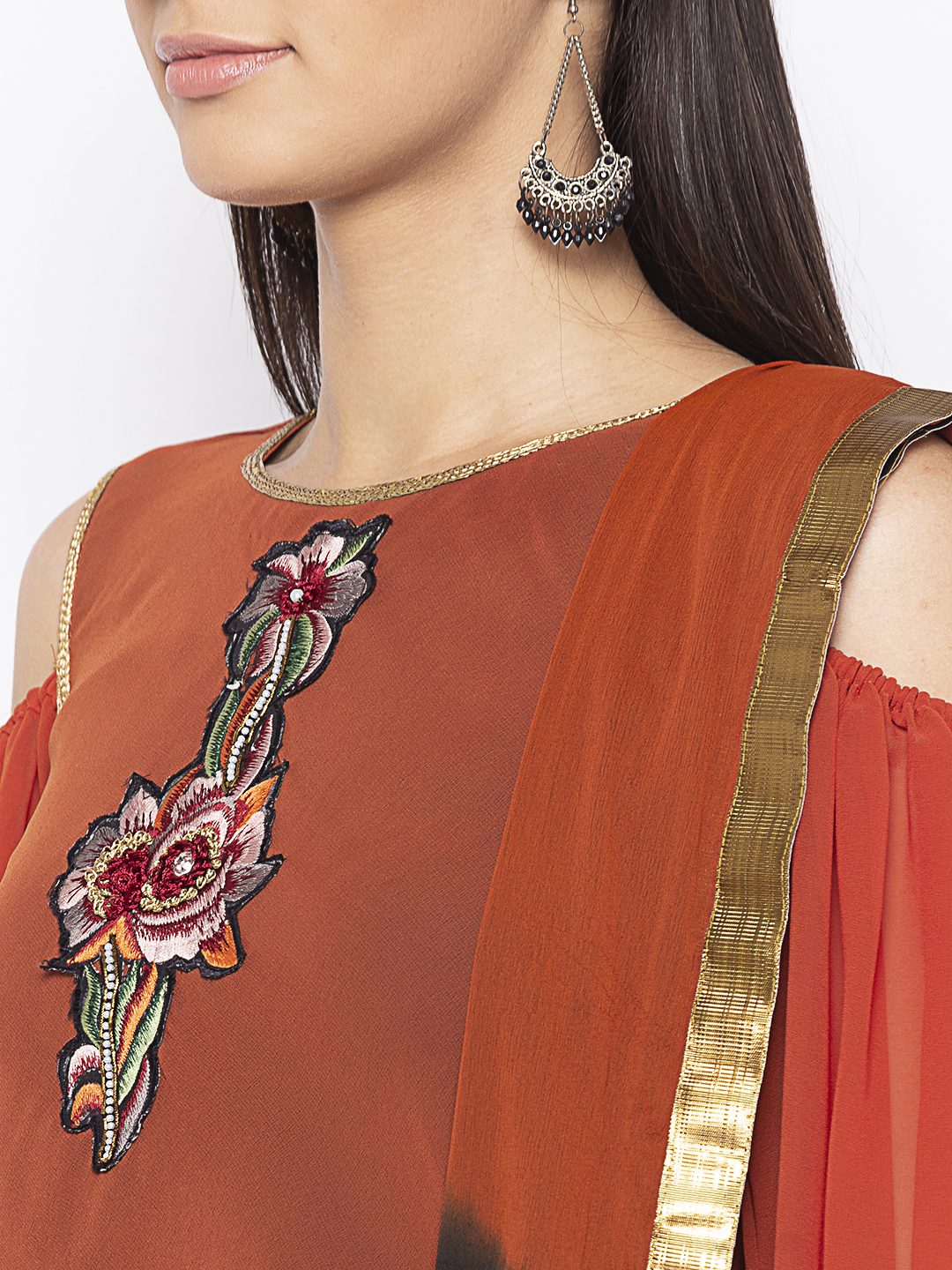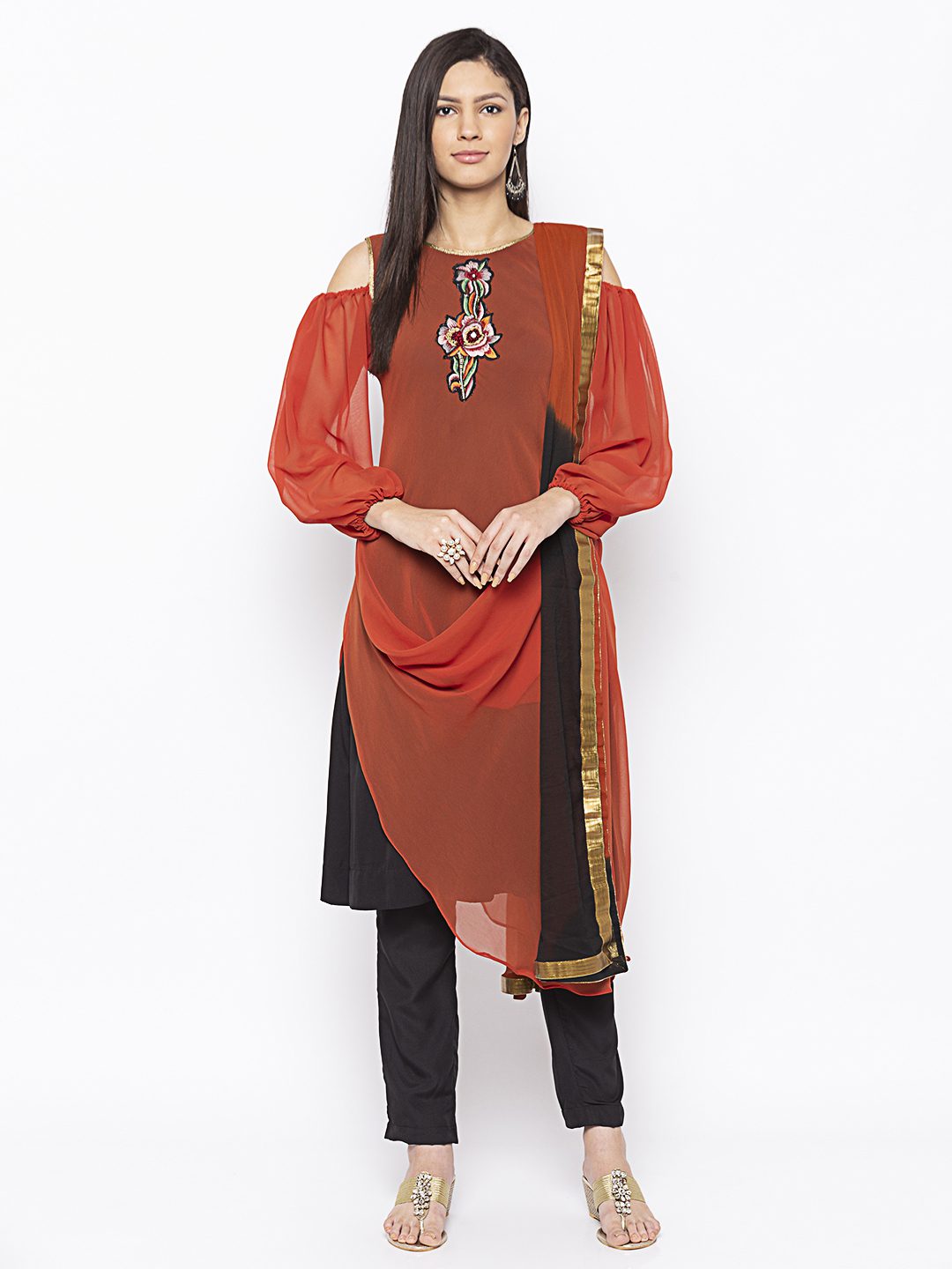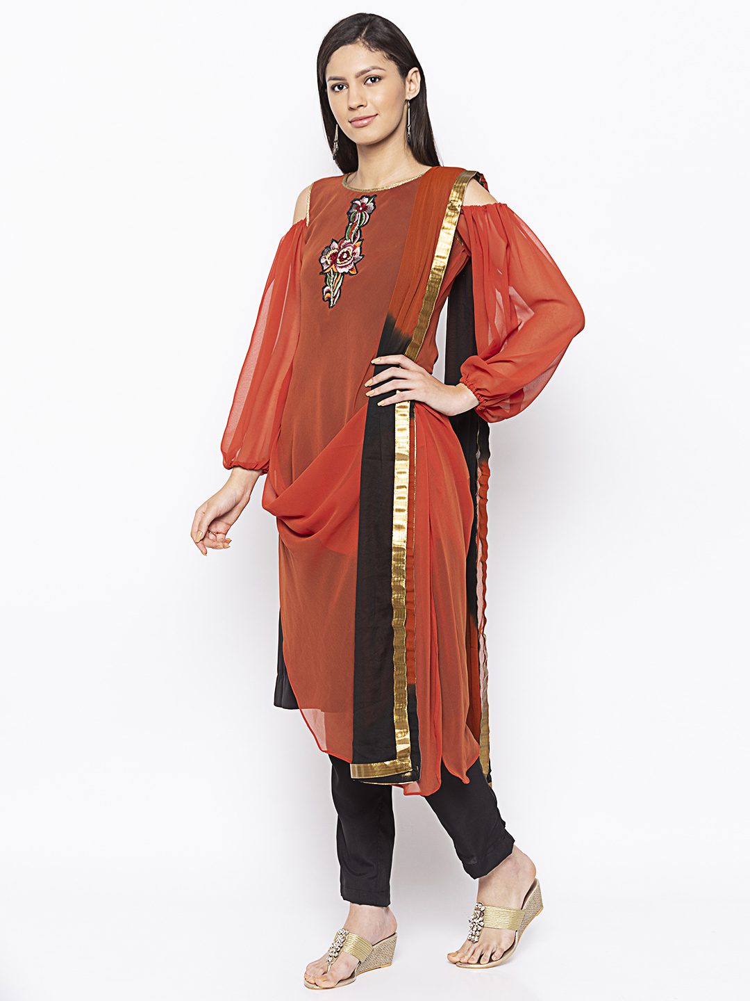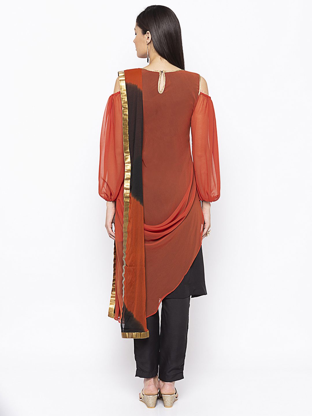 Rust Georgette Drape Style Scowled Kurta With Black American Crepe Inner Having Cold Shoulder Full Sleeves With Hand Embroidery Below Neckline And Gold Detailing On Neck Front And Back And Arm Holes. Worn with Black Cigarette Pants and Rust Black Shaded Dupatta with Gold Border.