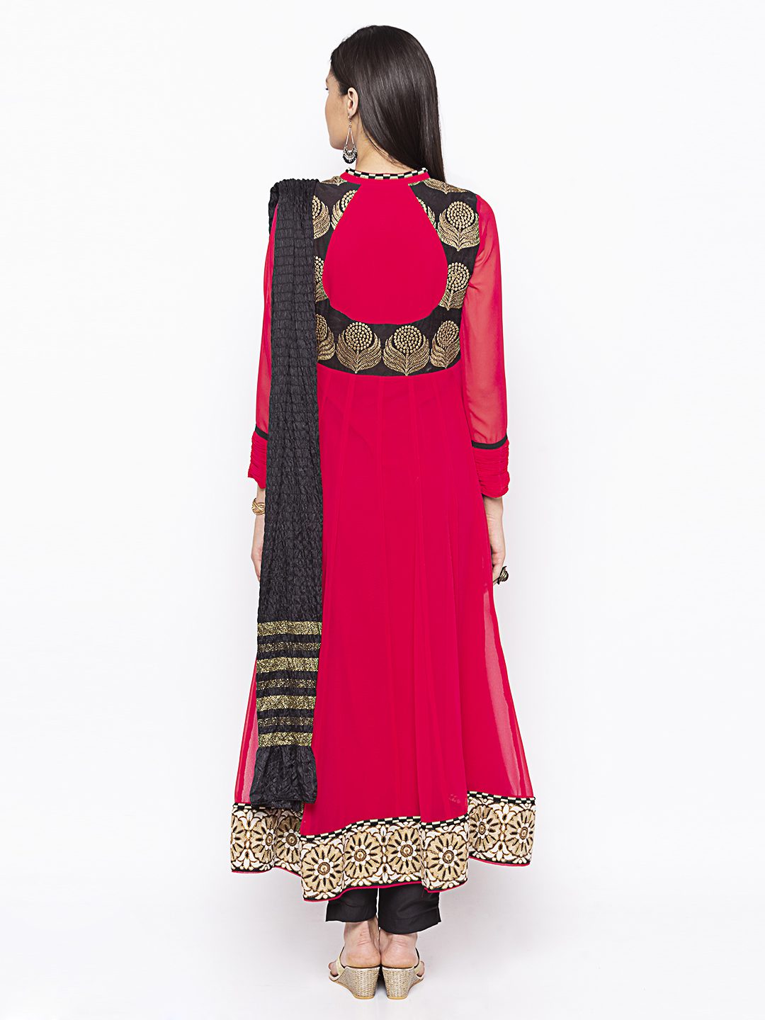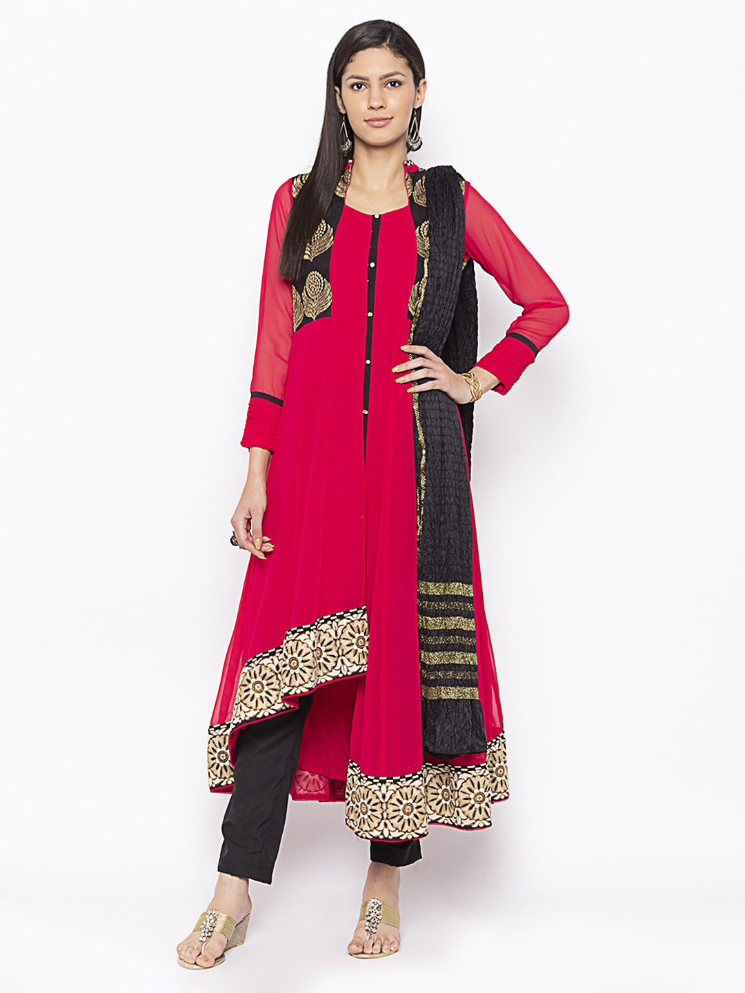 Rani Pink Asymmetrical Georgette Kalidar Kurta With Black Gold Embroidered Half Body.. Black Piping On Centre Panel With Embroidery Of Beige.. Off White And Antique Gold On Hemline Having Full Sleeves With Ruched Georgette Detailing On Edge. Worn With Black Cigarette Pants And Black Zari Work Dupatta