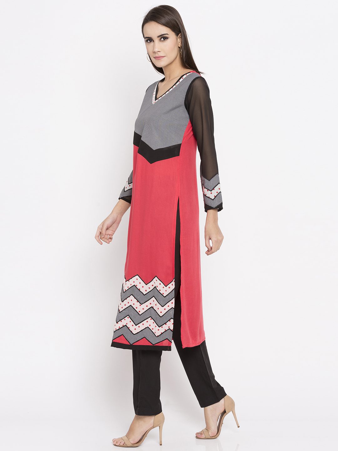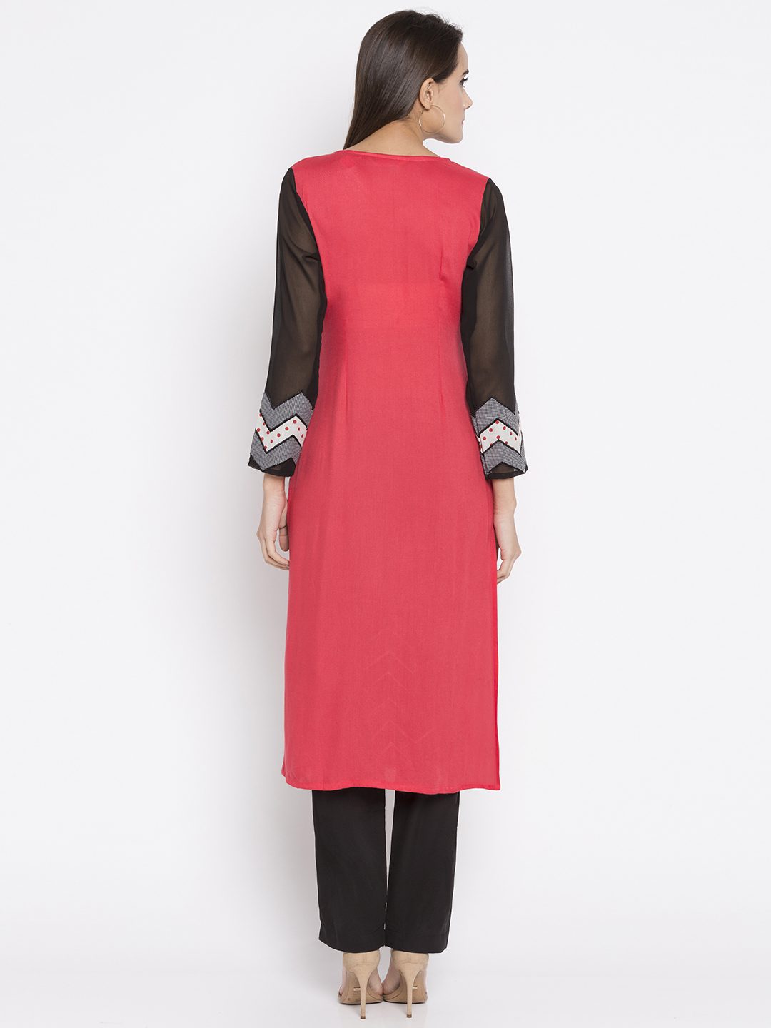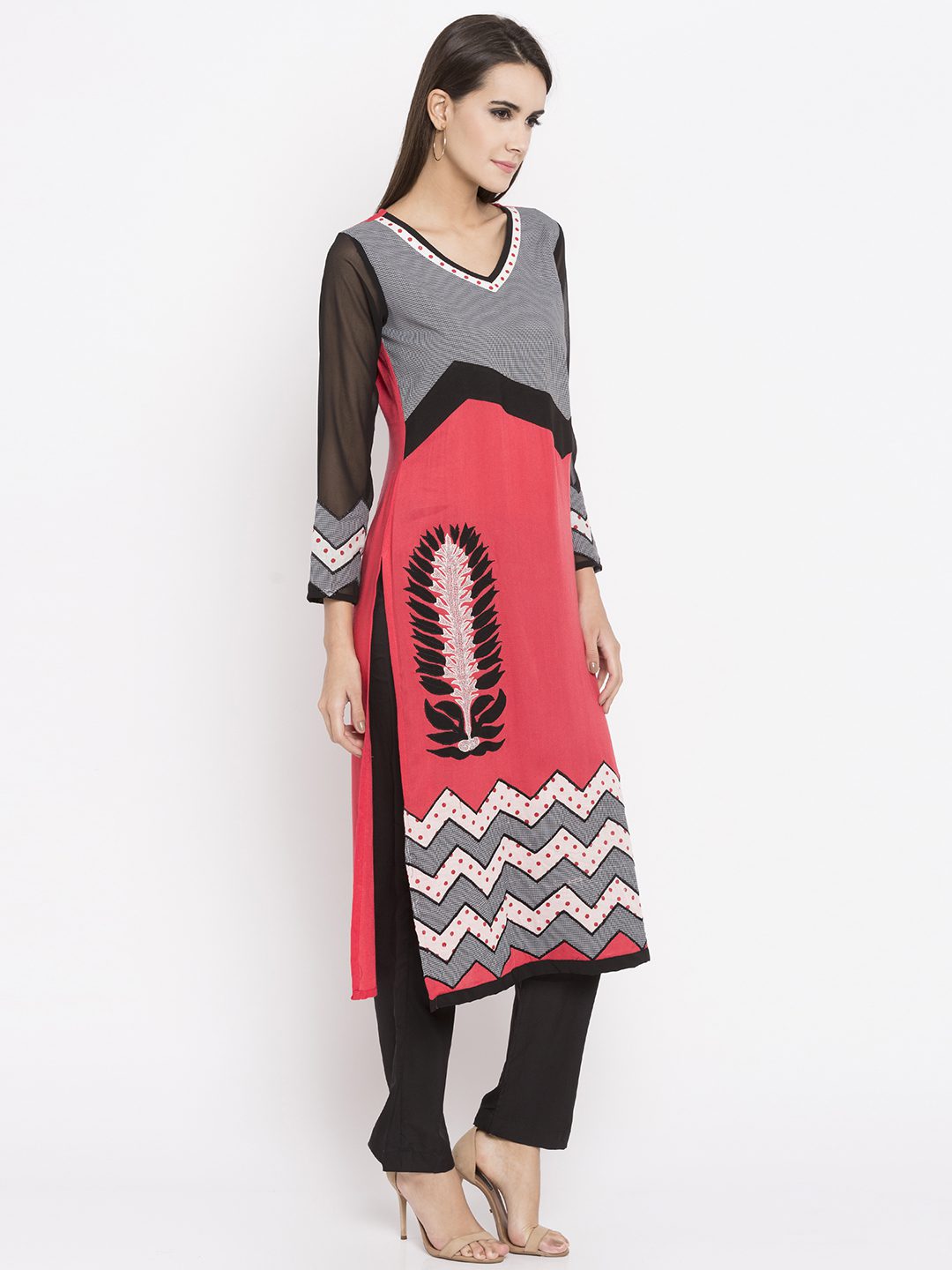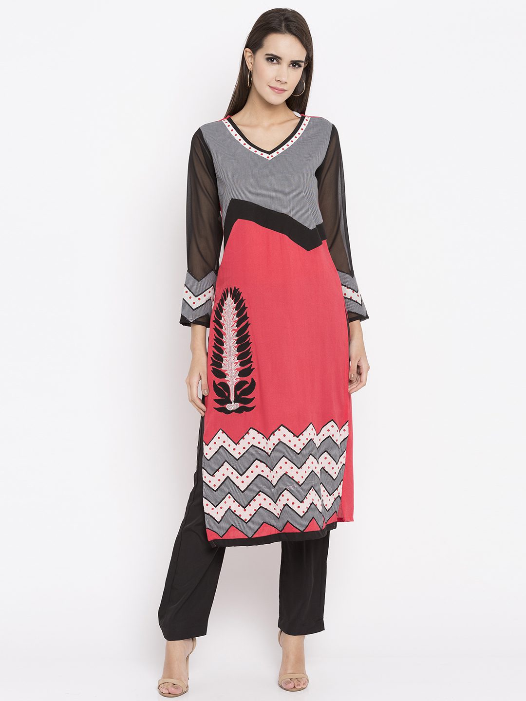 Coral peach straight cut readymade kameez in cotton designed with striking print detailing enhanced by embroidery work at the front .with Black Pant.