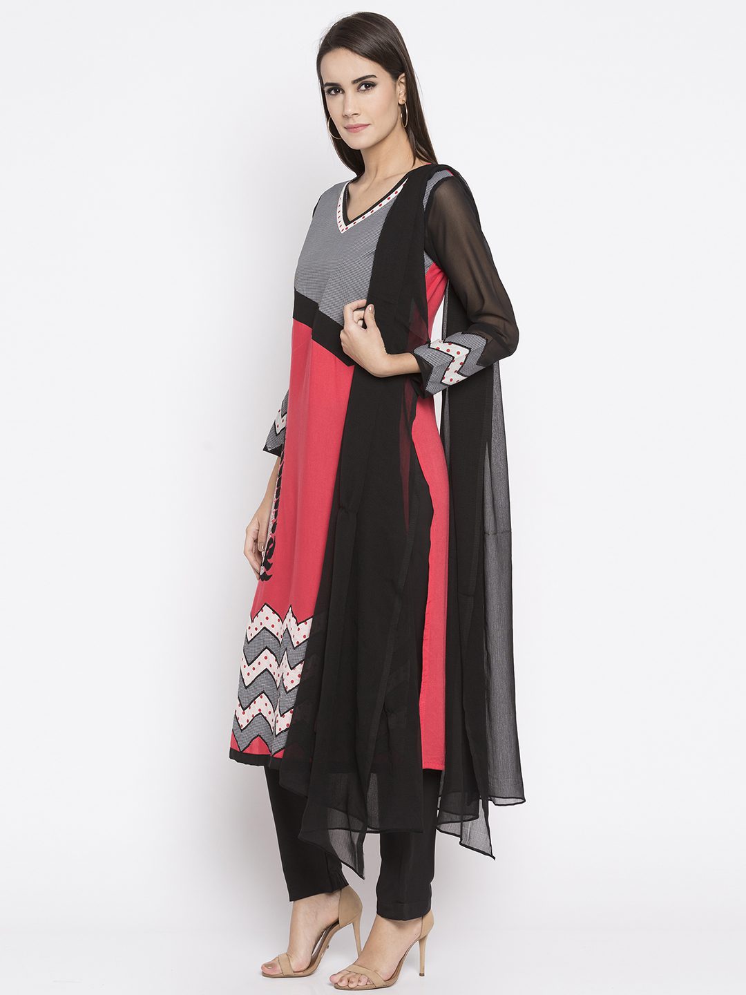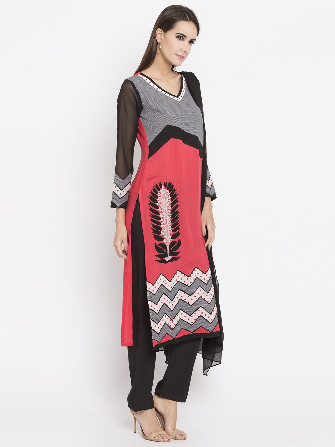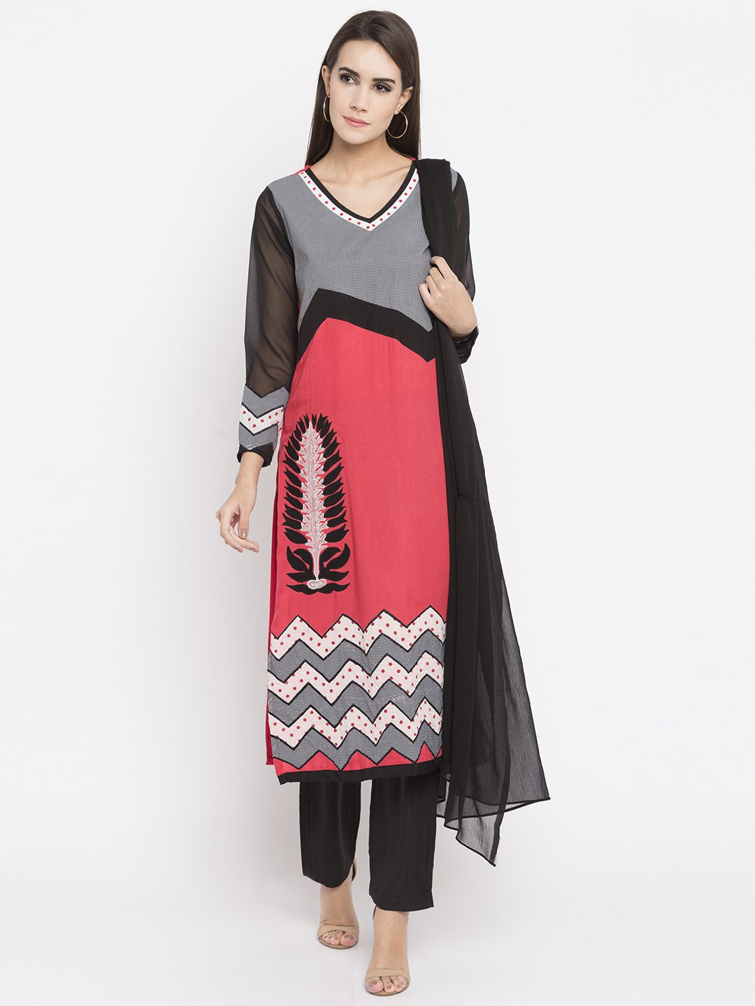 Coral peach straight cut readymade kameez in cotton designed with striking print detailing enhanced by embroidery work at the front. Accompanied by a plain crape silk pant and a chiffon dupatta, both in black color.