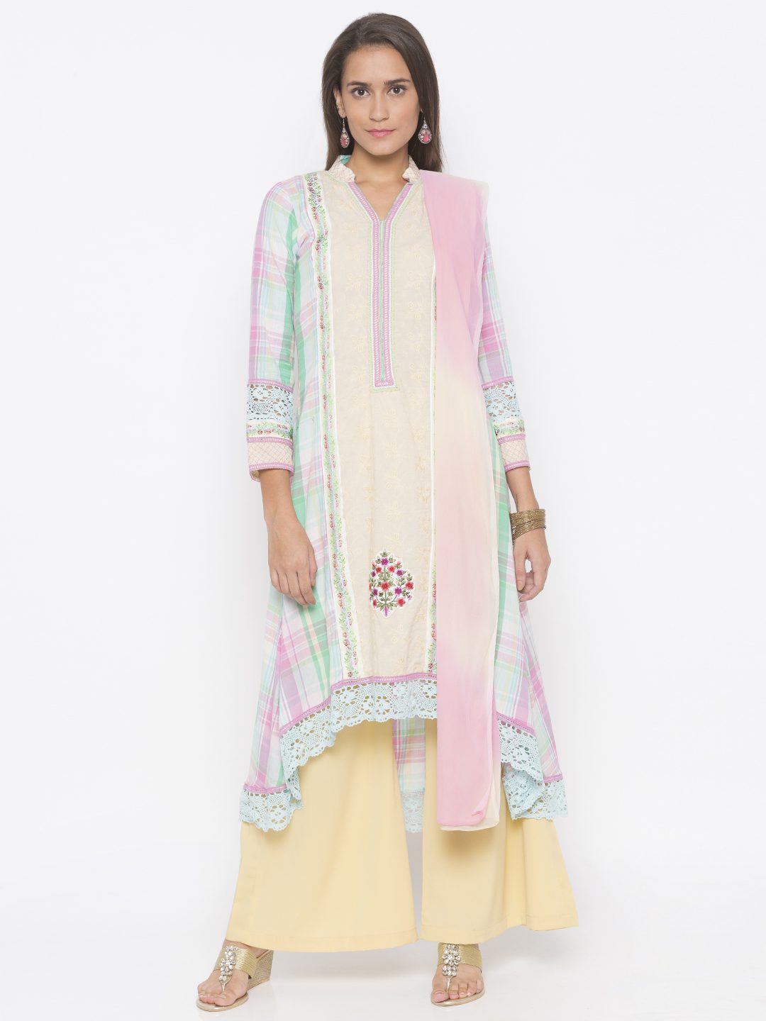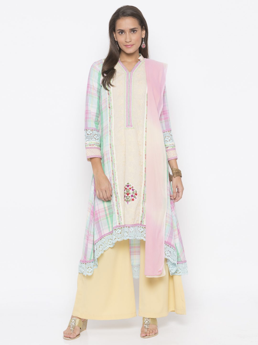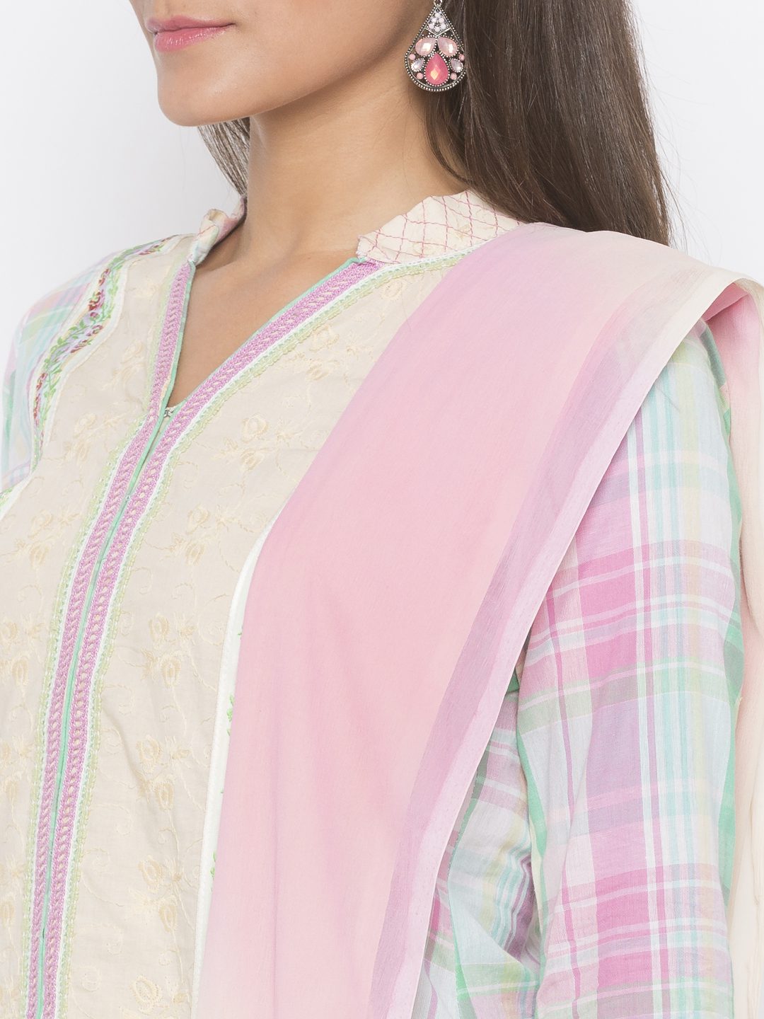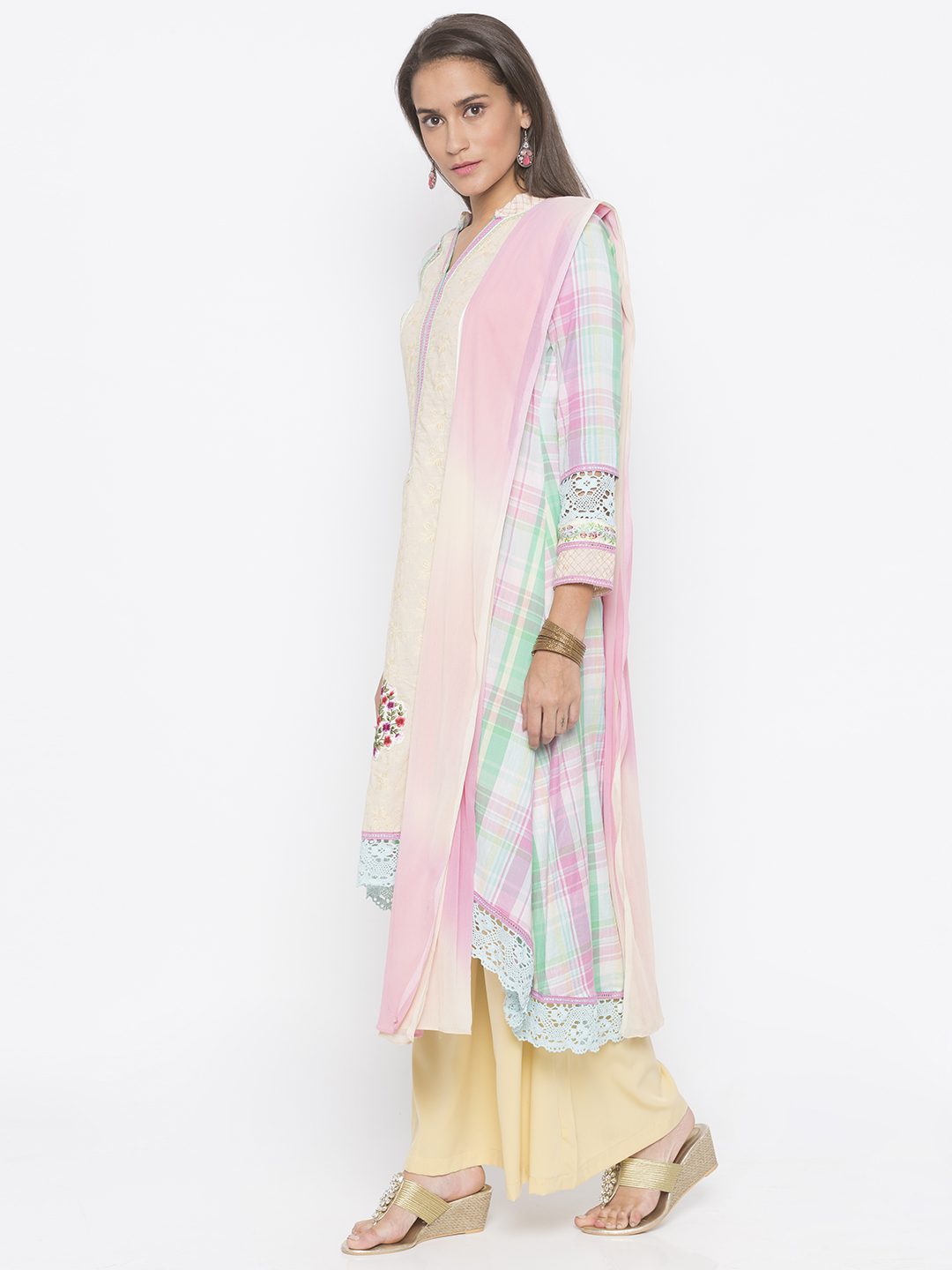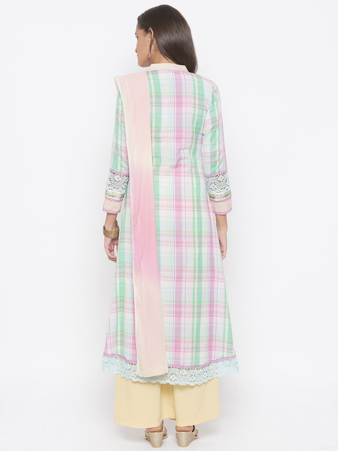 Dark Cream Hakoba Embroidered And Tartan Checks Pink Green Cotton Asymmetrical Kurta With Thick Crochet Lace Detailing And Embroidered Border On Front Panels Hemline And Full Sleeves Having Embroidered Motif In Hemline With Double Stitches Of Contrast On Half Chinese Collar And Sleeves Edge Worn With Cream Palazzo And Cream Pink Shaded Chiffon Dupatta