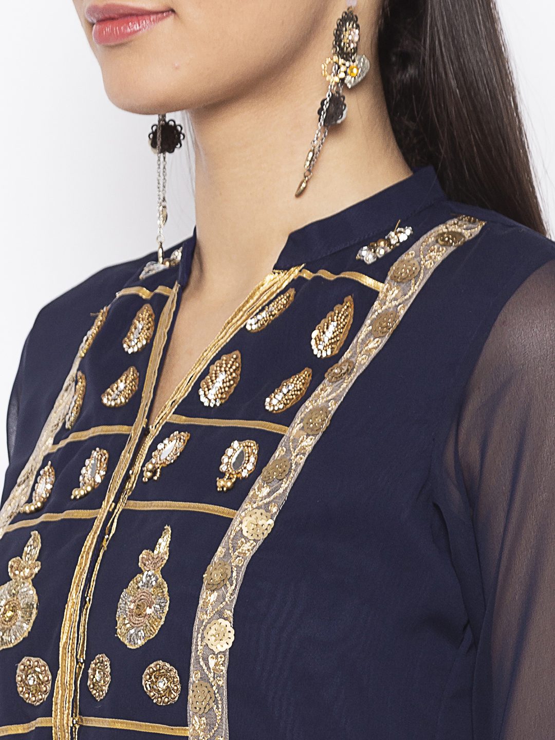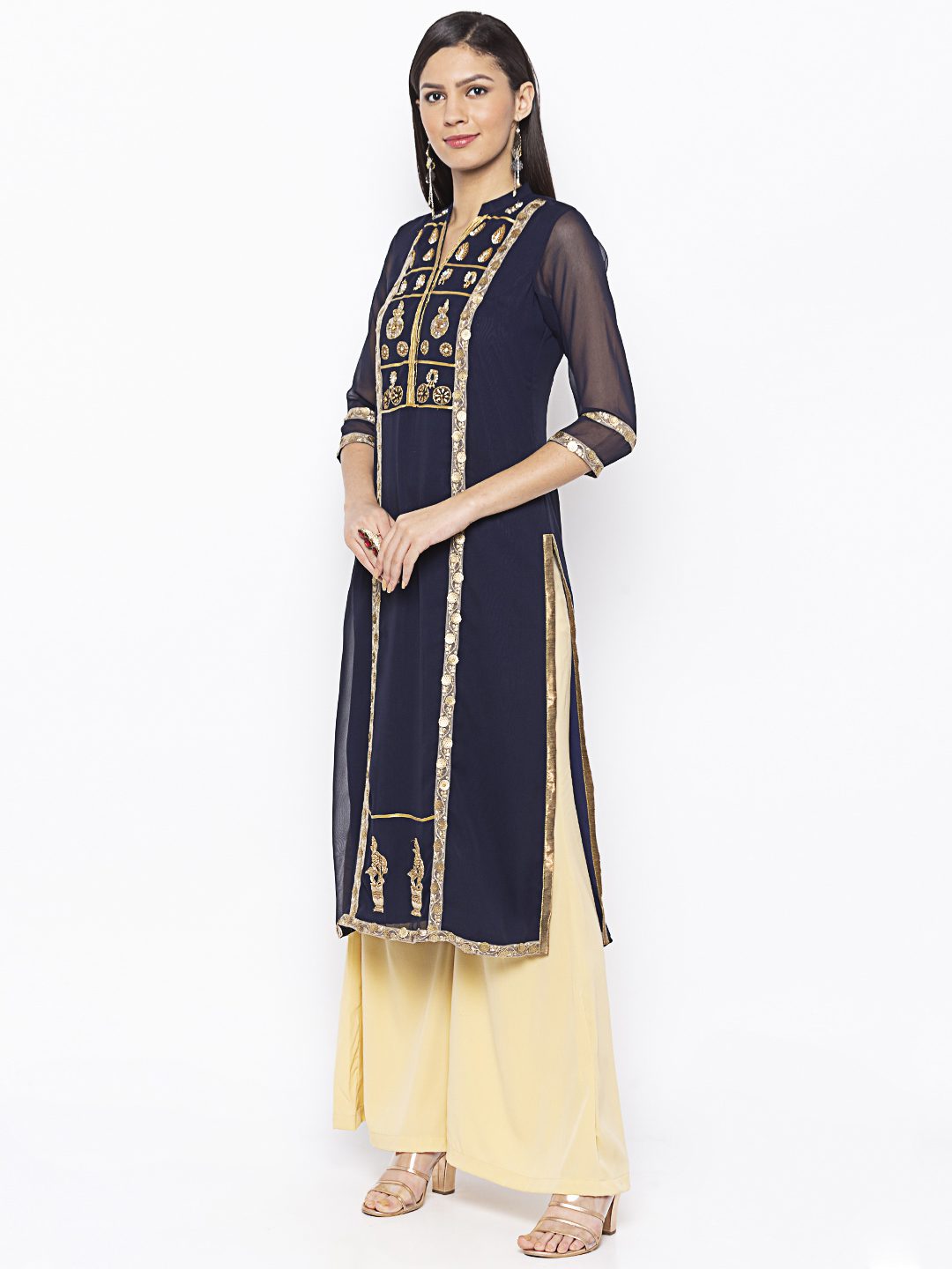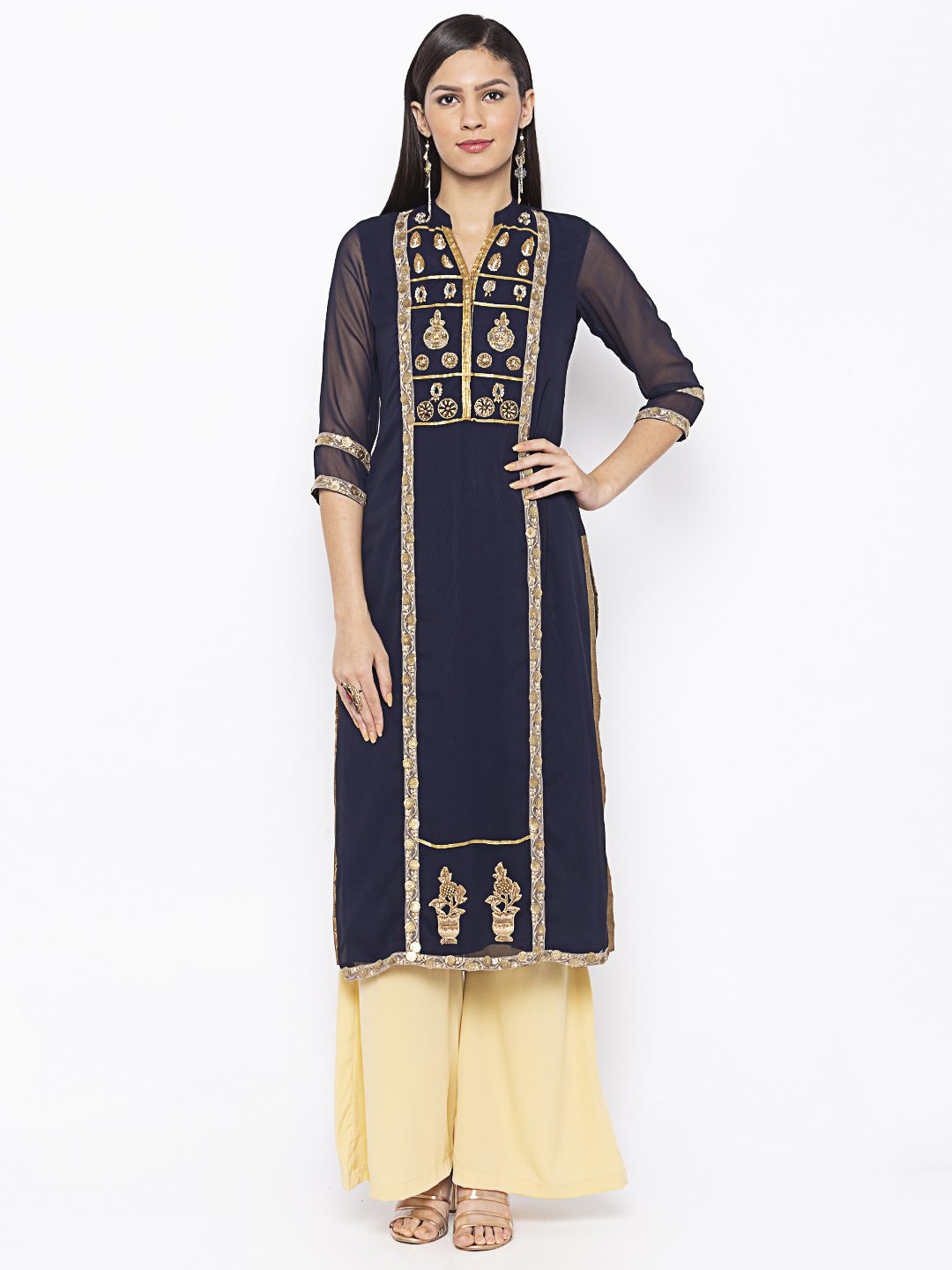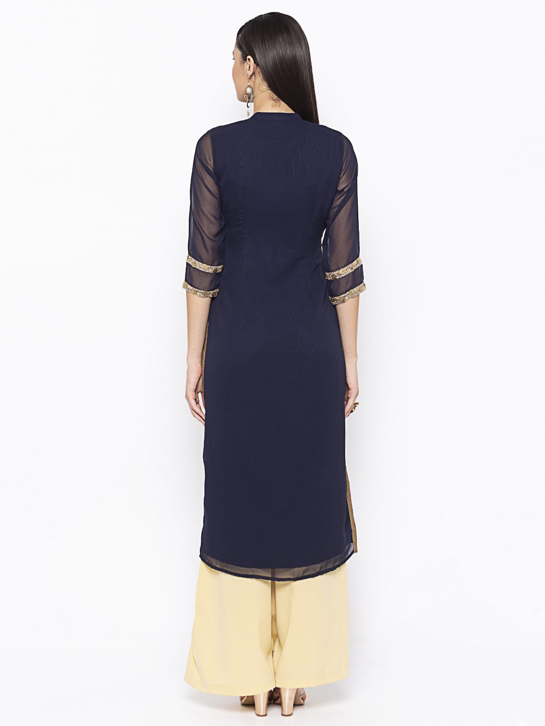 Navy Blue Georgette Straight Cut Kurta With Sheer Three Quarter Sleeve Embroidered Gold Yoke Around Neck With Gold Borders On Sides Of Centre Panel And Gold Motifs On Hemline And Sleeves Edge Having Antique Gold Tissue Pipins On Side Slits. Worn With Cream Palazzo.
