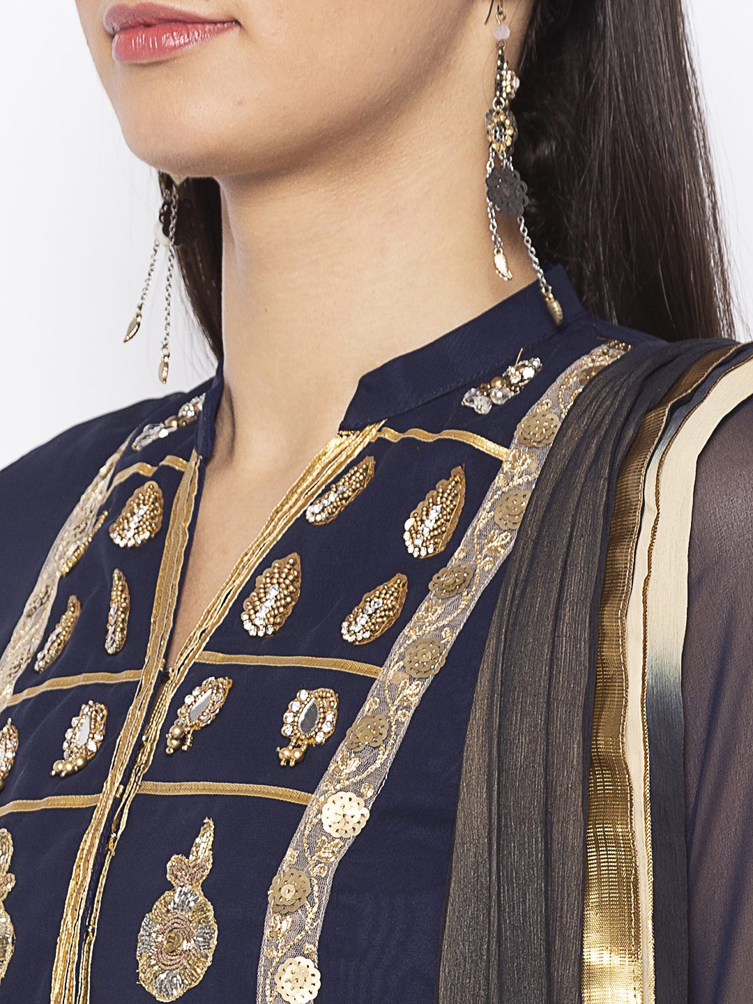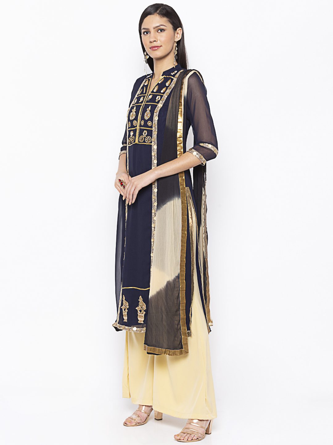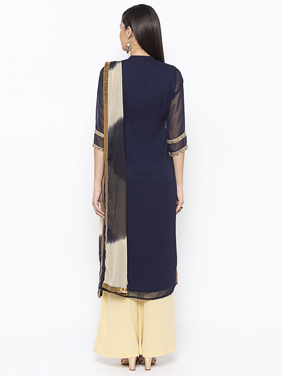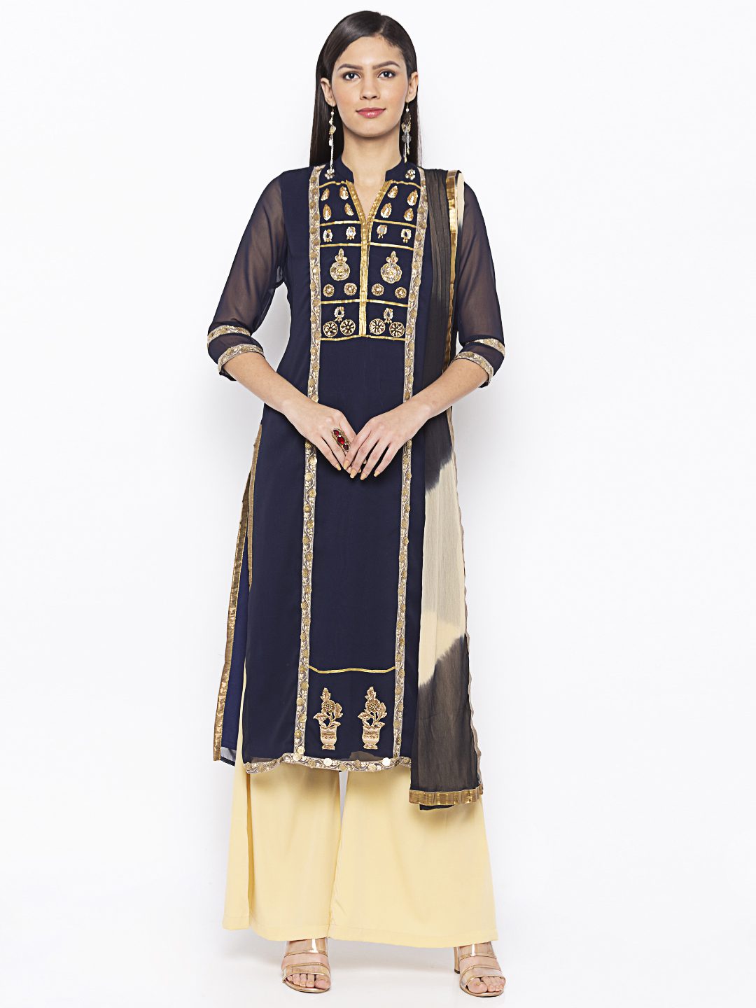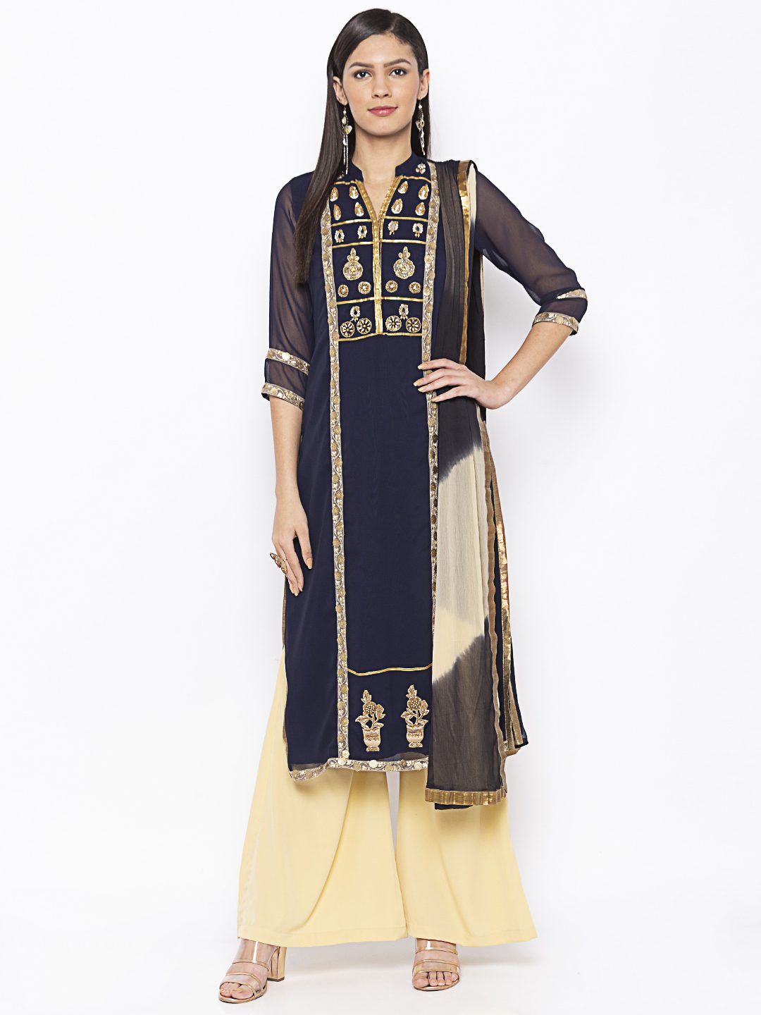 Navy Blue Georgette Straight Cut Kurta With Sheer Three Quarter Sleeve Embroidered Gold Yoke Around Neck With Gold Borders On Sides Of Centre Panel And Gold Motifs On Hemline And Sleeves Edge Having Antique Gold Tissue Pipins On Side Slits. Worn With Crème Palazzo And Crème Black Shaded Dupatta With Borders On All Sides.