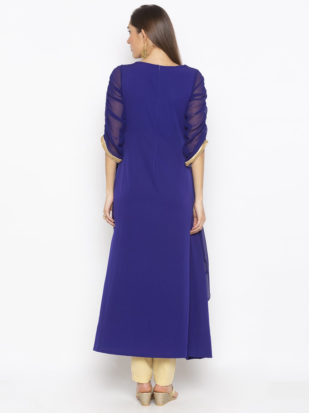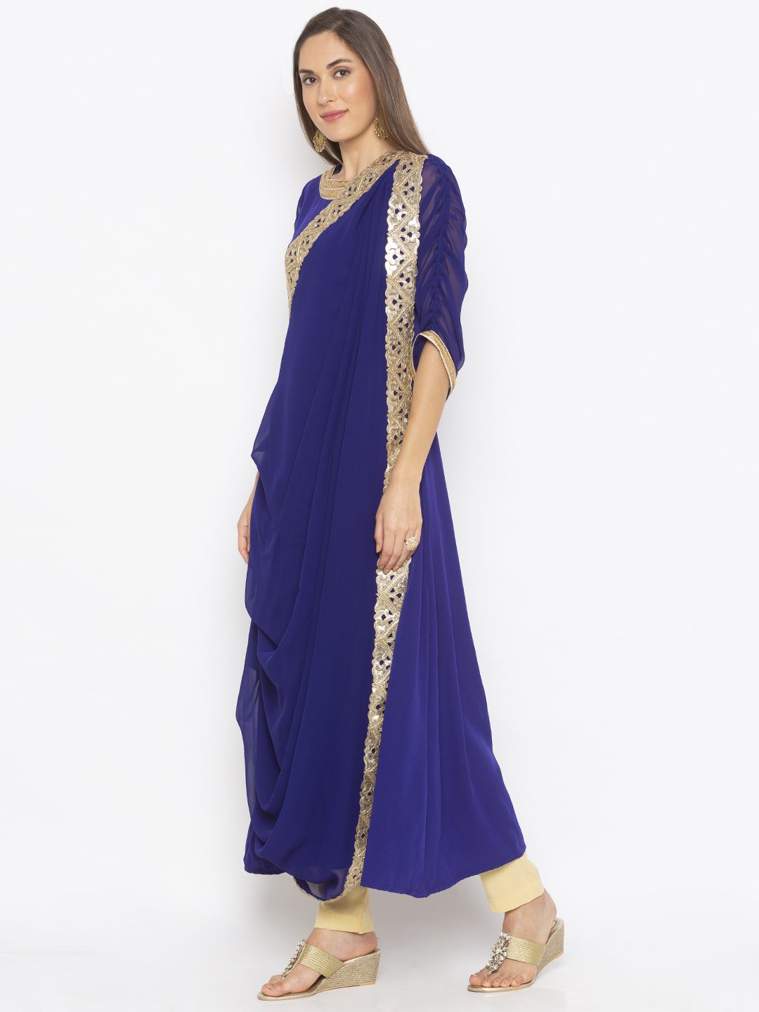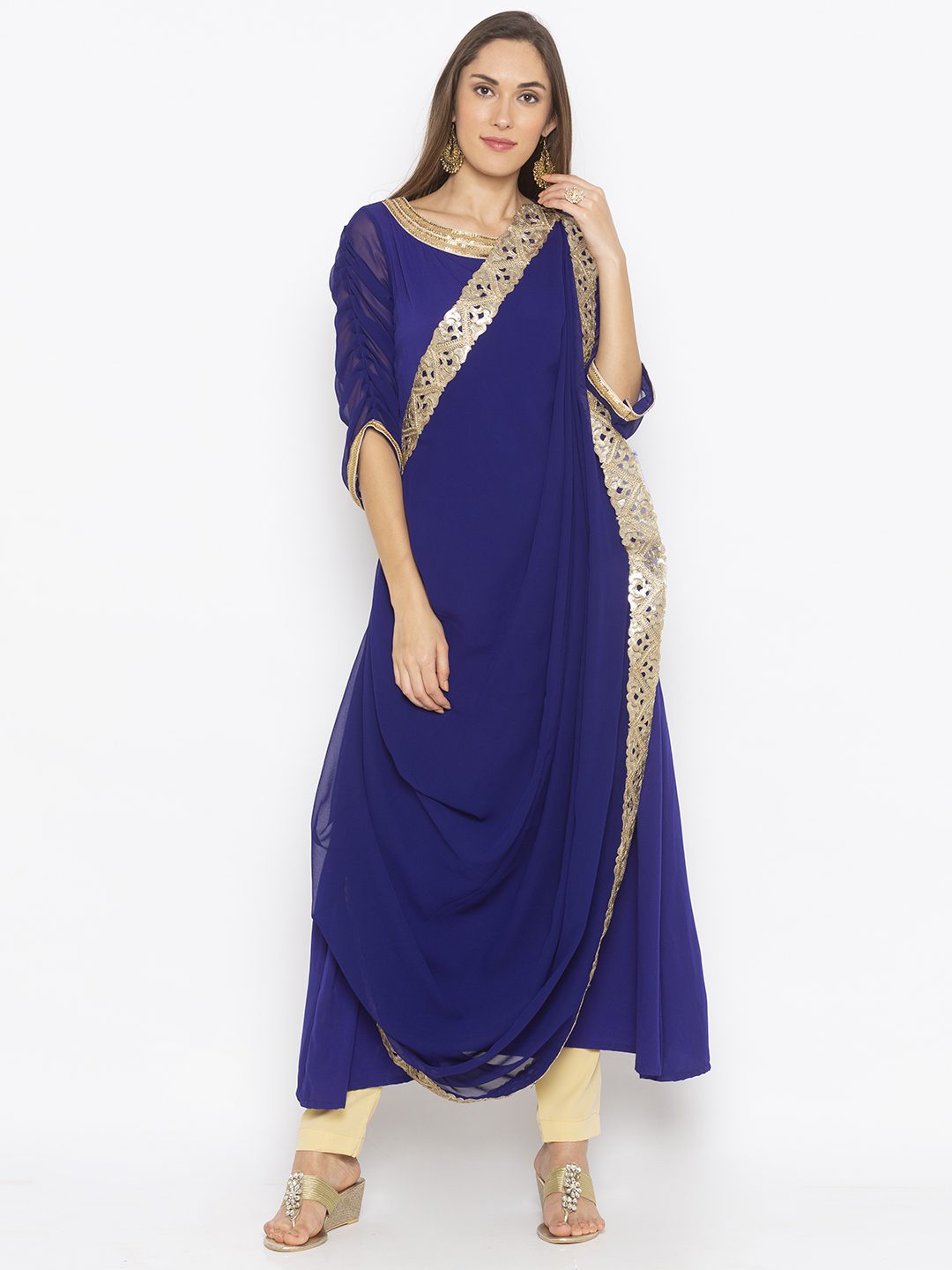 Royal Blue Georgette And American Crepe Combination Drape Styled Kurta With Embroidery Around Boat Neck And Embroidered Border On The Drift Front Overlap Having Three Quarter Gathered Detailing Sleeves With Embroidery On Edge Of It. Paired with Beige Cigarette Pants.