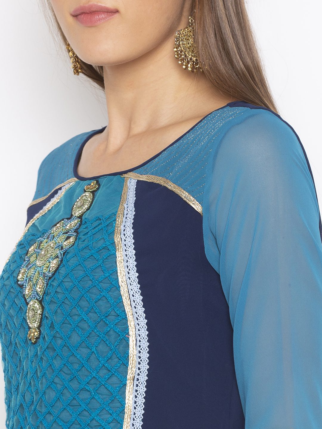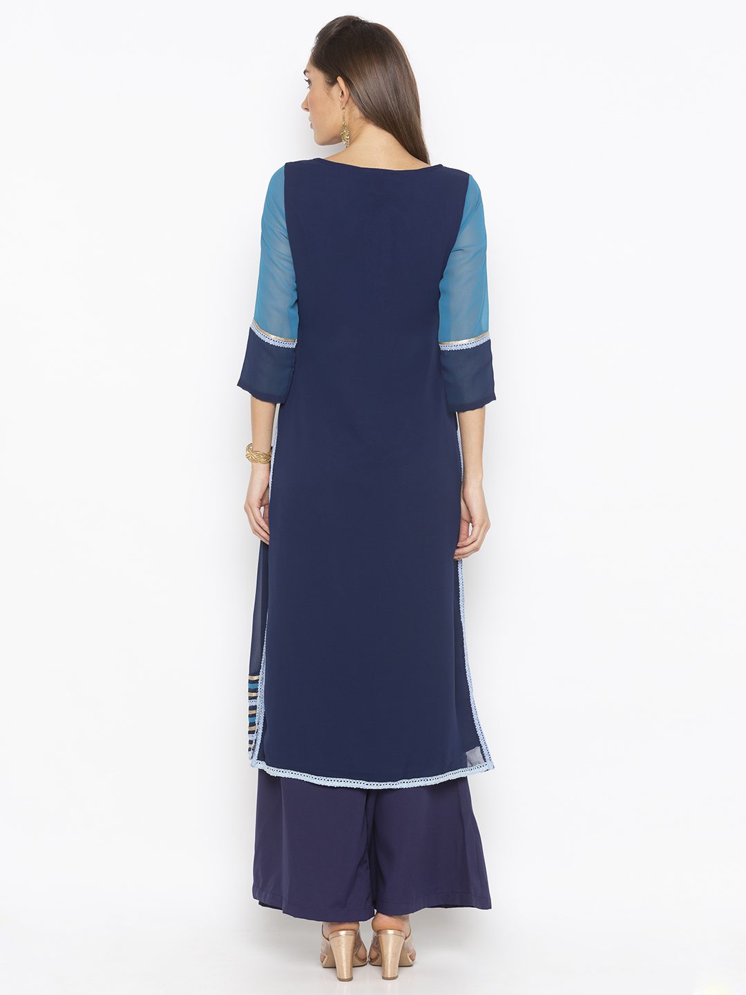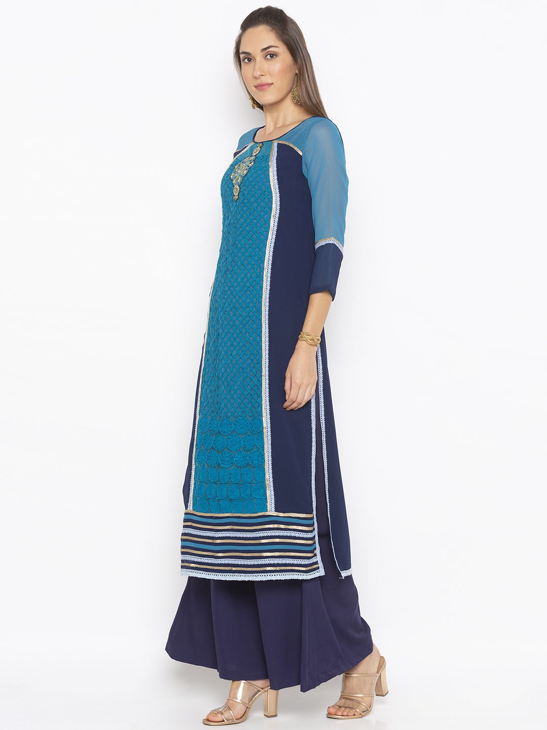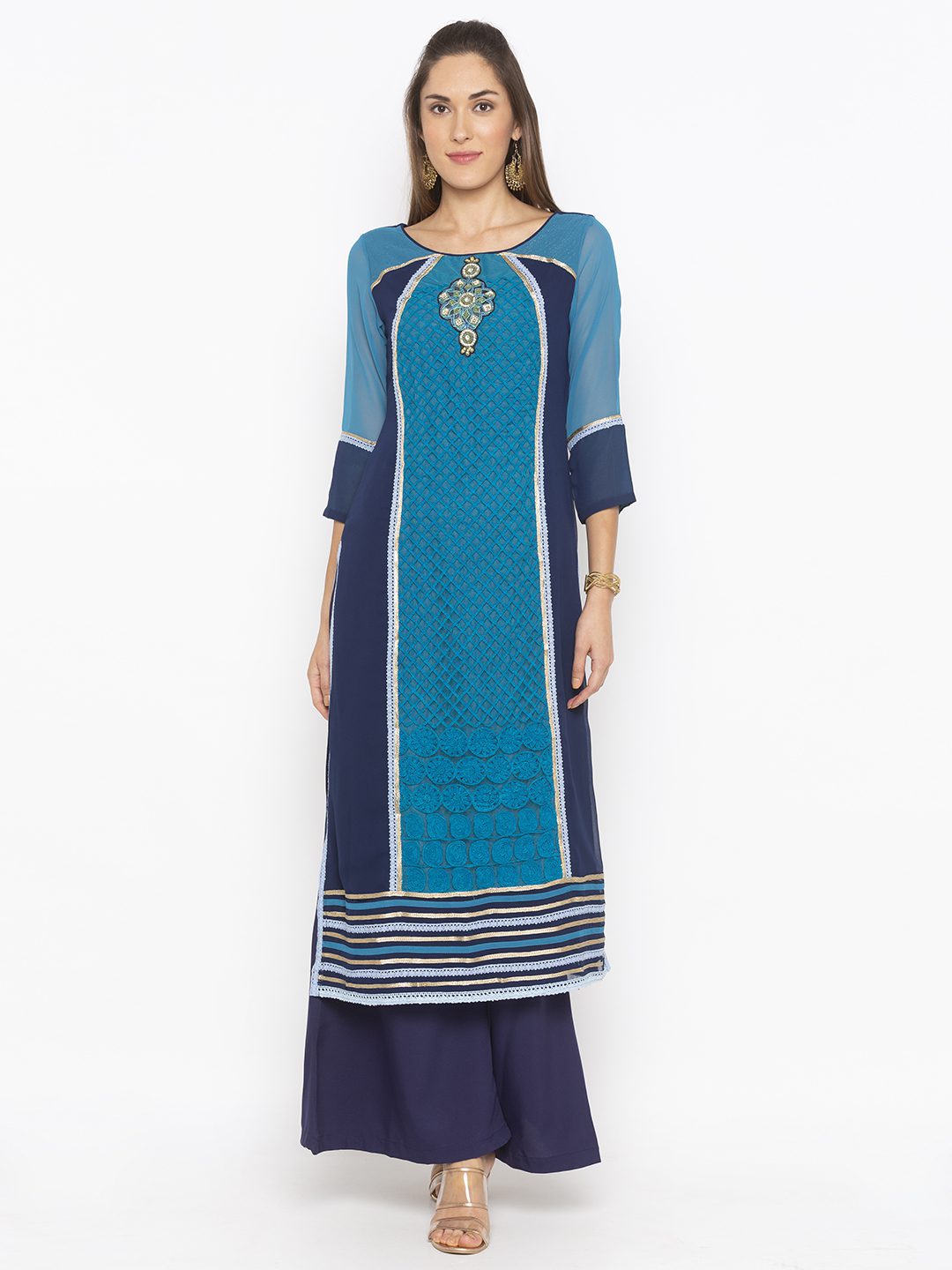 Navy Blue Georgette And Blue Embroidered Net Combo Straight Cut Kurta With Gold Zari Detailing On Shoulders ..Hand Embroidered Beadwork Below Neck With Crochet And Gold Zari Lace Detailing On Front Panel .Side Slits And Hemline.. Two Colour Combo Three Fourth Sleeve. Paired With Navy Blue Palazzo.