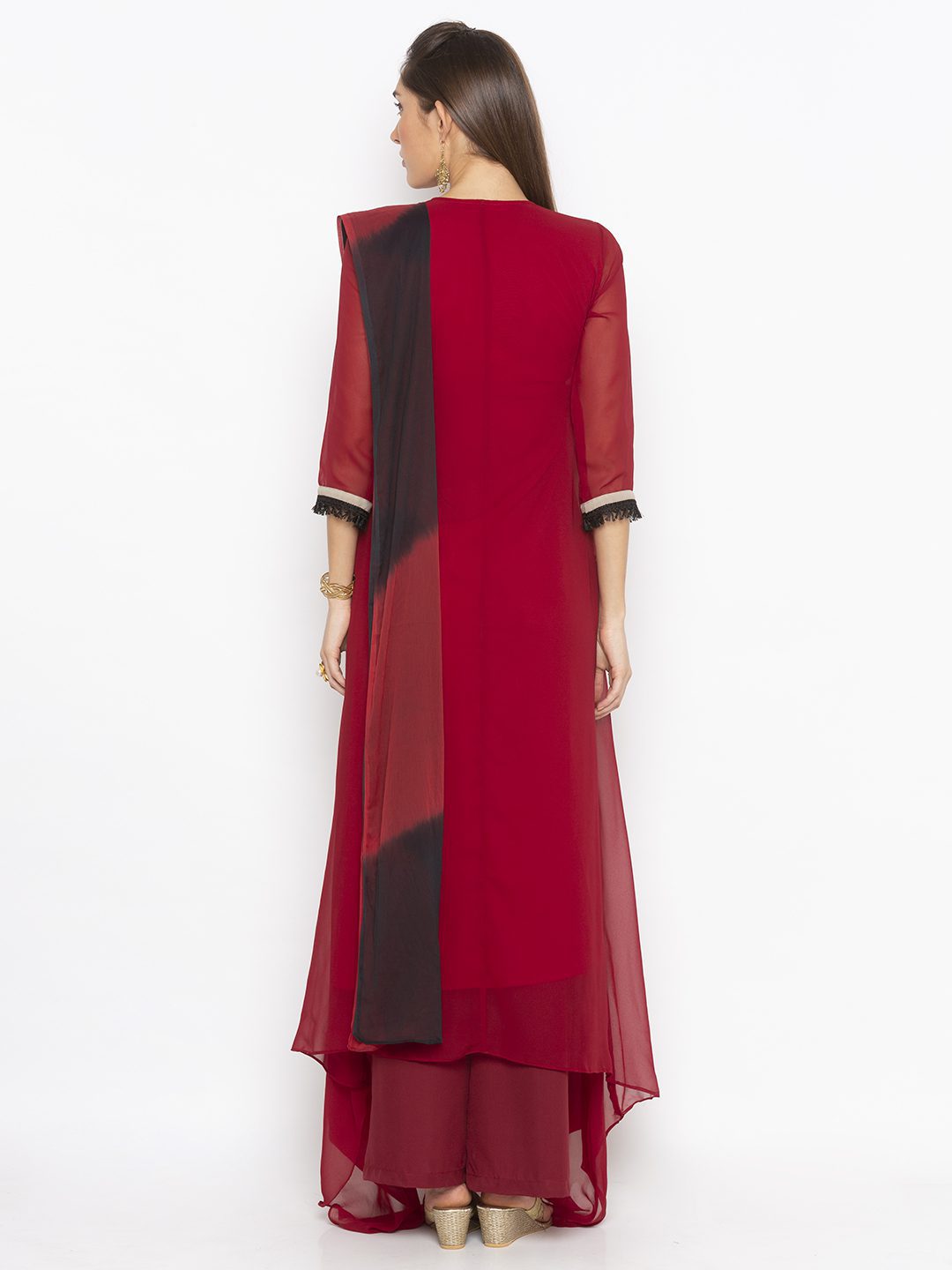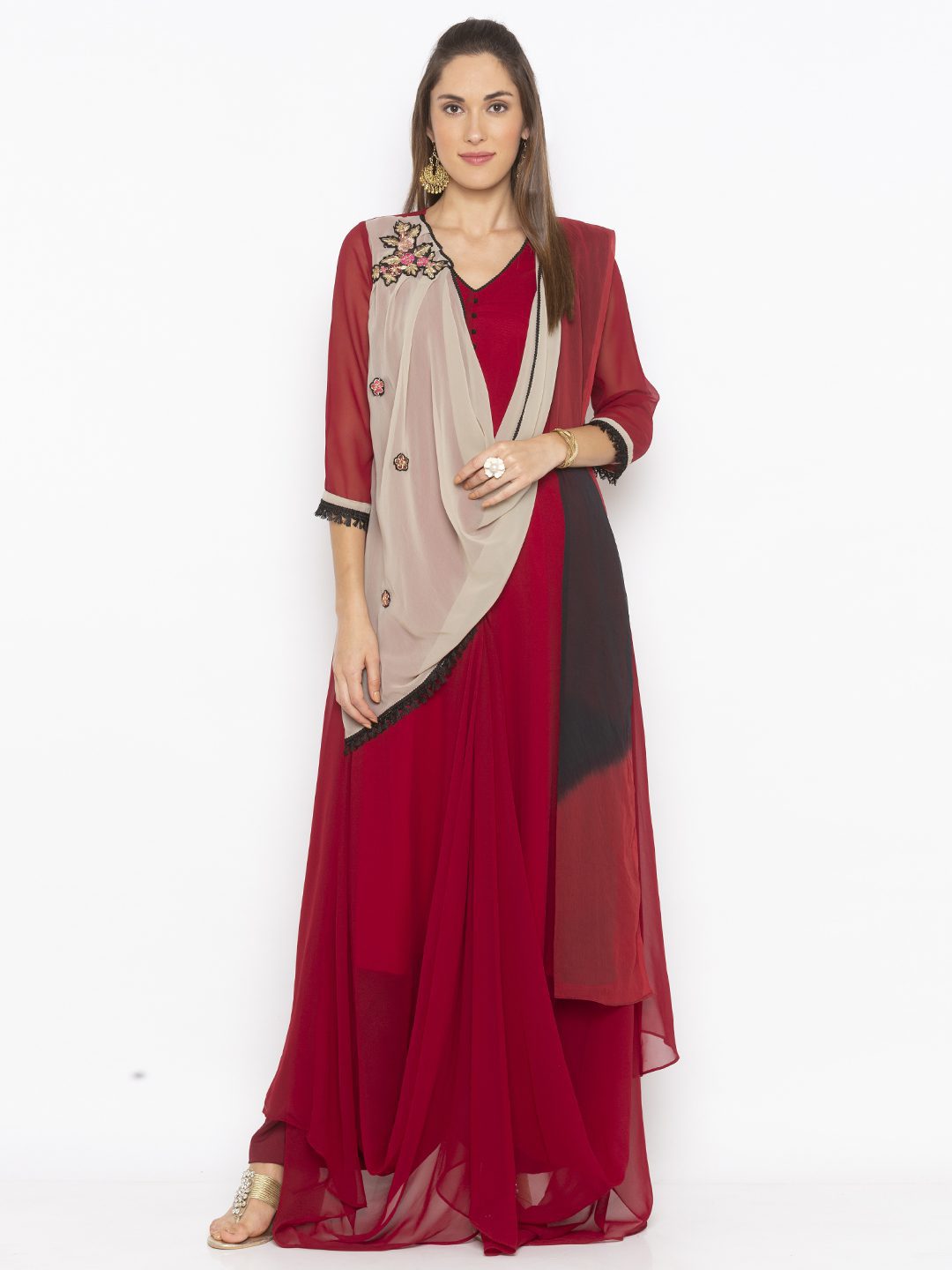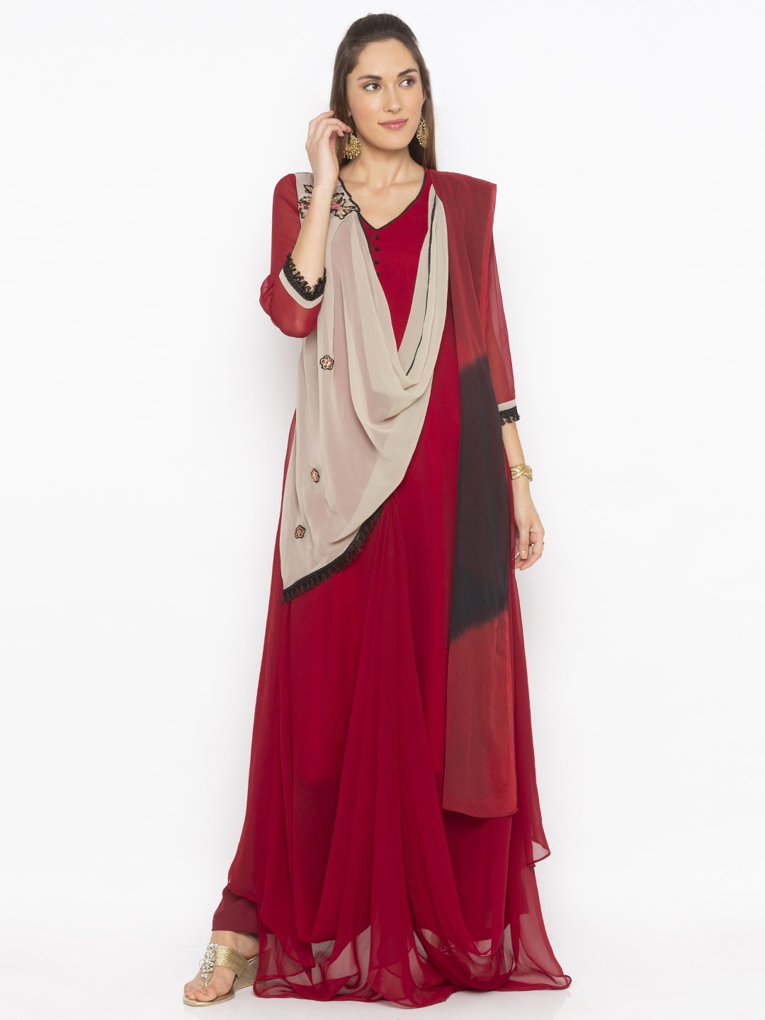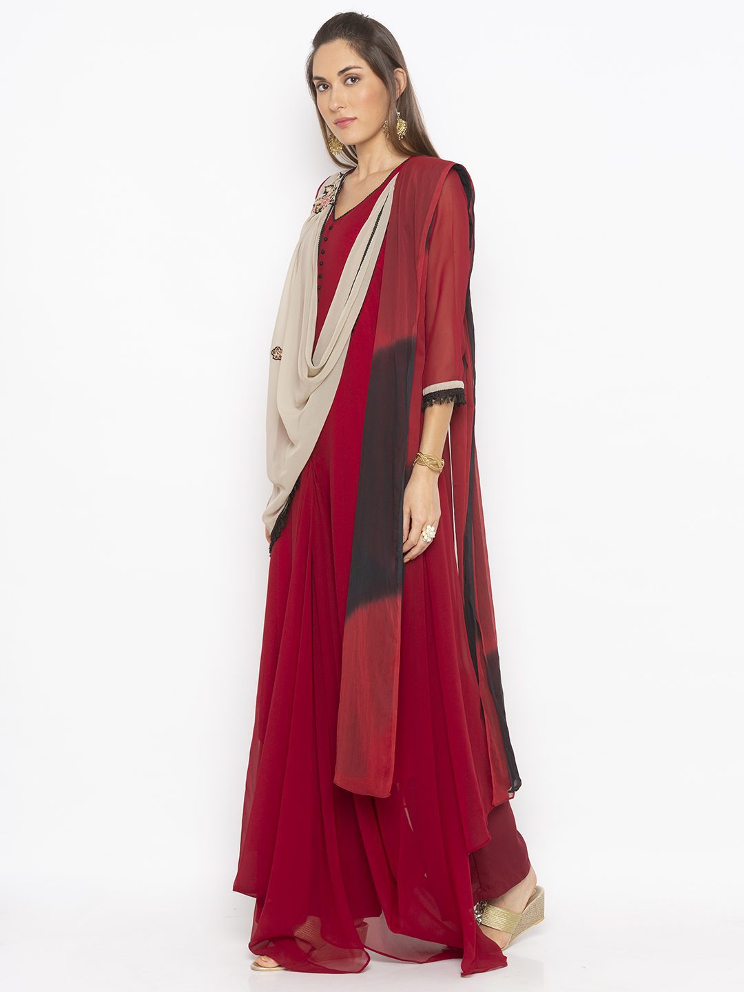 Maroon Georgette Indo Western Dress Style Long Kurta With Three Quarter Sleeves Dark Cream Pleated Drape Around The Neckline With Multicolor Thread And Gold Embroidery On It Edged With Black Tasseled Lace Also Worn With Maroon Cigarette Pants And Maroon And Black Shaded Dupatta.