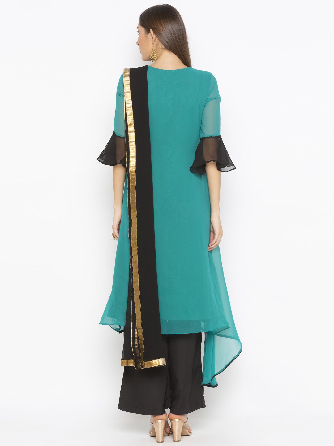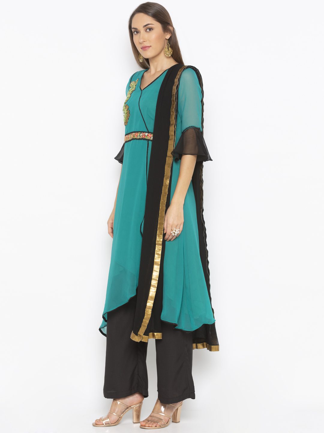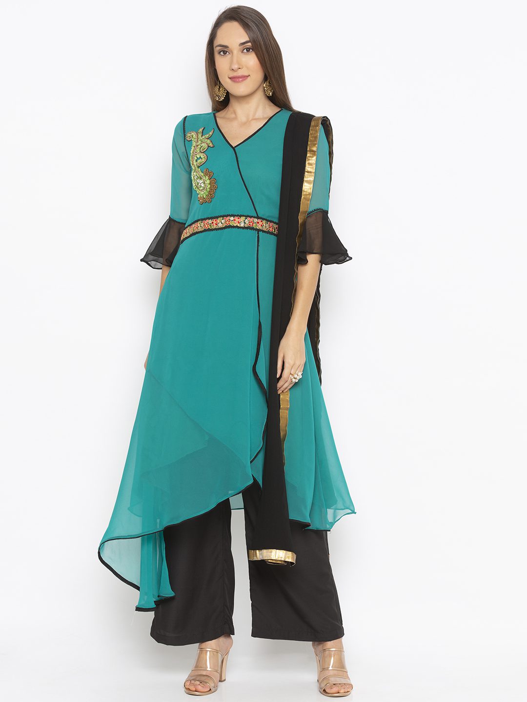 Turquoise Green Georgette Asymmetrical Overlapped Style Kurta With Three Quarter Bell Sleeves Embroidered Motif On Neckline And Waist With Black Edging In Front And Hemline Worn With Black Culottes And Black Chiffon Dupatta With Gold Border On It