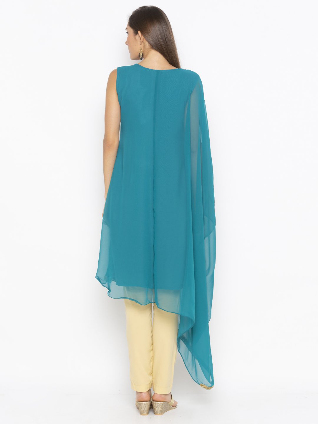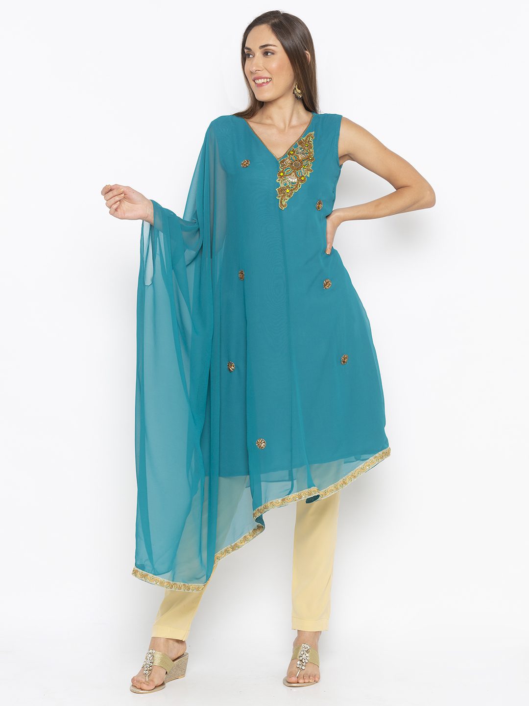 Turquoise Blue Georgette Asymmetrical Kaftan Style Kurta With Antique Gold Zardozi On Front With Gold Embroidered Border In The Hemline.