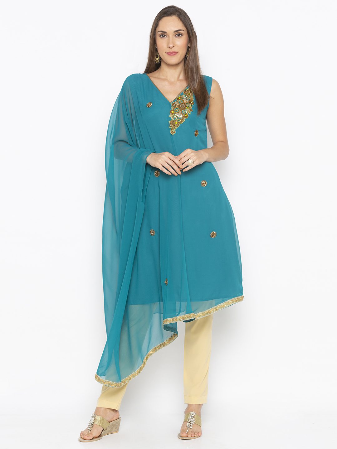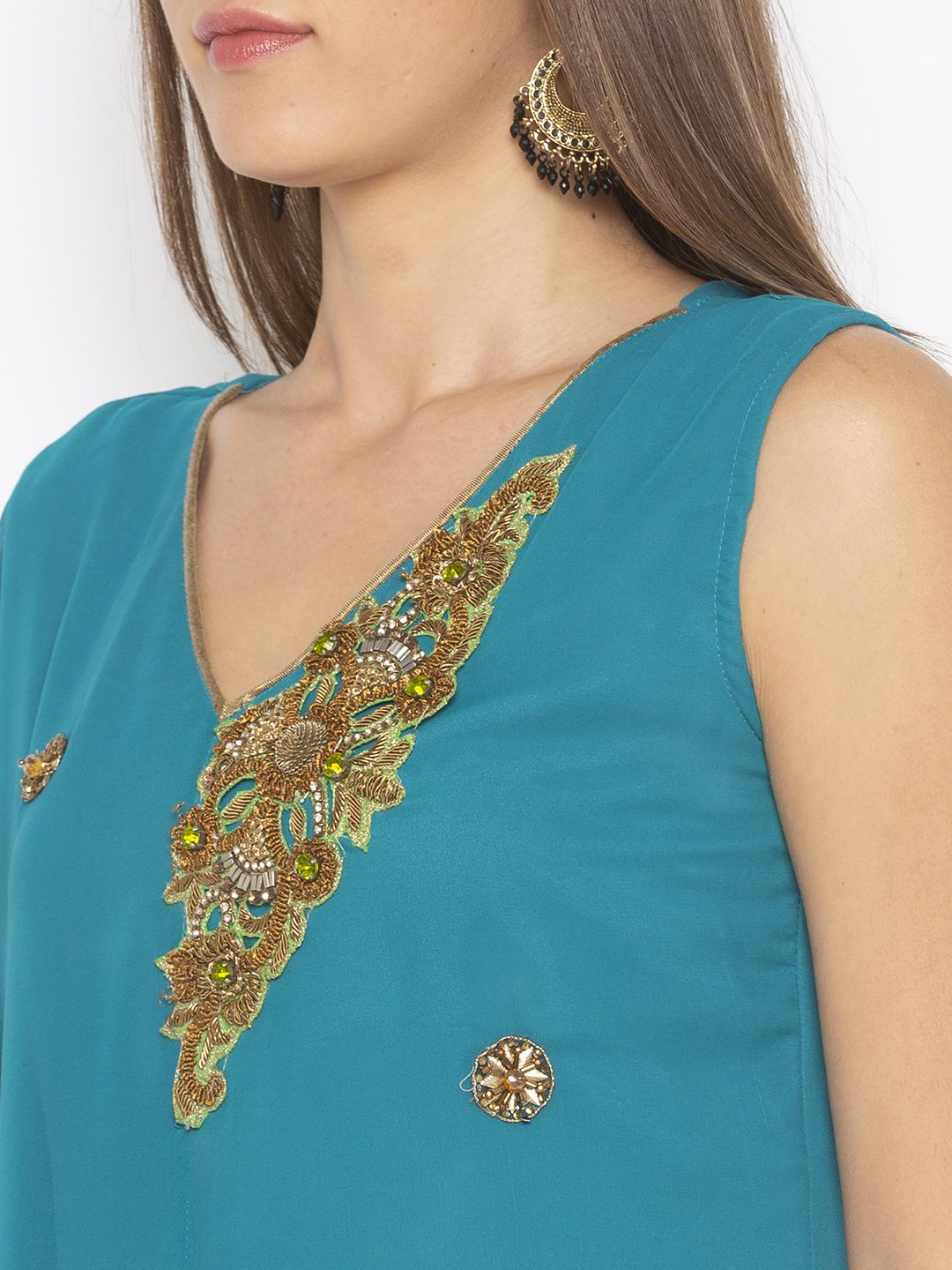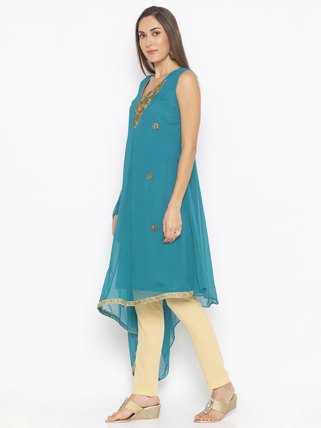Turquoise Blue Georgette Asymmetrical Kaftan Style Kurta With Antique Gold Zardozi On Front With Gold Embroidered Border In The Hemline Worn With Beige Cigarette Pants.