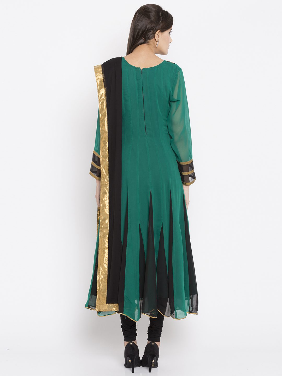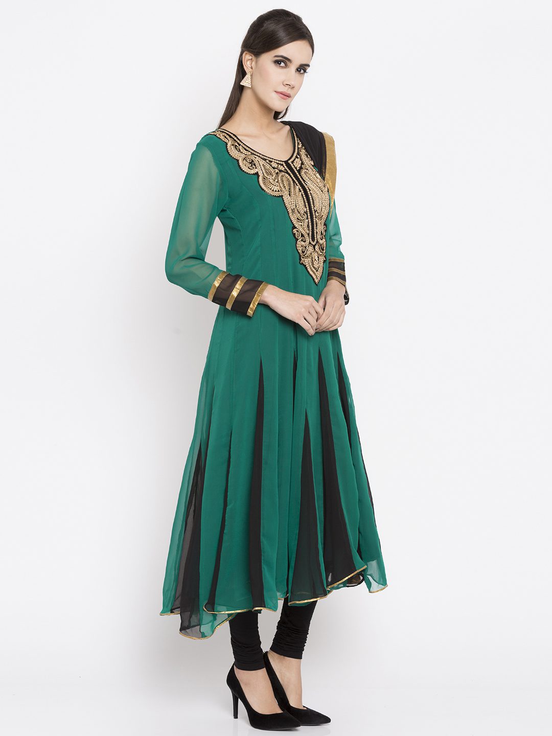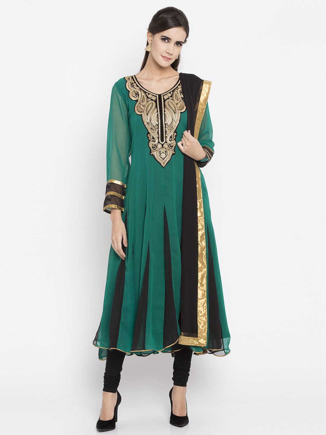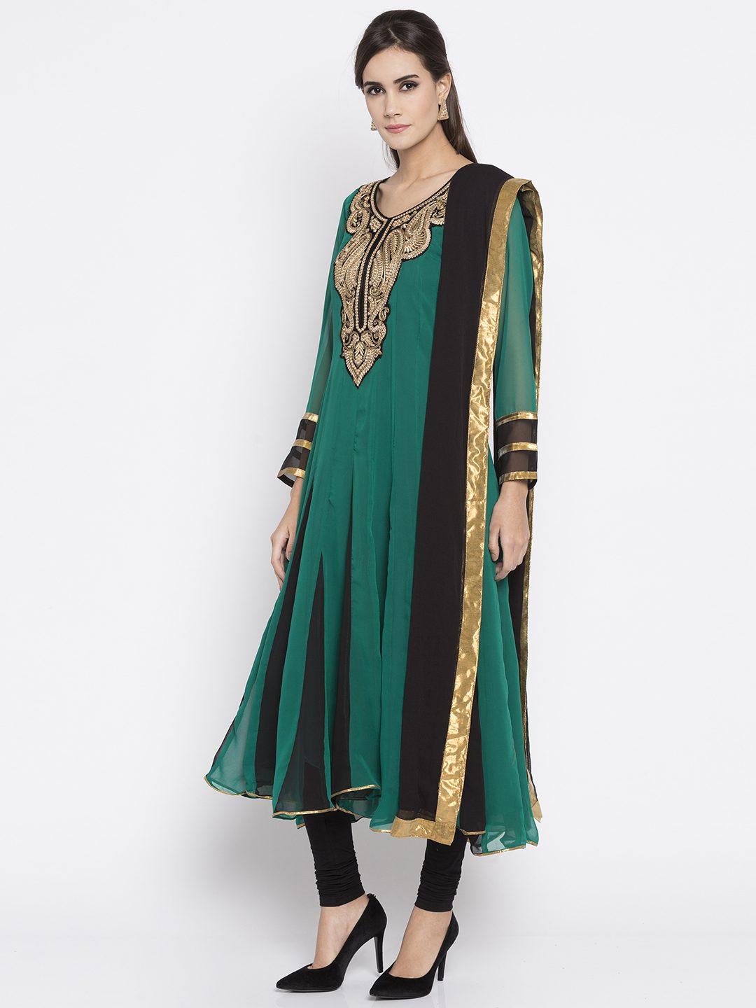 green kalidar readymade kameez in georgette designed with zari embroidered yoke enhanced by laced sleeves. Accompanied by a plain crape silk churidar and a laced Black chiffon dupatta.