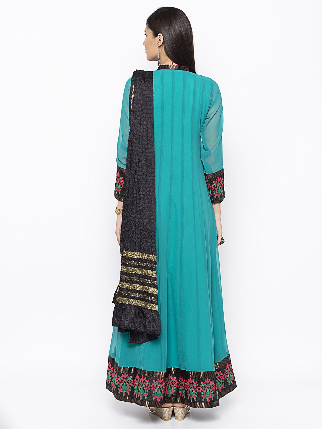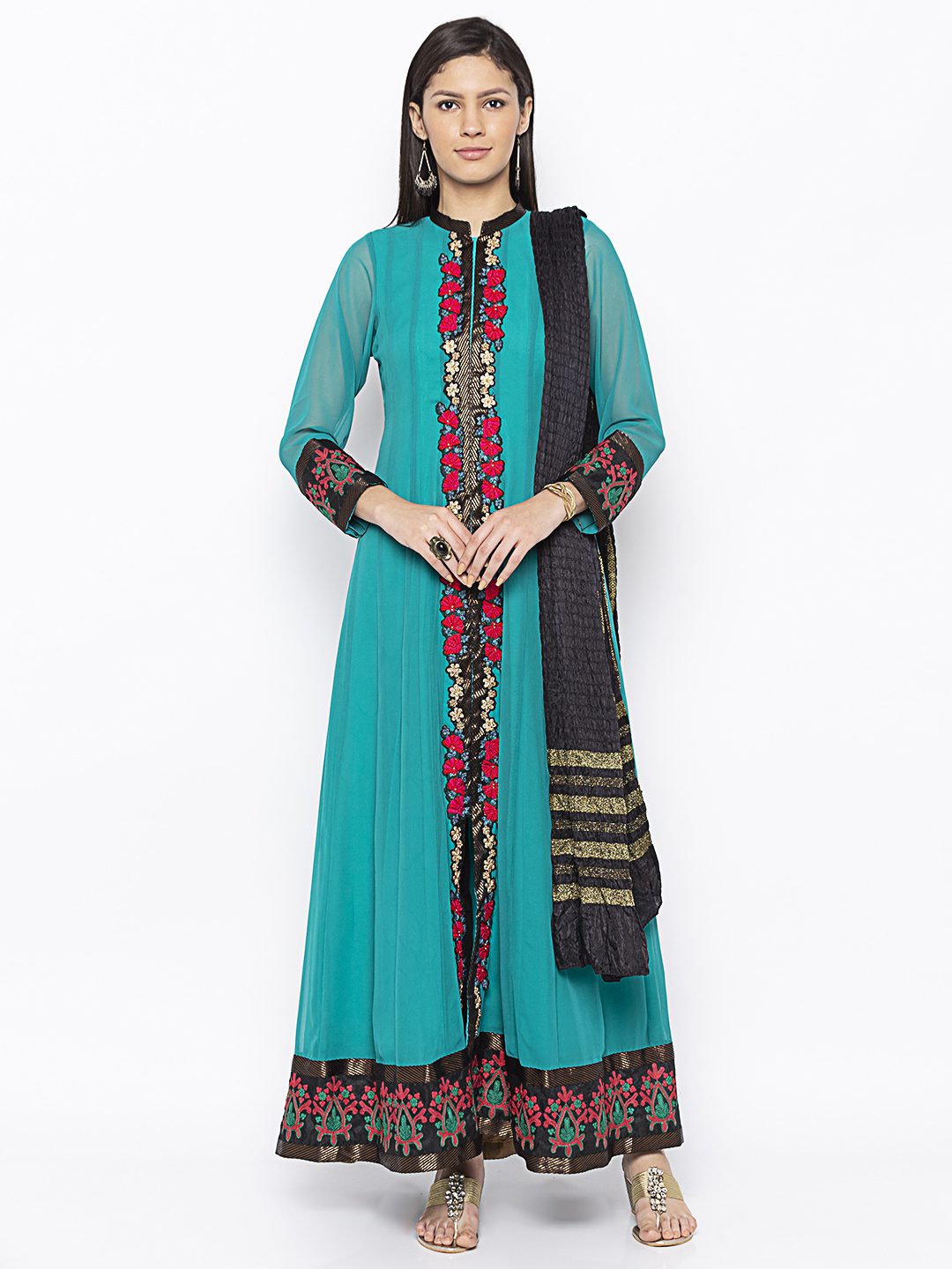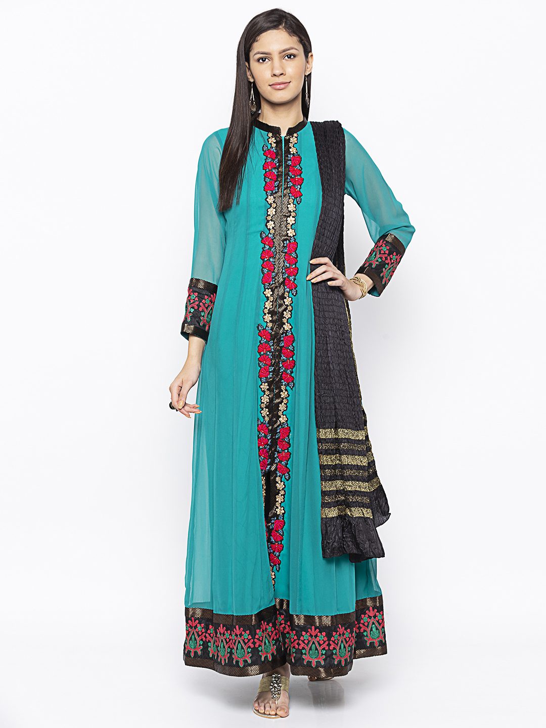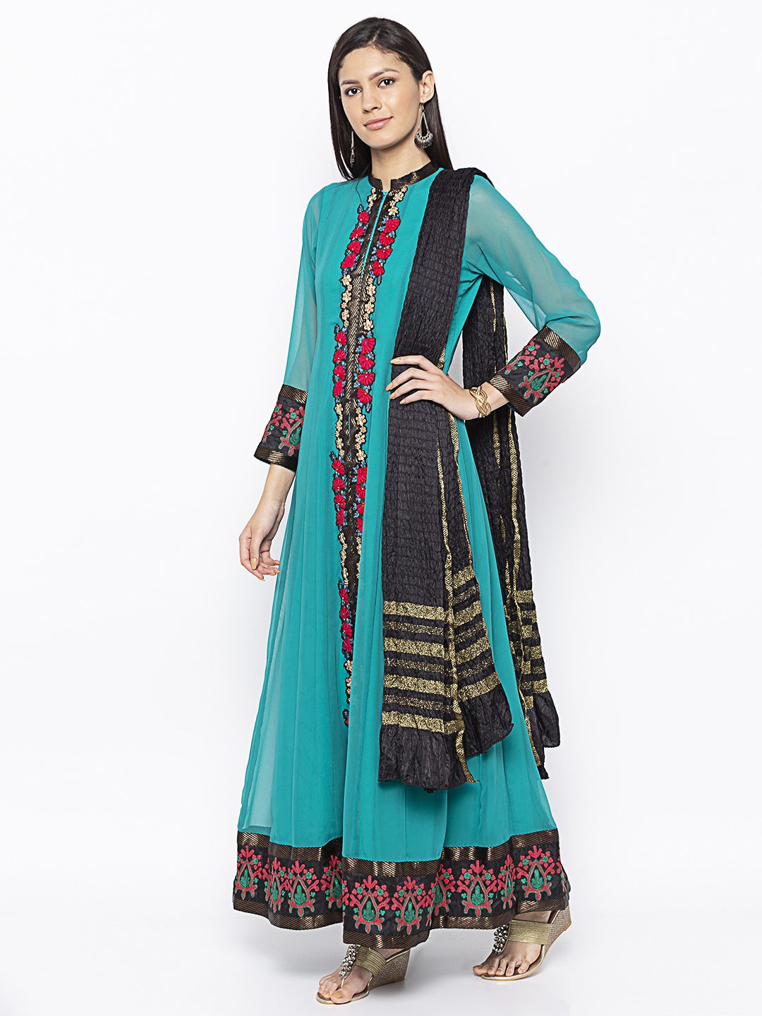 Turquoise Georgette Floor Length Kalidar With Embroidered Front Panel And Hemline Having Brocade Detailing Around It It On Full Sleeves Also Worn With Black Churidaar And Black Gold Crush Dupatta