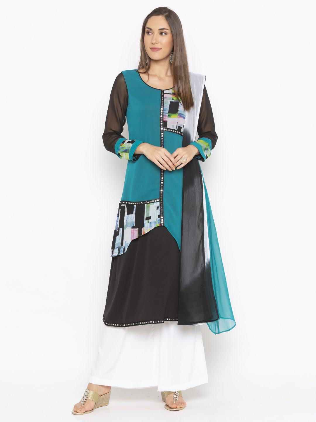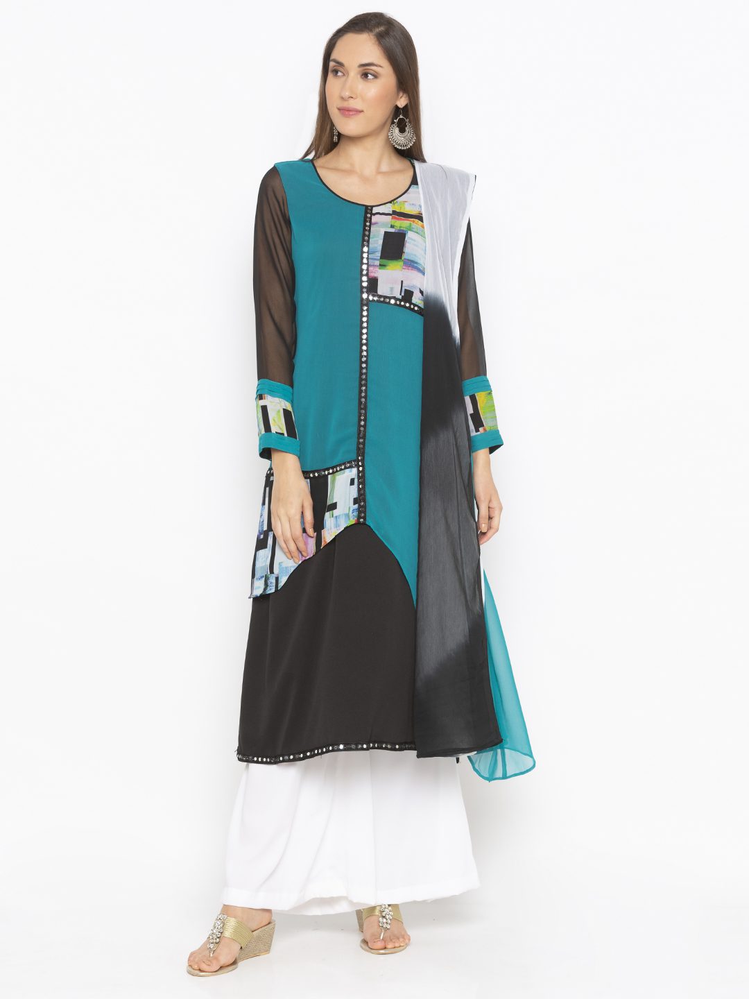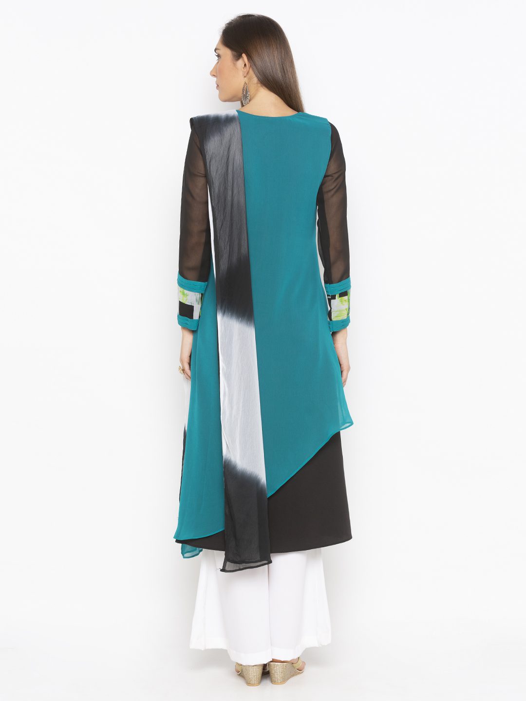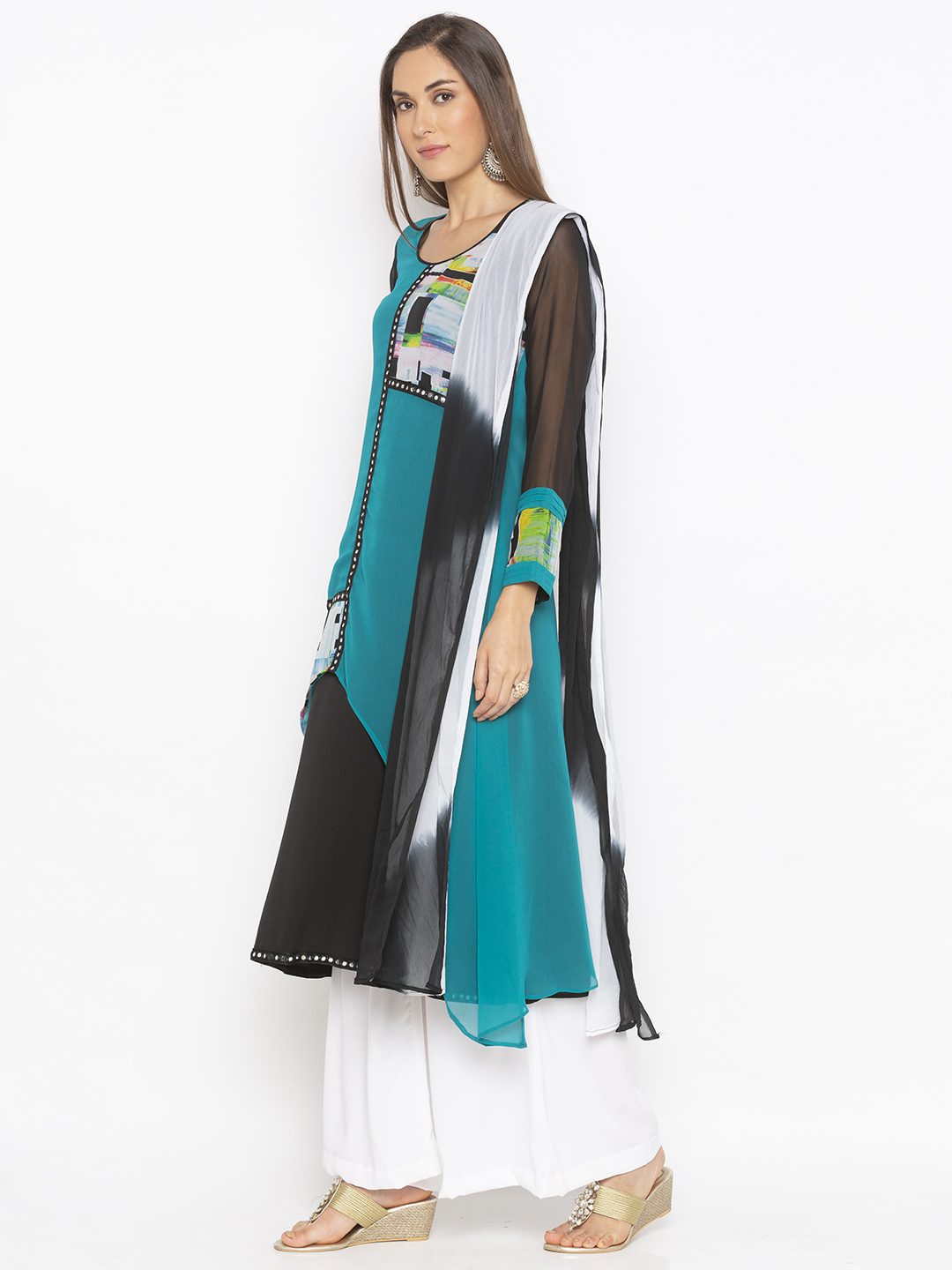 Turquoise Blue And Digital Print Georgette Combination Asymmetrical Kurta With Sheer Black Full Sleeves Having Pleating And Print Details Embellished With Mirrors Border On Outer And Inner Kurta Worn With White Palazzos And Black And White Shaded Chiffon Dupatta