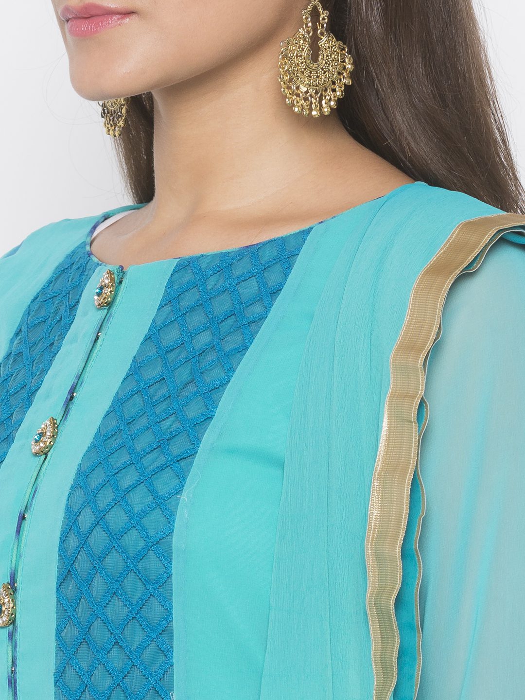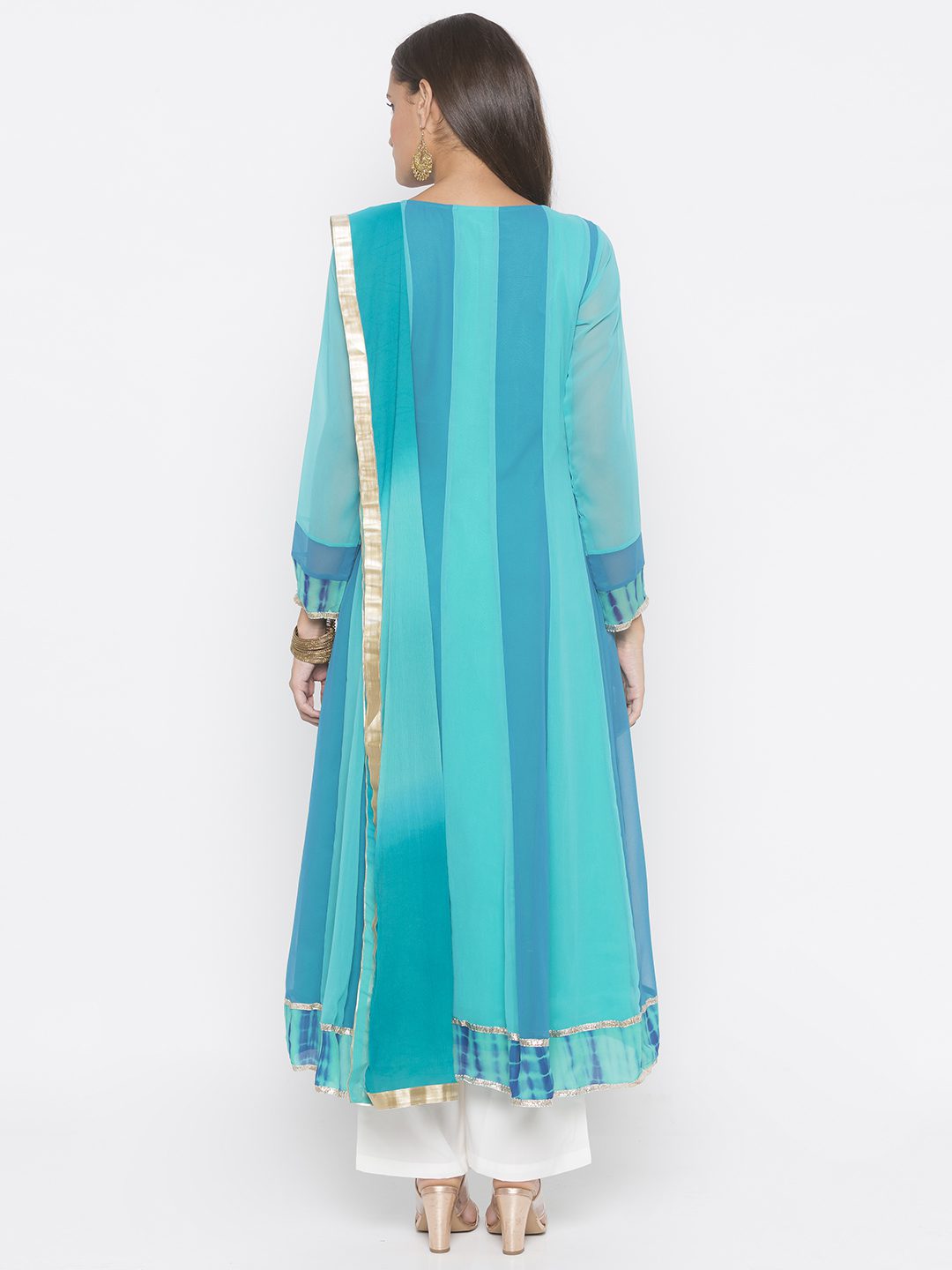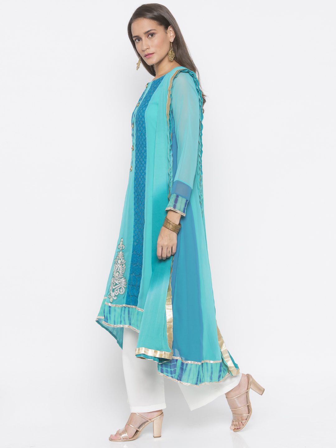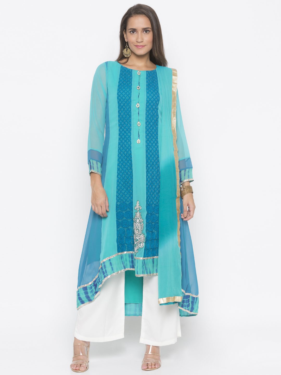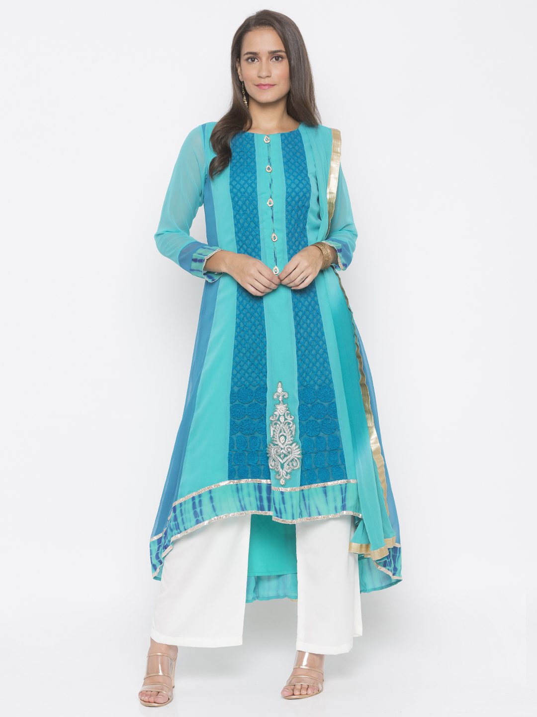 Light Blue Dark Blue Two Coloured Georgette Asymmetrical Kalidar Kurta With Embroidered Front Panels Having Silver Gold Mix Motif On Centre Of Hemline Blue Tie Dye Batik On Hemline And Sleeves Edge With Gota Patti On Either Sides Having Crystal Buttons On Button Patti. Worn With Off White Culottes And Light Blue Dark Blue Shaded Dupatta With Borders On All Sides.