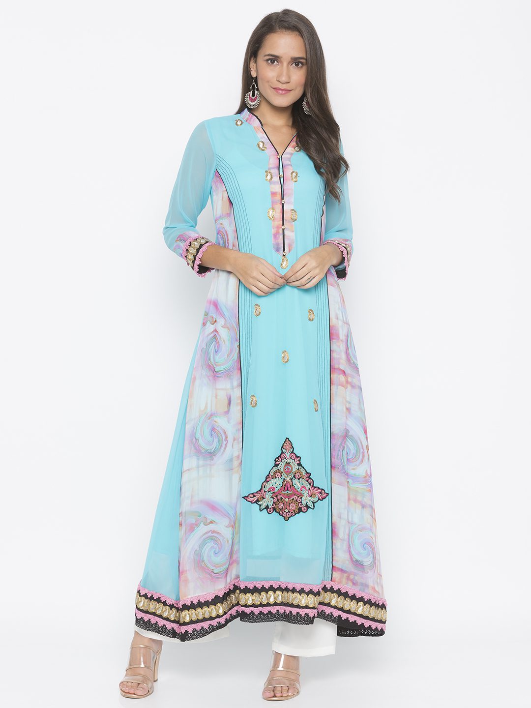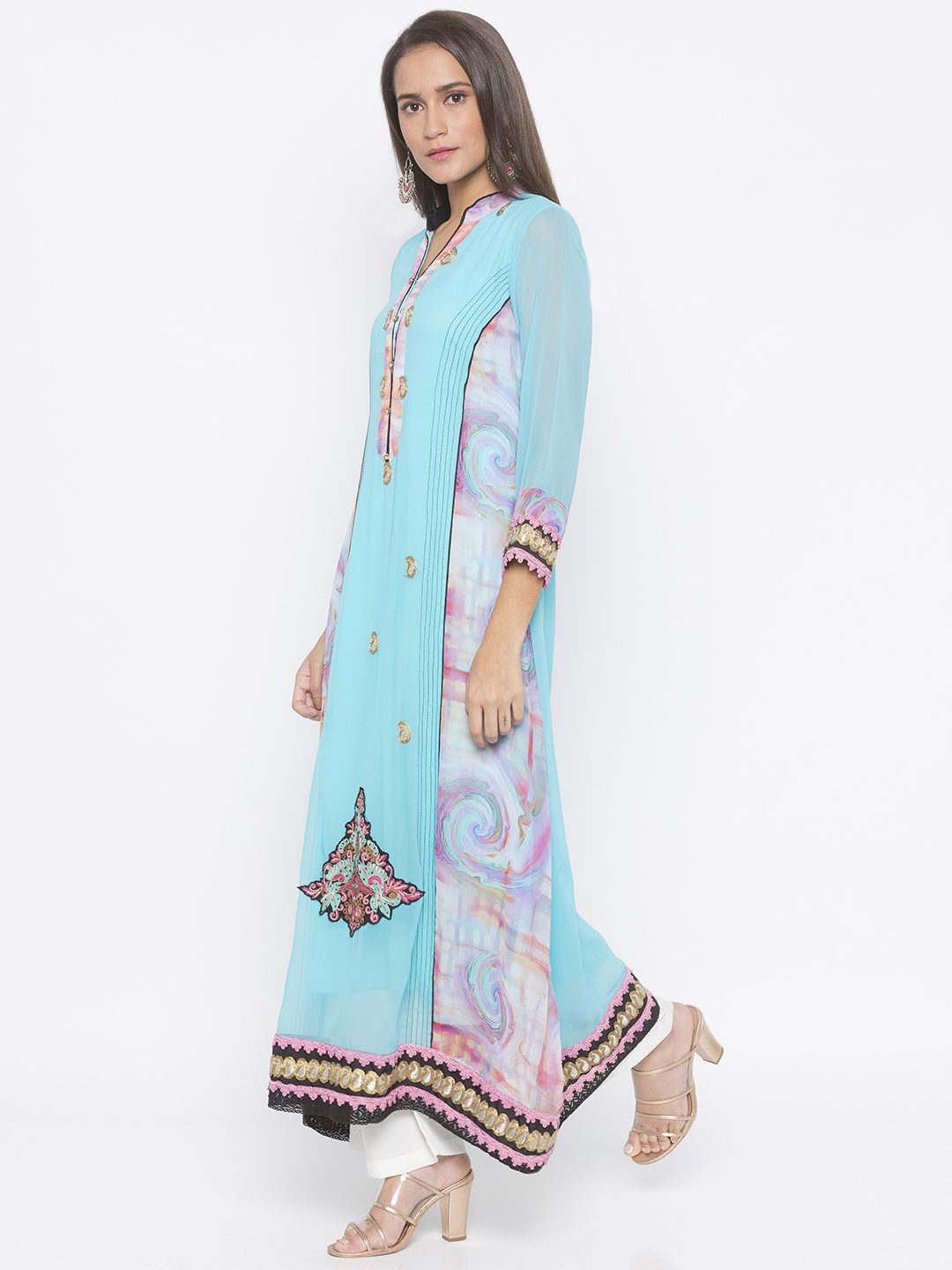 Blue Pink Printed Georgette Kalidaar Kurta With Black Contrast Detail Stitching On Kalis.. 3/4Th Sleeves ..Embroidered Motifs On Front Panel And Hemline With Lace Detailing On Sleeves And Hemline.