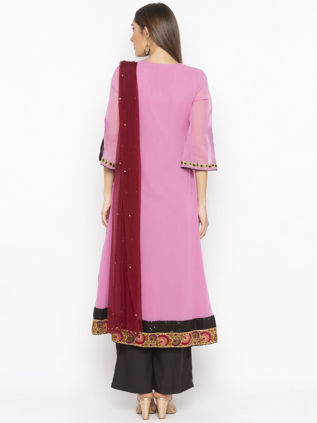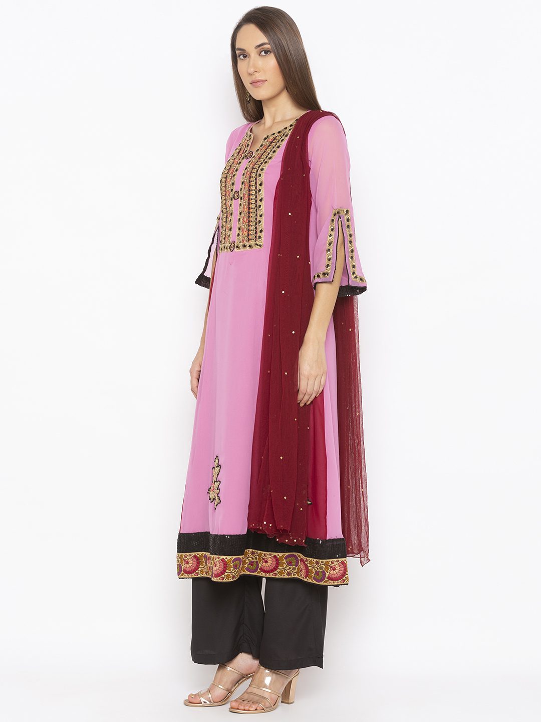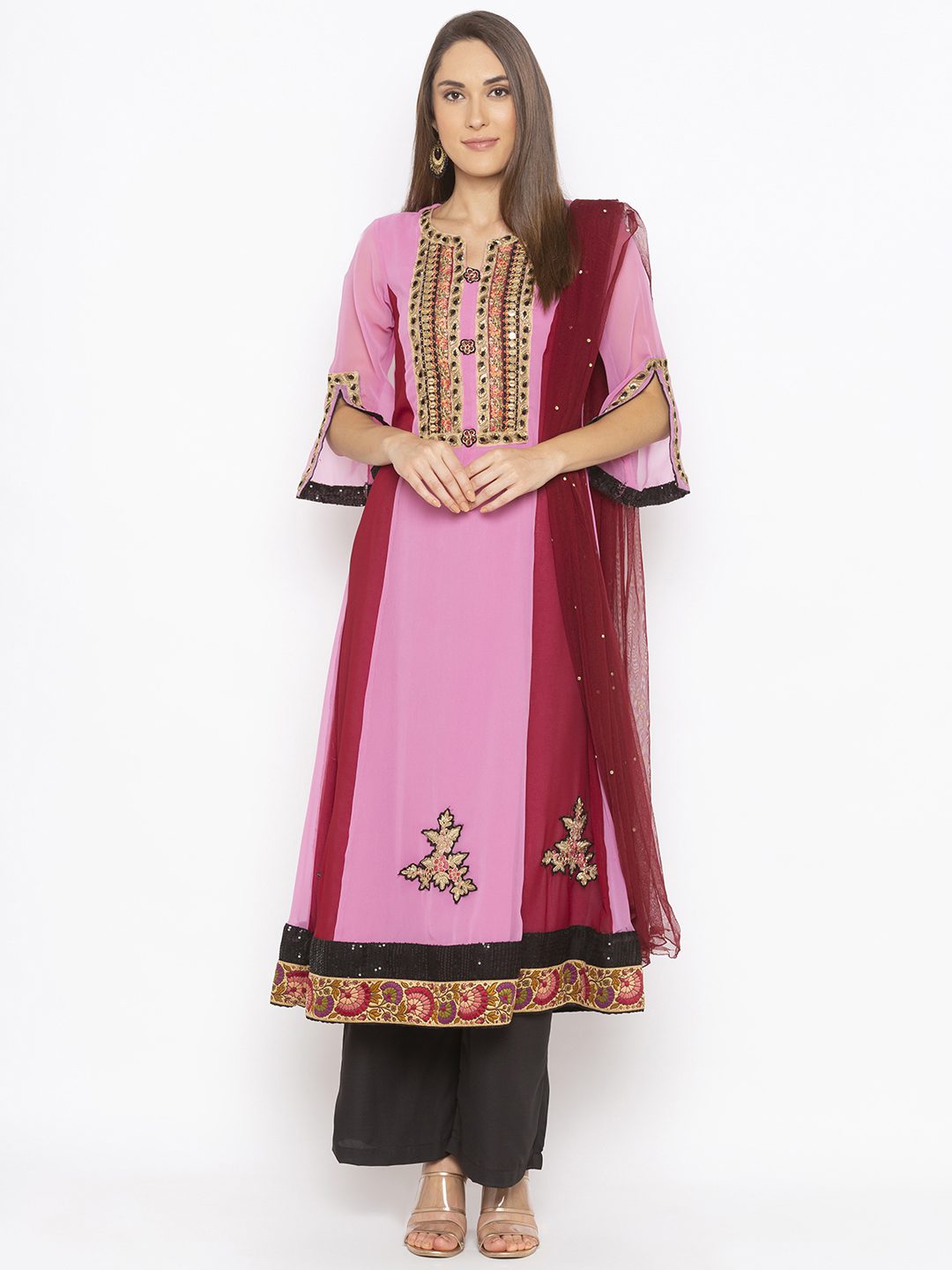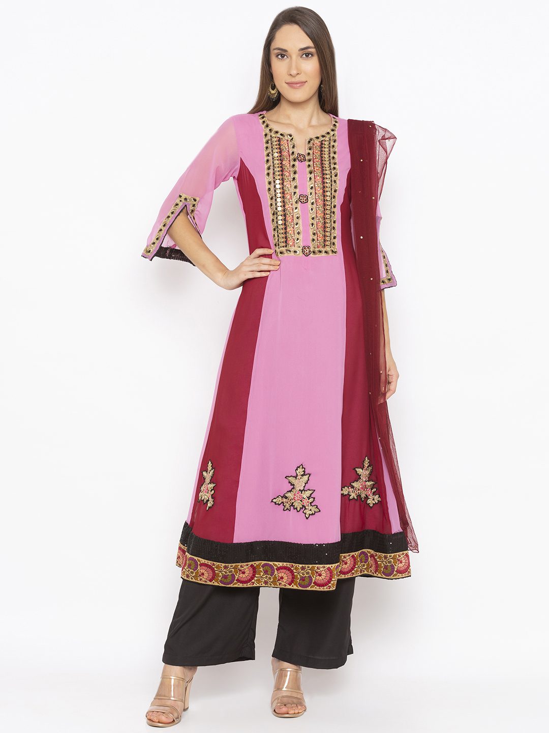 Strawberry Pink Maroon 2 Toned Slight Flared Kurta With Heavy Embroidery On Neckline Embroidered Motifs On Panels Slitted Three Quarter Bell Sleeves With Sequence And Thread Embroidered Borders On Hemline Worn With Black Culottes And Red Dupatta With Diamonds On It