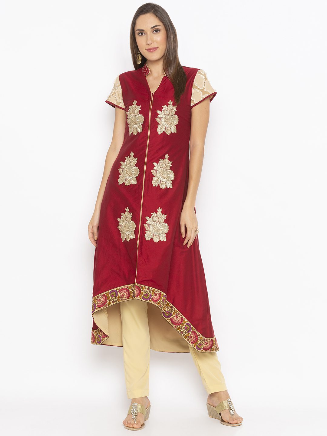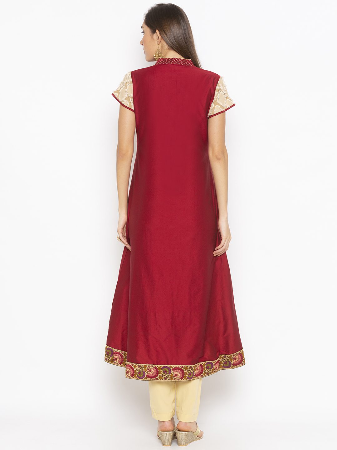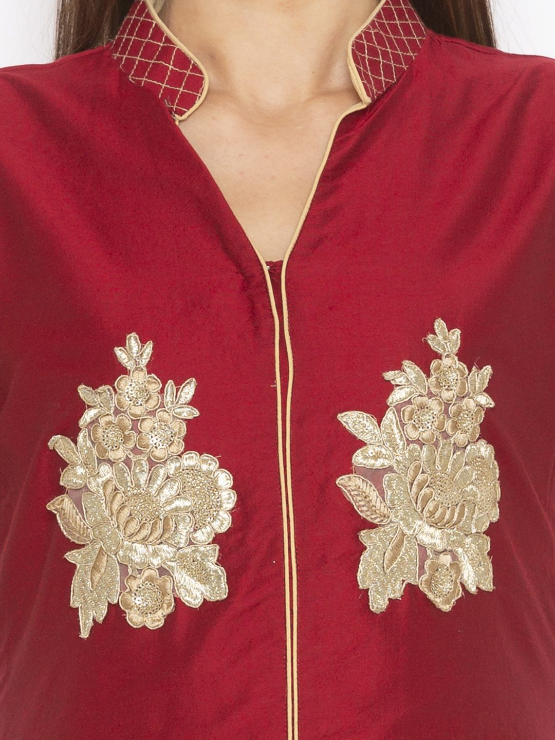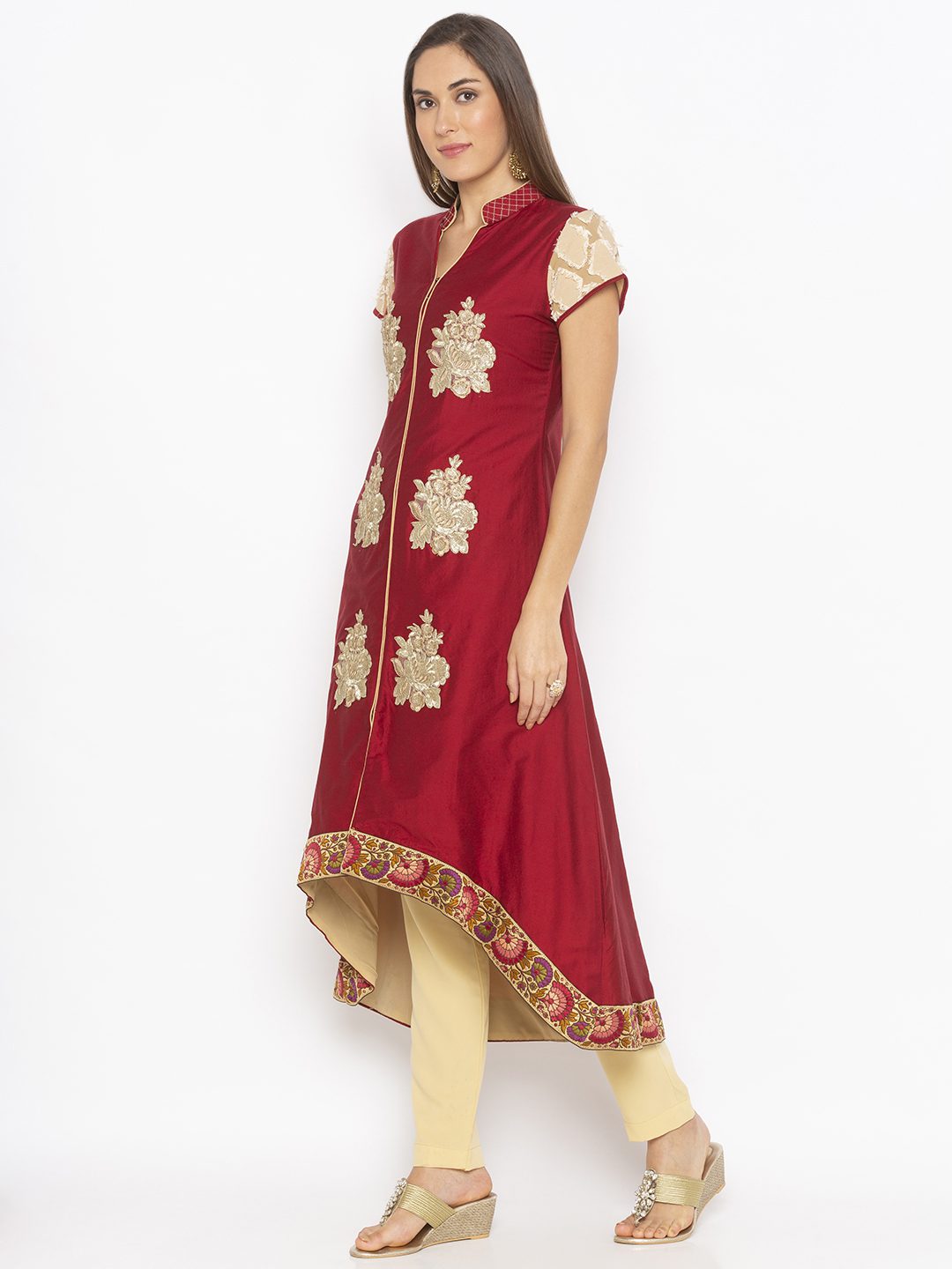 Nikhaar Creations Maroon Embroidered Cotton Silk Asymmetrical Kurta