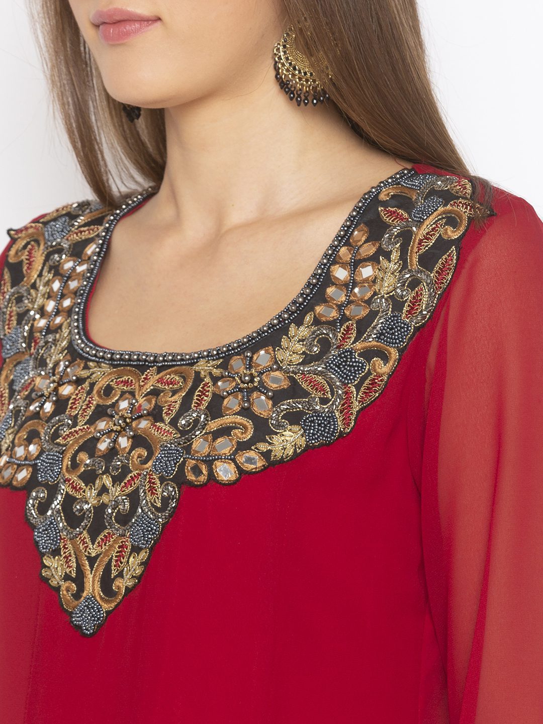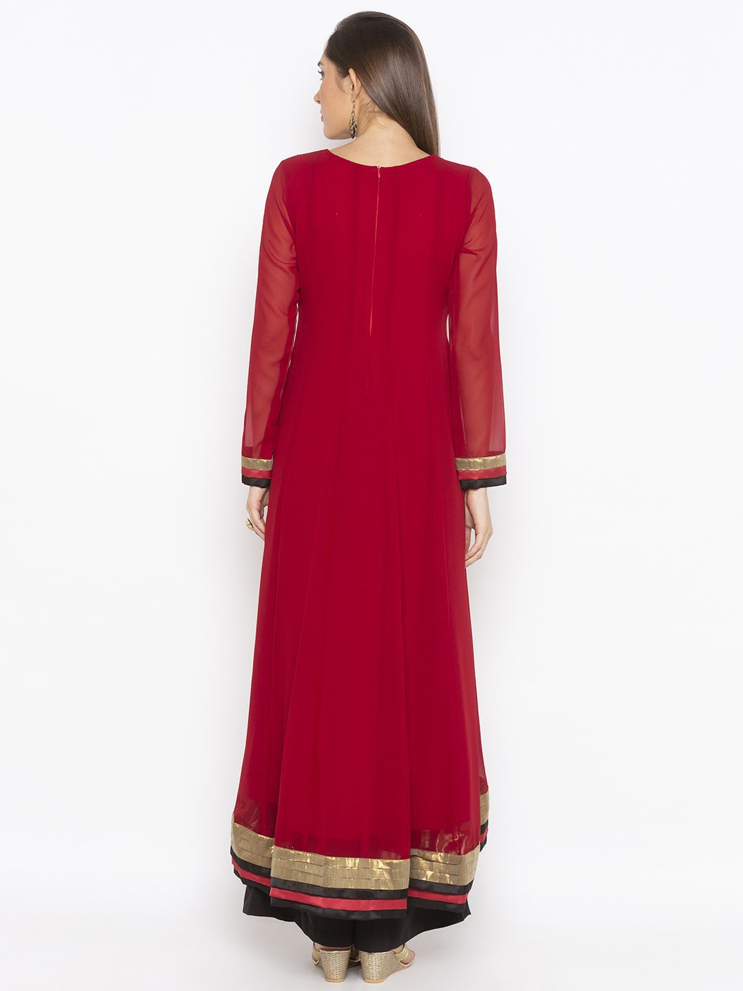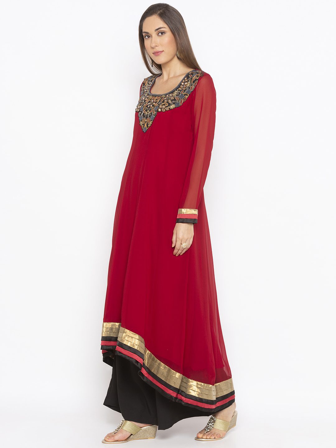 Maroon Asymmetrical Georgette Kalidaar Kurta With Hand Embroidered Neckline Full Sleeves ..Antique Gold And Contrast Satin Pleat Detailing On Asymmetrical Hemline And Sleeves.