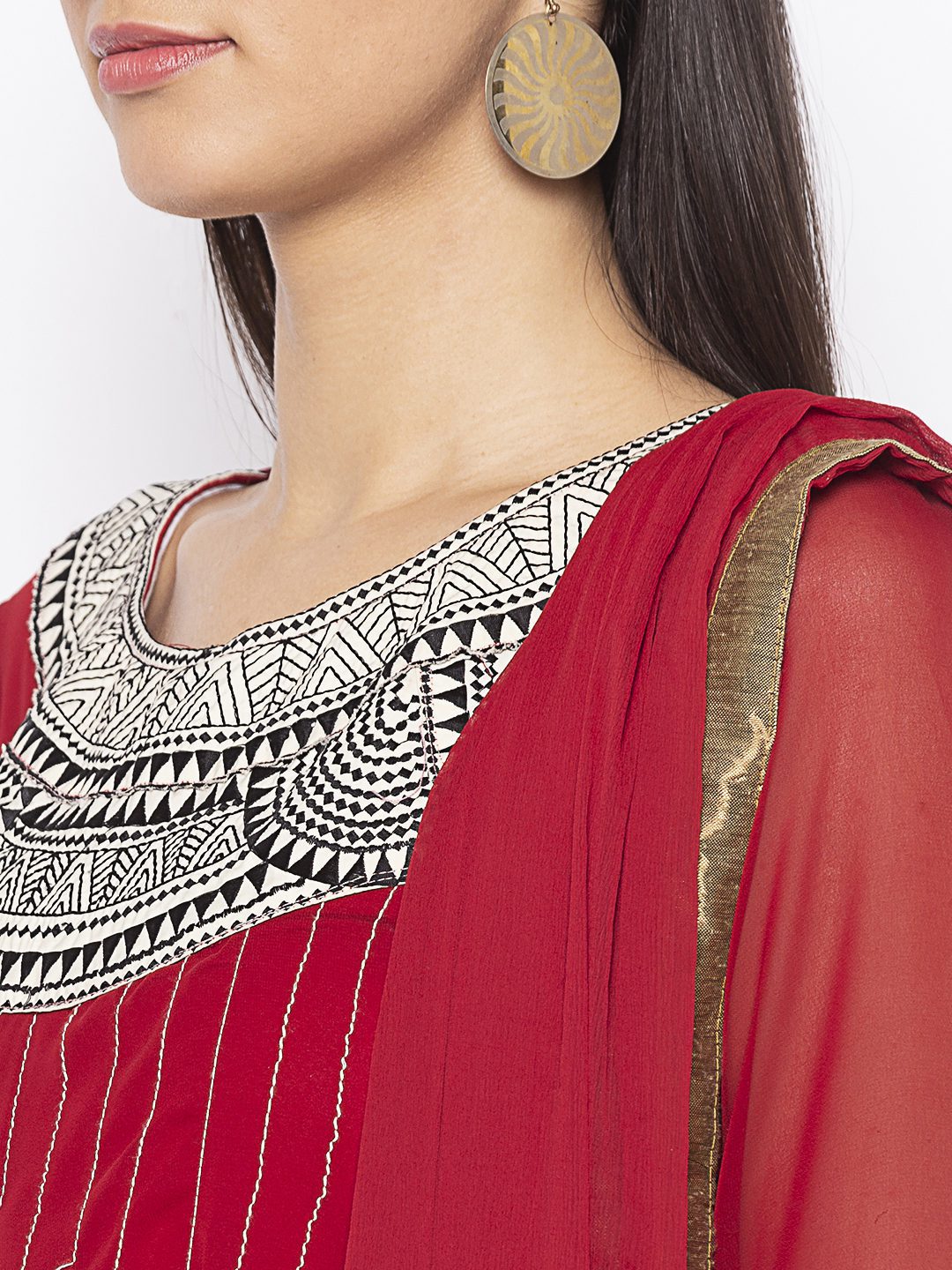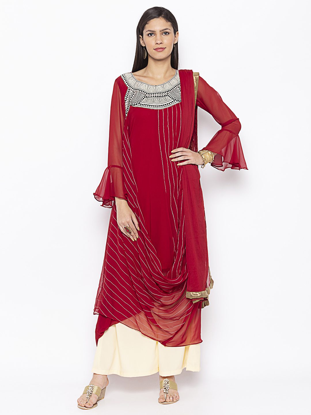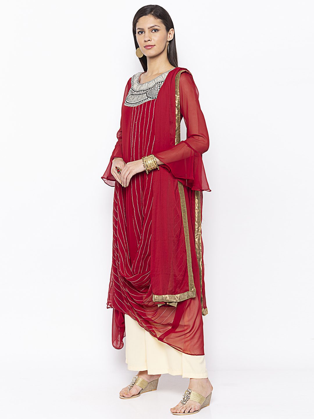 Nikhaar Creations Maroon Embroidered Georgette Asymmetrical Palazzo Kurta Dupatta