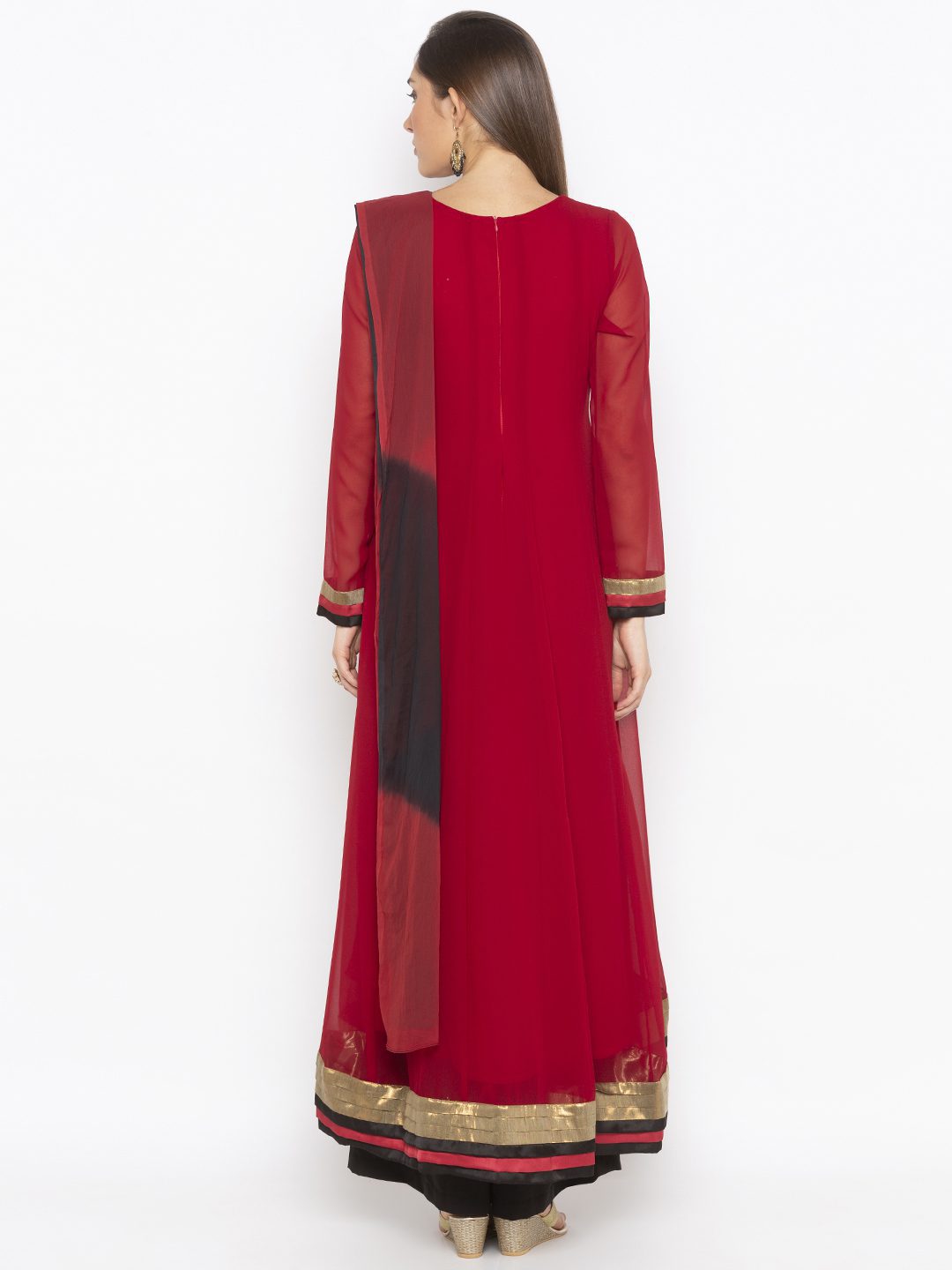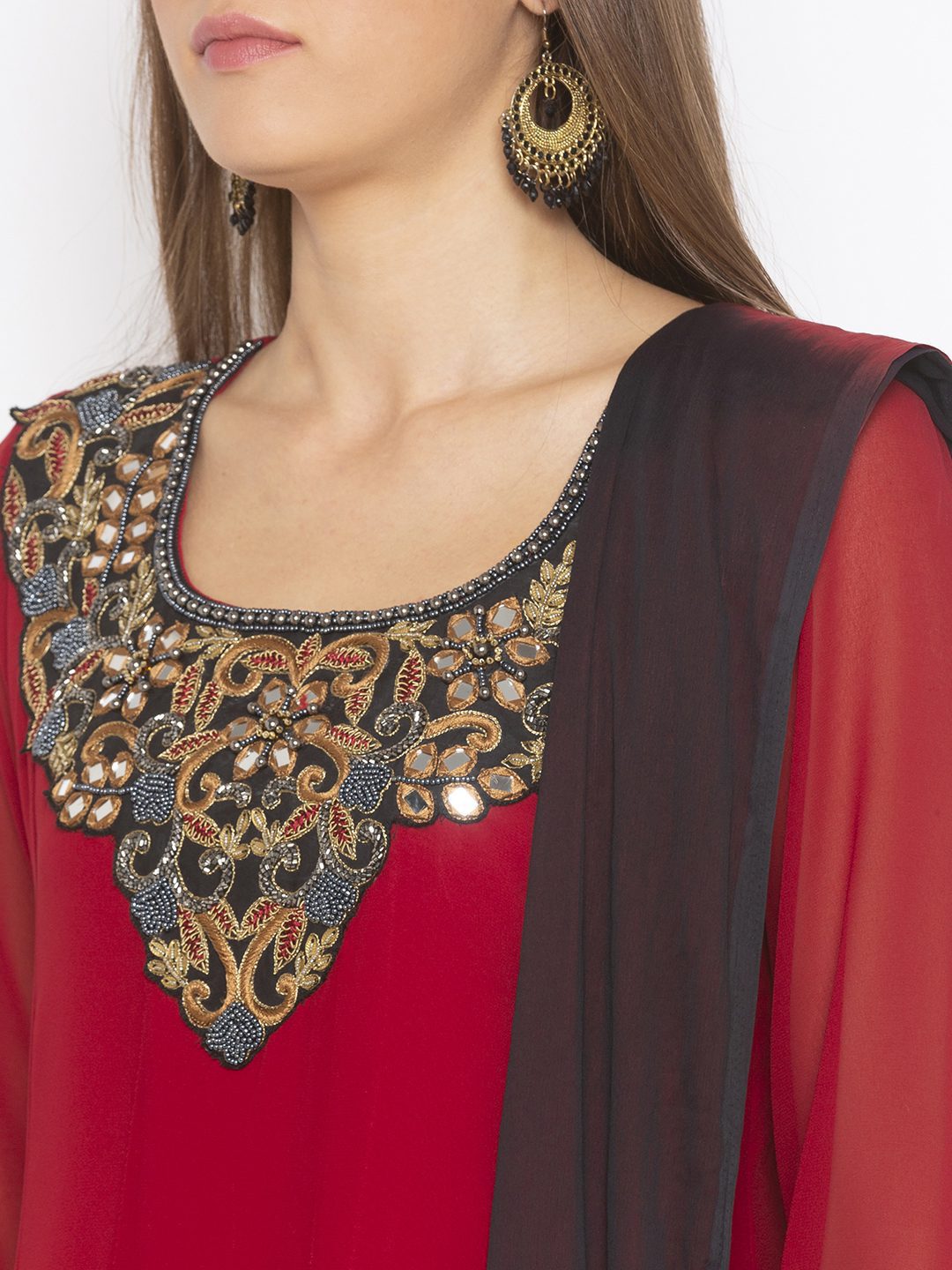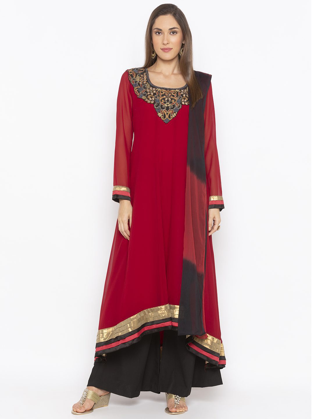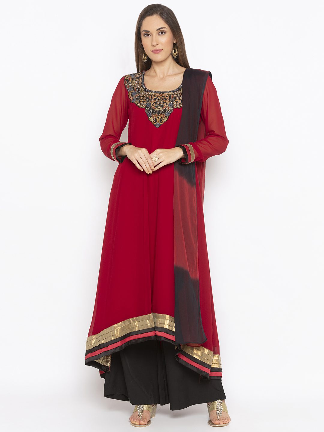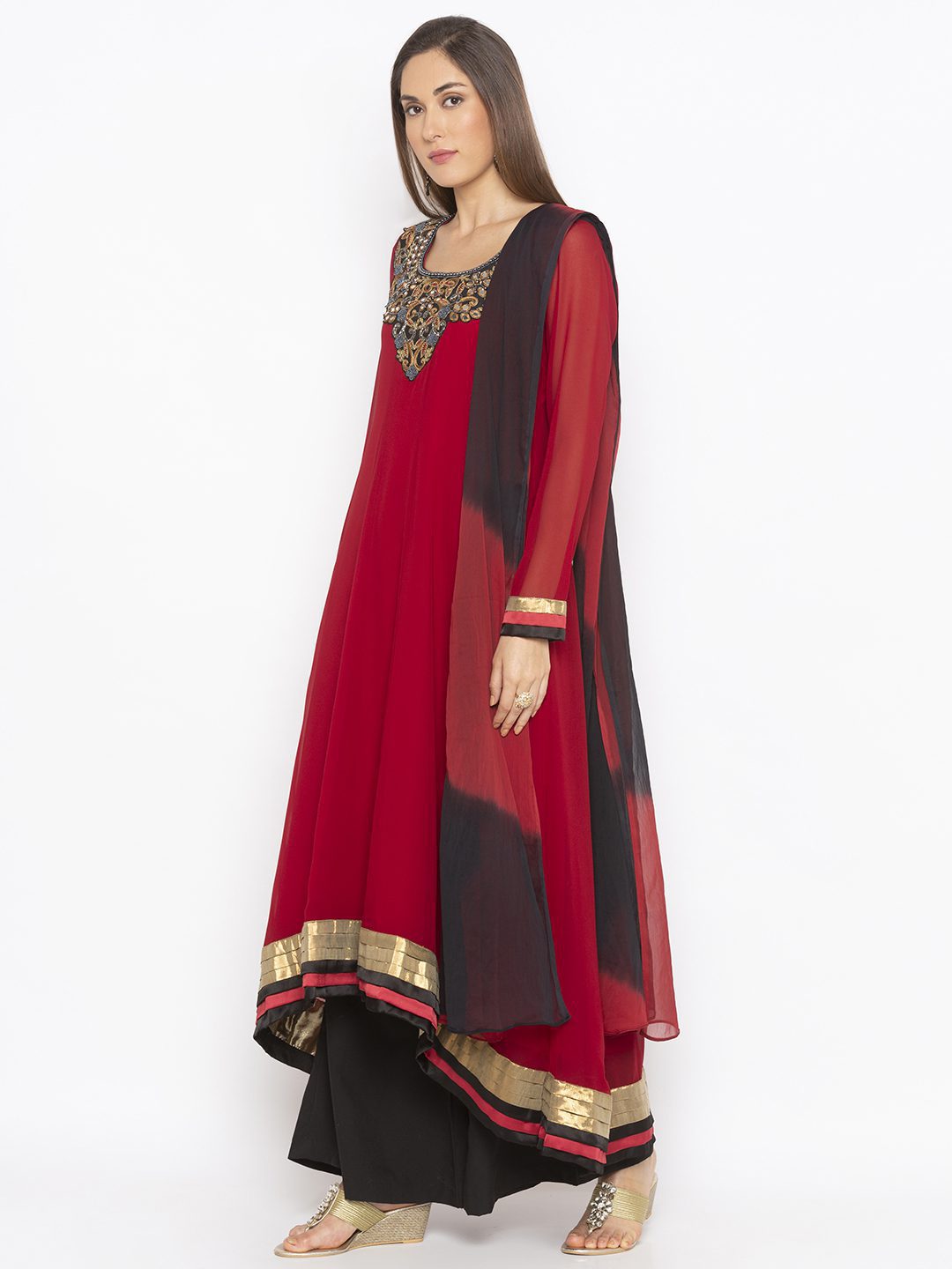 Nikhaar Creations Maroon Embroidered Georgette Asymmetrical Palazzo Kurta Dupatta