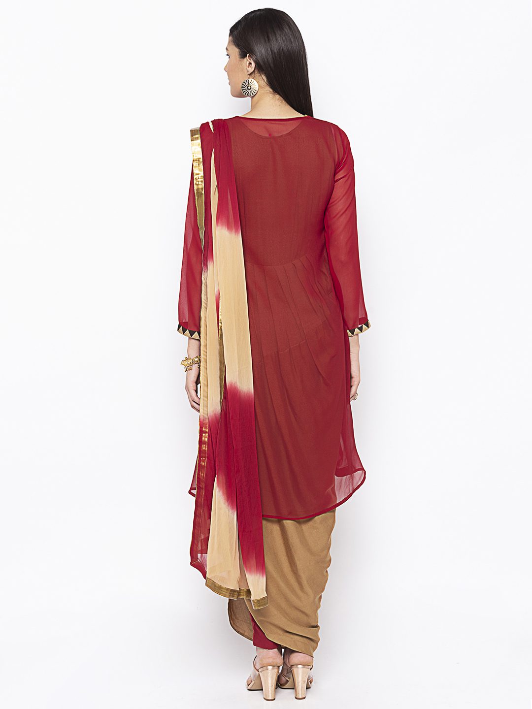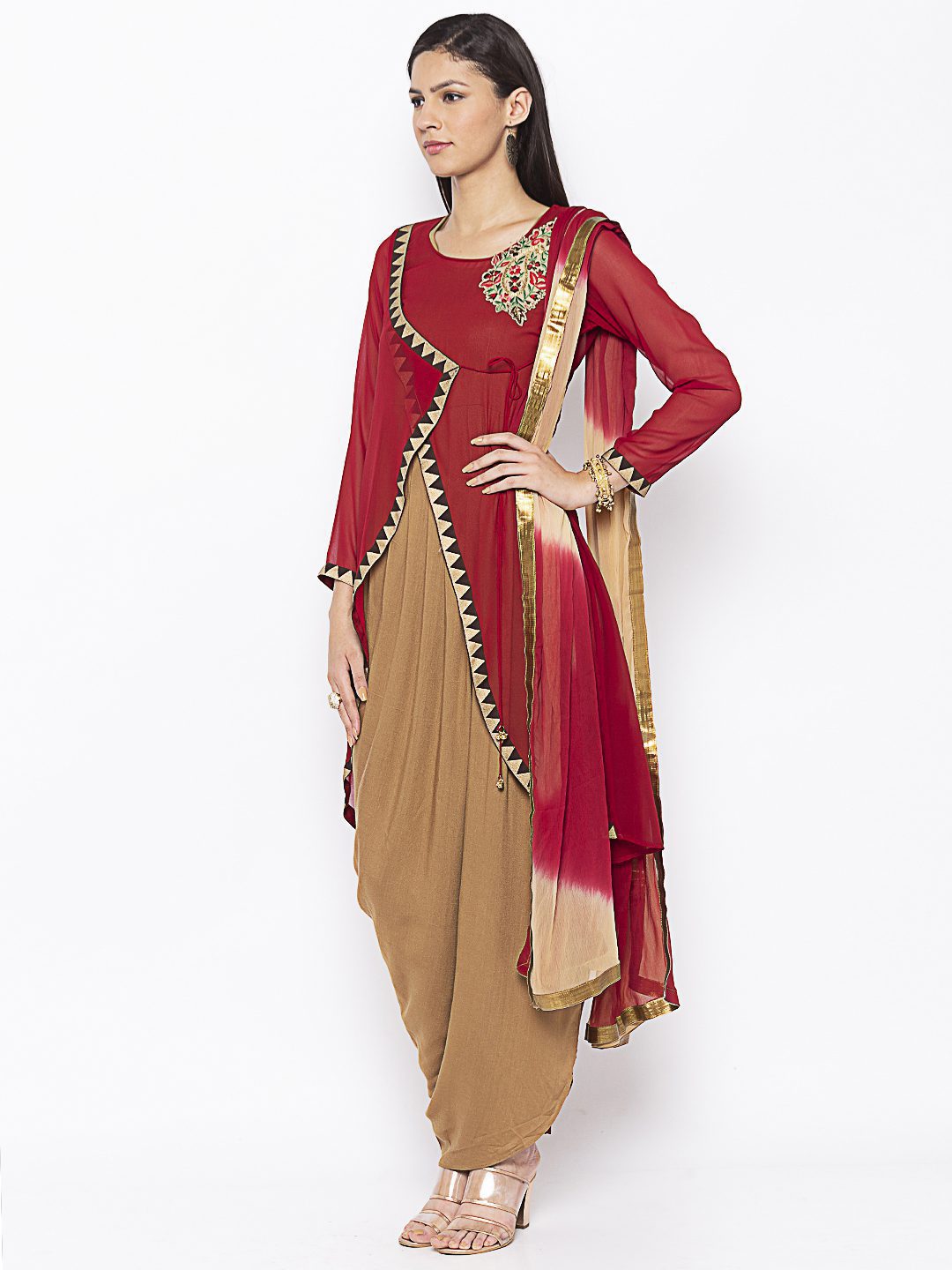 Maroon Georgette Overlap Style Full Sleeves Asymmetrical Kurta With Brown Sleeveless Cotton Pleated Drape Style Inner Having Zaree And Multi Colour Thread Embroidery On One Shoulder With Antique Gold Brown Border On The Front Portion And Sleeves Edge Worn With Maroon Pants And Beige And Maroon Chiffon Dupatta.