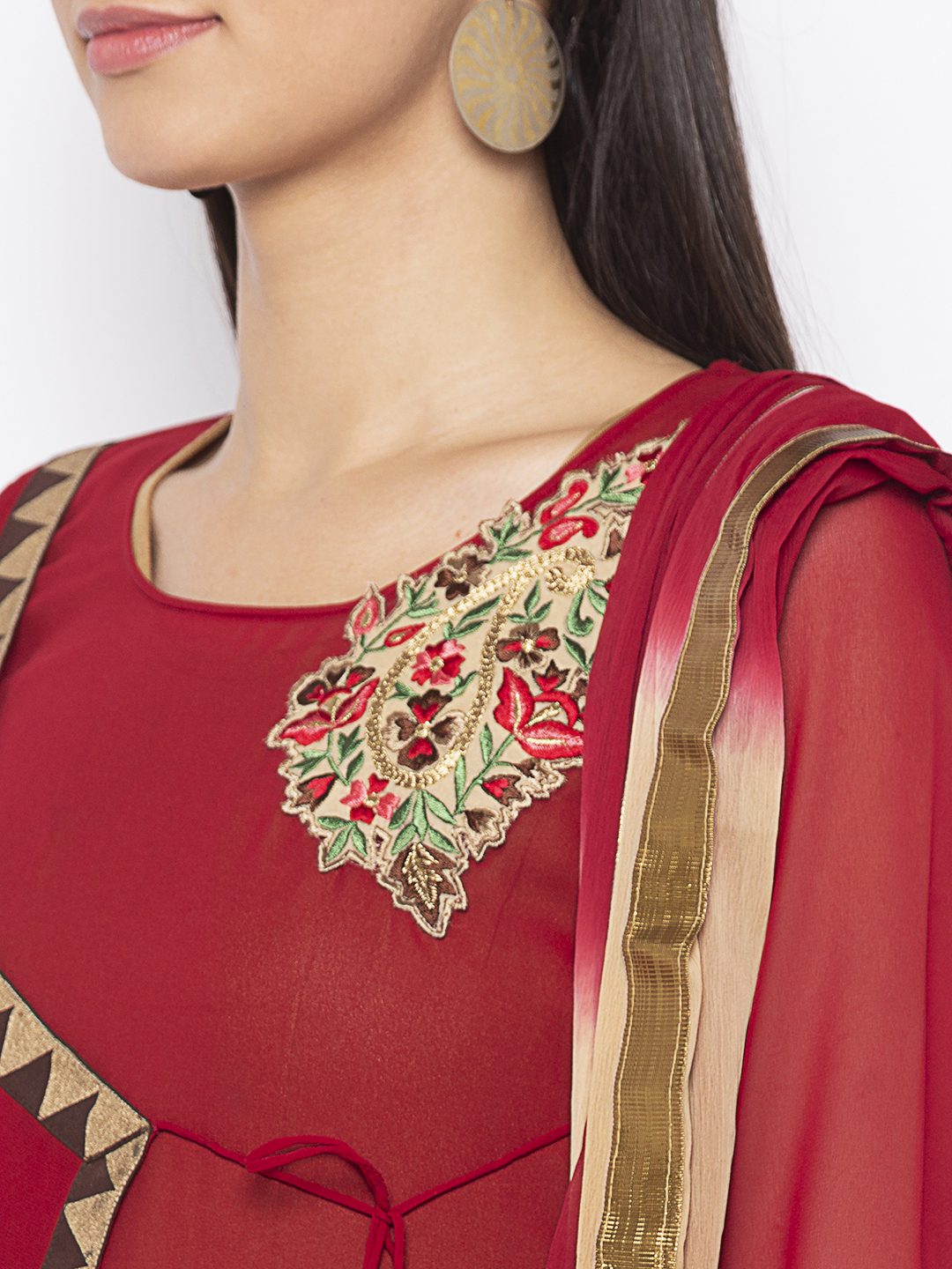 Nikhaar Creations Maroon Embroidered Georgette Asymmetrical Trouser Kurta Dupatta