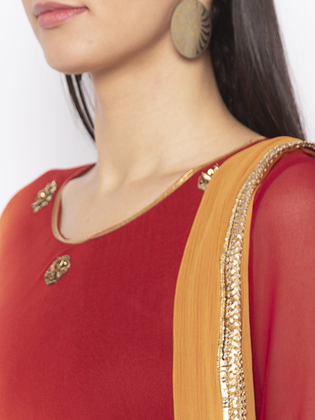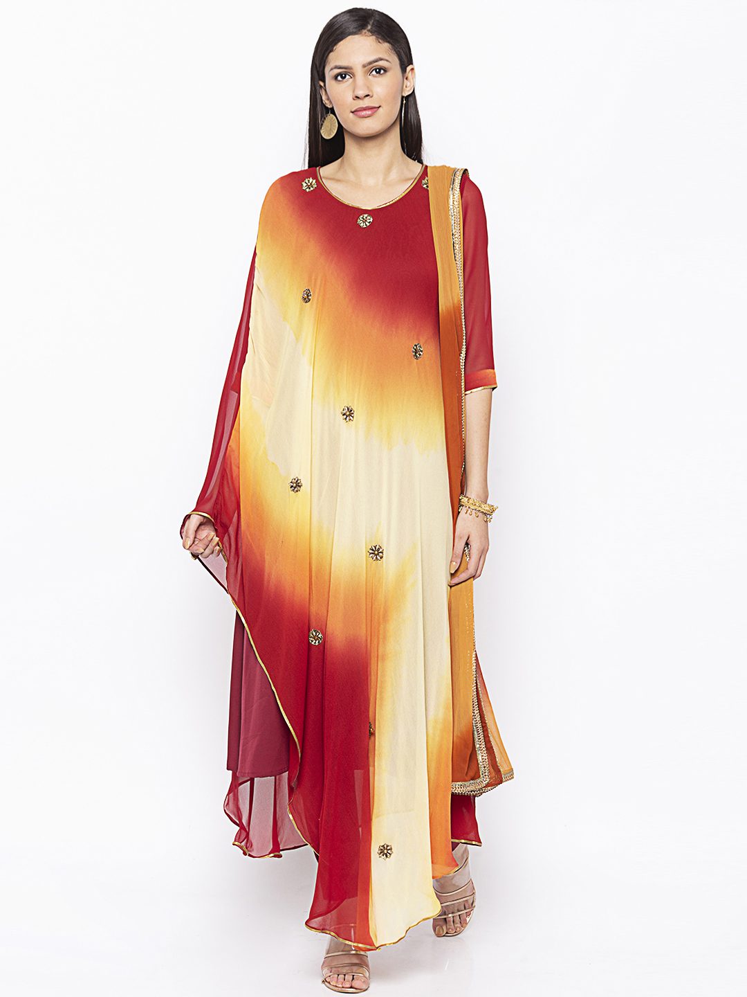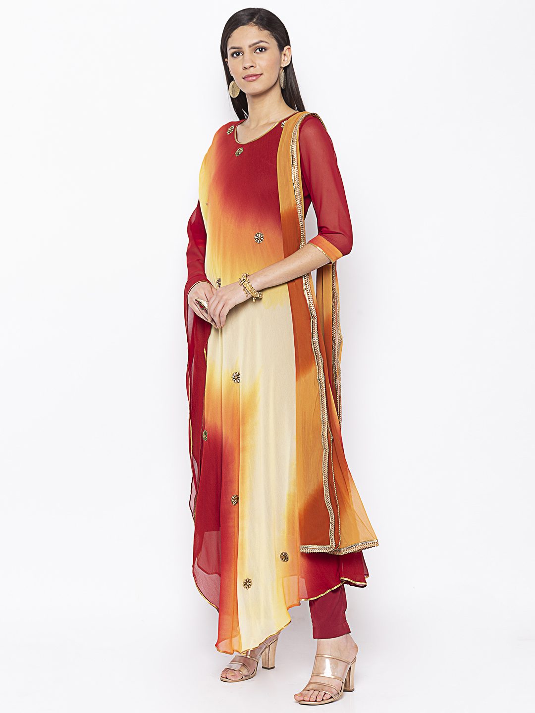 Nikhaar Creations Maroon Embroidered Georgette Asymmetrical Trouser Kurta Dupatta