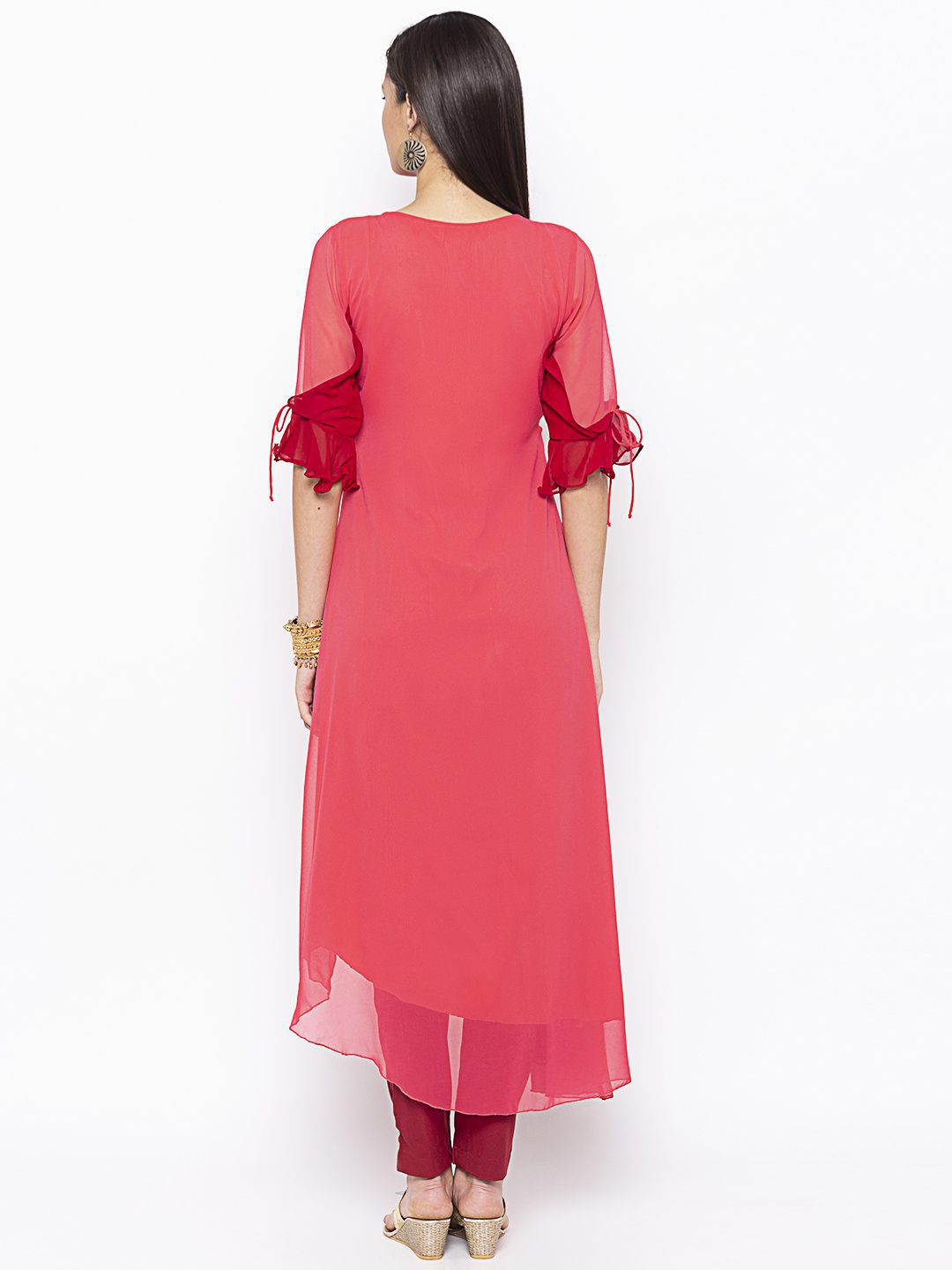 Redish Maroon Pink Two Colour Georgette A Symmetrical Slight Flared Kurta With Two Colour Detailing Elbow Sleeve With Slight Bell zardozi Embroidery On Neckline Worn With Pink Cigarette Pants.