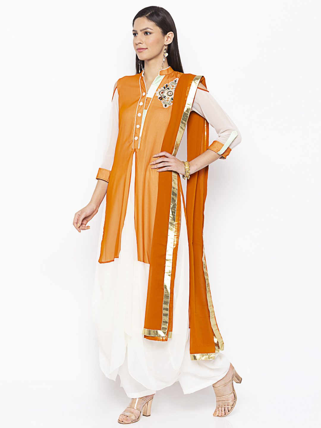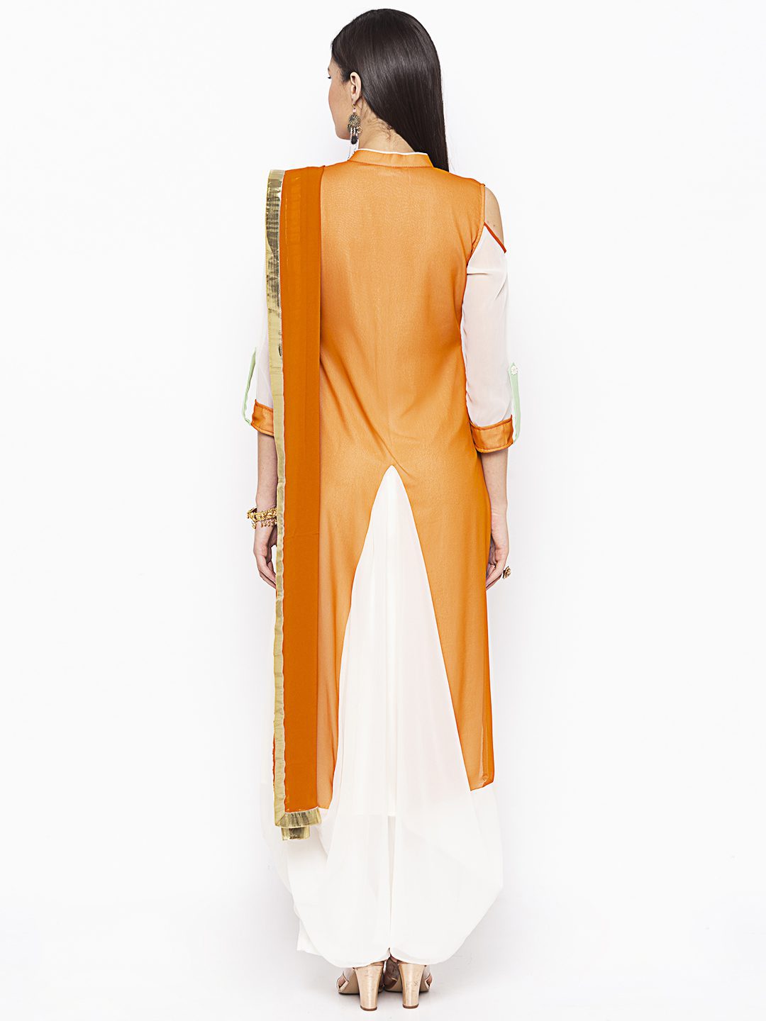 Mustard Cream Double Coloured Georgette Cowled Asymmetrical Kurta With Green Cream Detailing On Front Button Patti ..3/4 Slitted Creme Georgette Sleeves With Green Epaulettes And Mustard Fold On It.. Embroidered Crochet Buttons And Hand Embroidery Around Shoulder Neck Portion Worn With Creme Q Lots And Mustard Chiffon Dupatta With Gold Patti On All Sides.