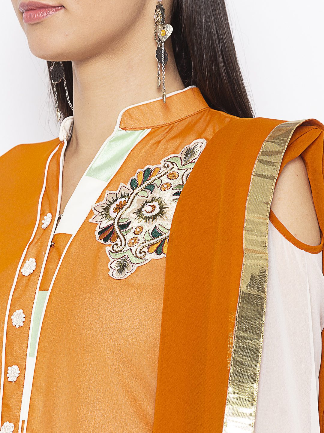 Nikhaar Creations Mustard Embroidered Georgette Asymmetrical Parallel Kurta Dupatta