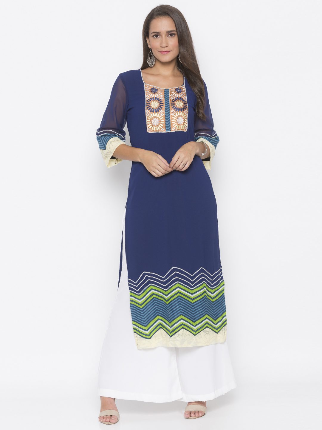 Navy Blue American Crepe Straight Cut Kurta With Embroidery On Neckline Blue Sheer Georgette Semi Bell Sleeves With Print And Lace Detailing On Hemline And Sleeve Edge.