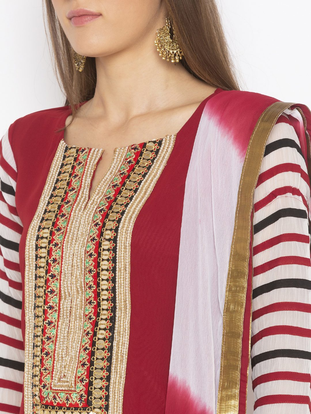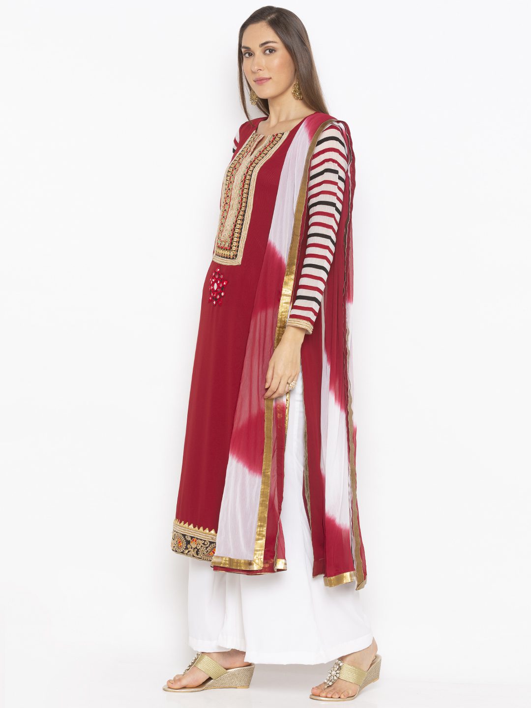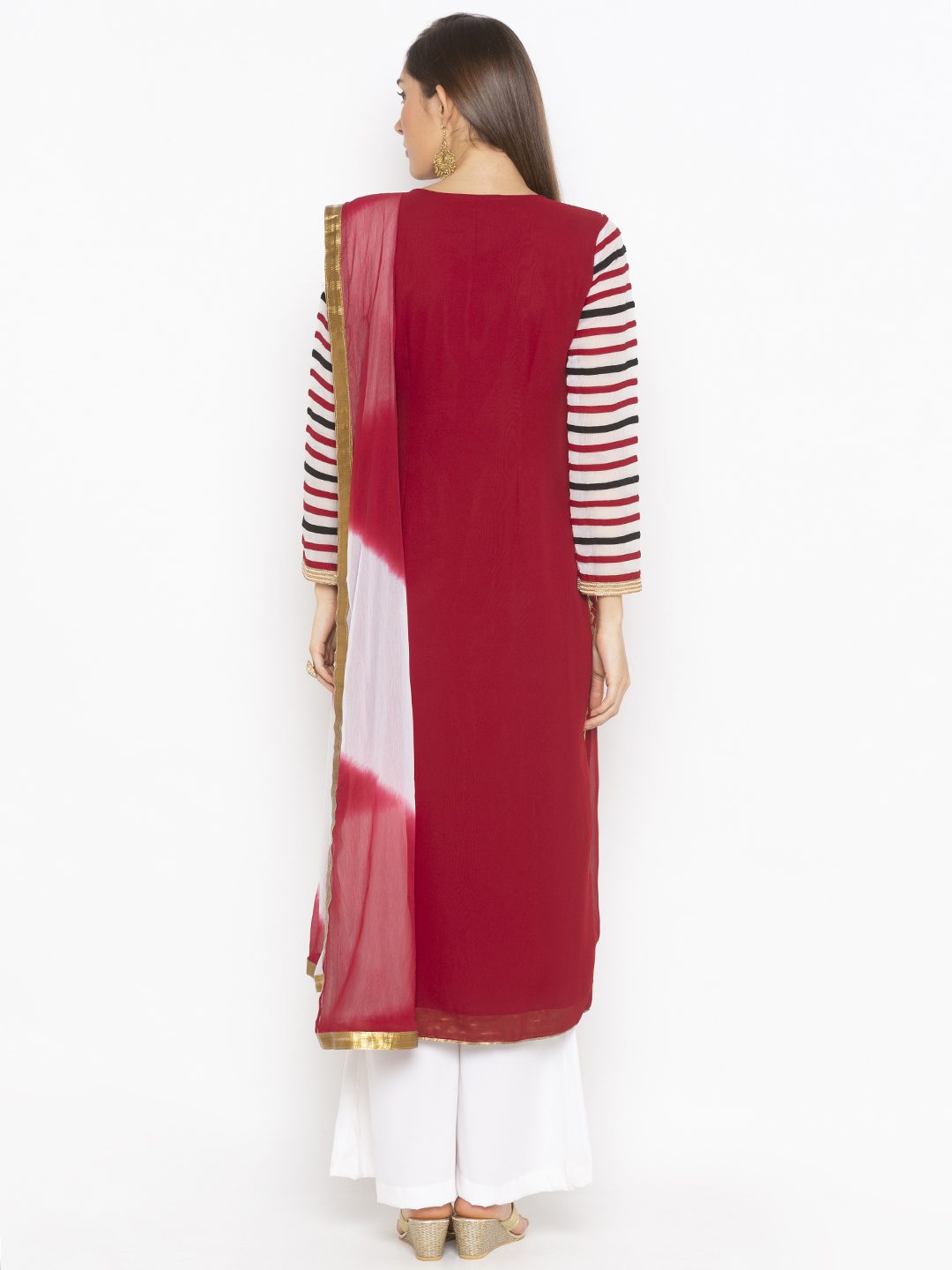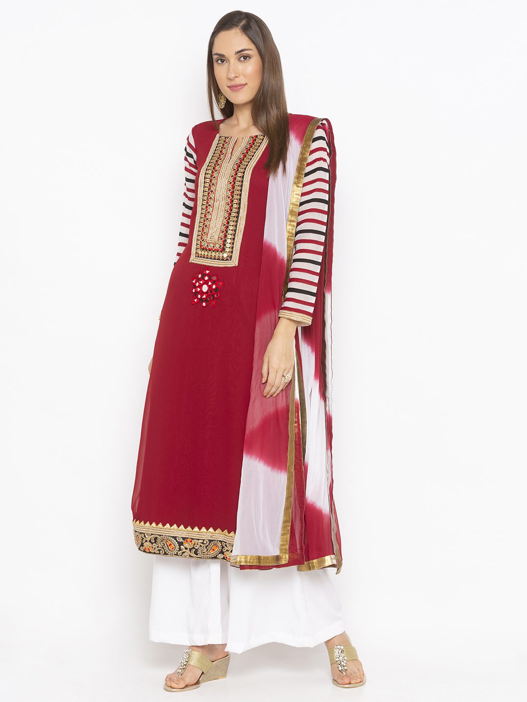 Nikhaar Creations Maroon Embroidered Georgette Straight Cut Palazzo Kurta Dupatta