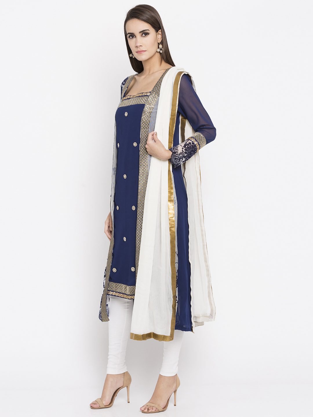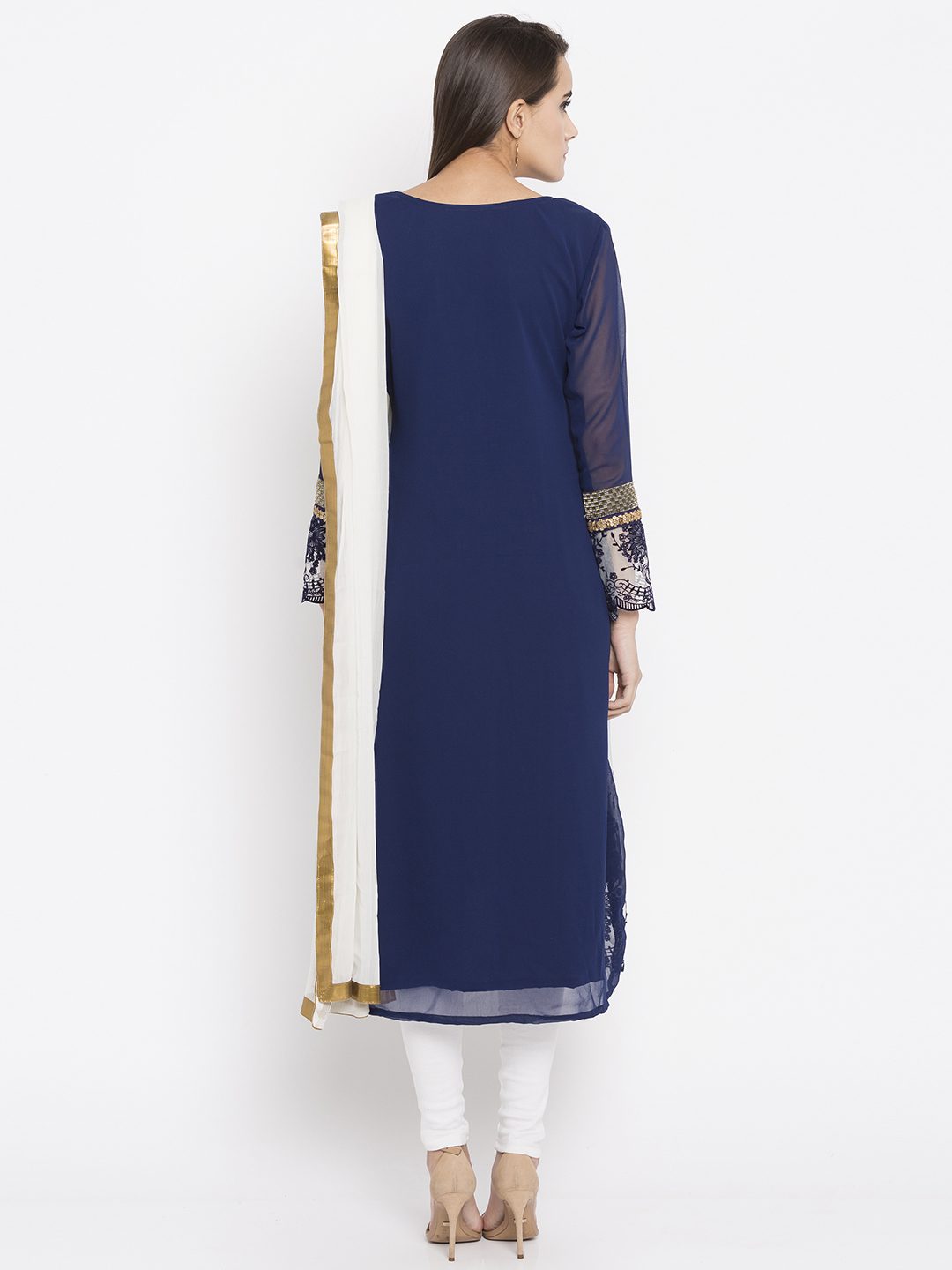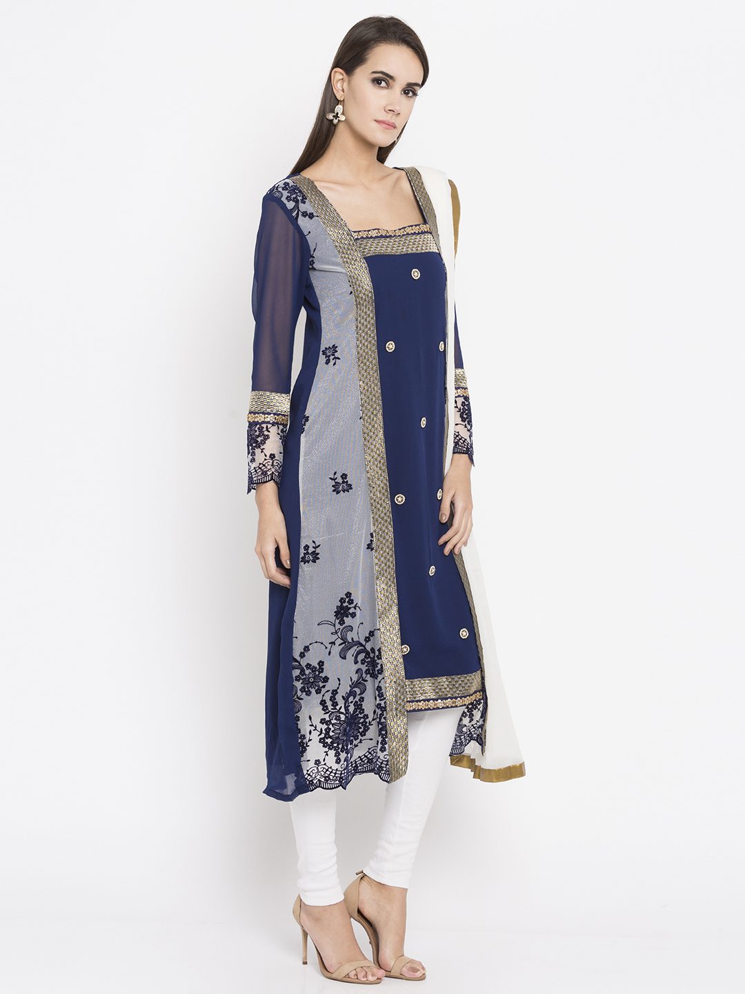 Navy Blue White Embroidered Side Panel Kurta With Brocade And Embroidery Detailing On Front Panel And Sleeves. Worn with Off White Churidar. Worn With White Churidar And Off White Chiffon Dupatta.