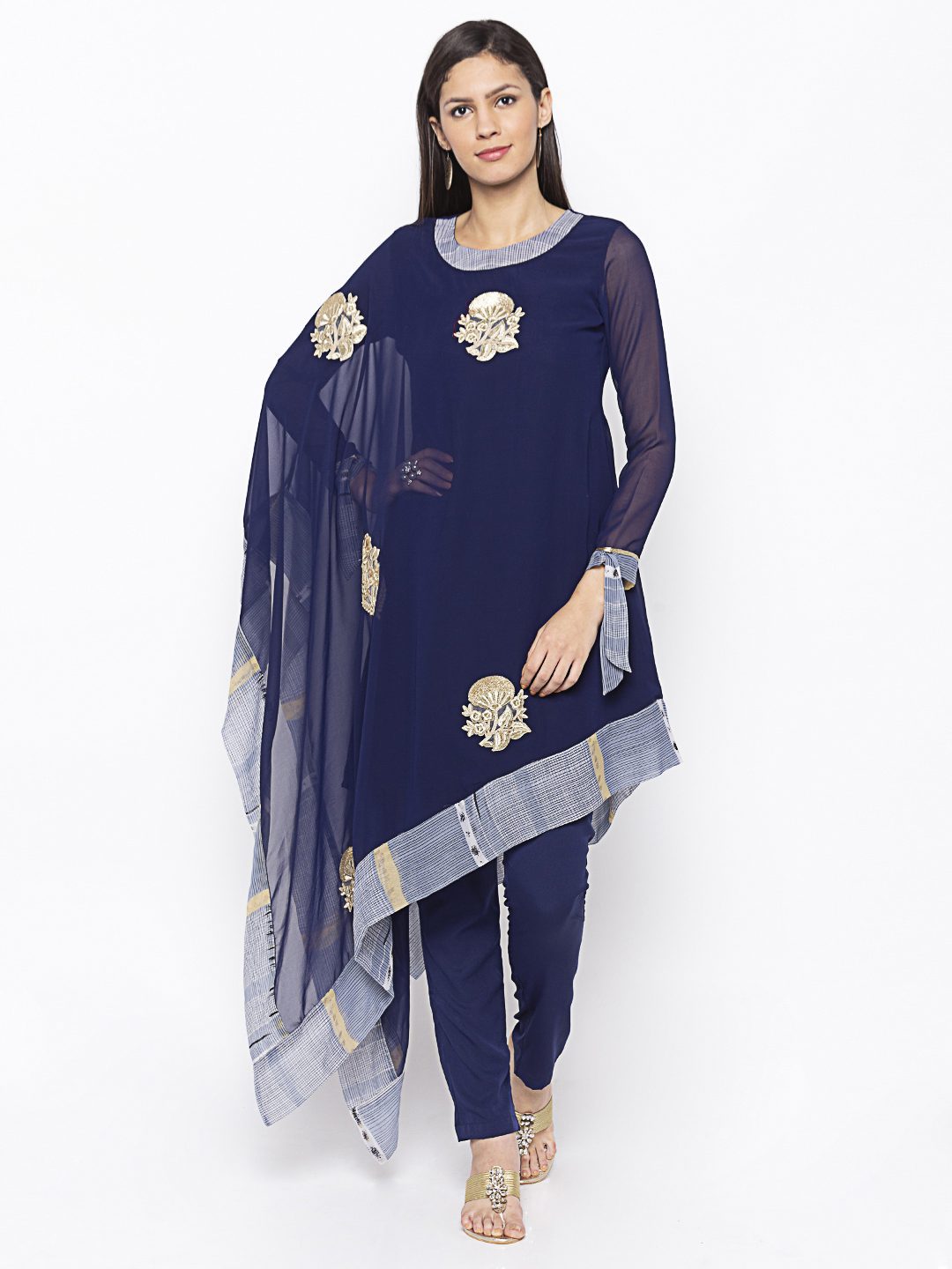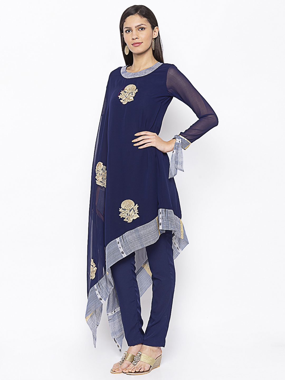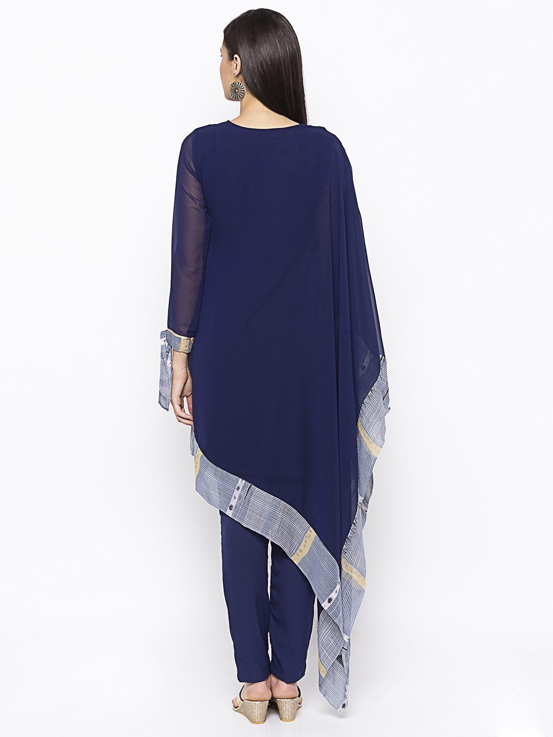 Nikhaar Creations Navy Blue Embroidered Georgette Asymmetrical Kurta