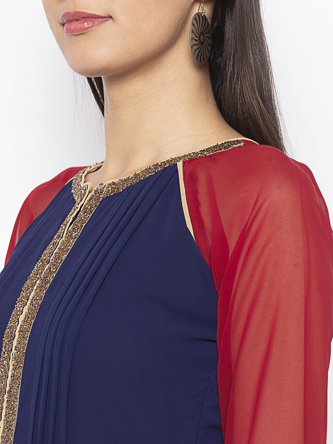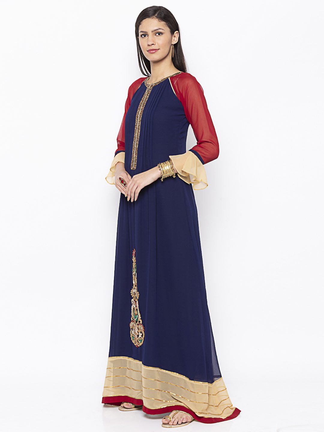 Navy Blue Pleated Full Length Georgette A Line Kurta With Maroonish Red Raglan Full Sleeves With Hand Embroidered Beadwork On Neckline And Zardozi And Crystals Hand Embroidered Motif On The Hemline With Beige Georgette And Gold Gota Patti Detailing In The Hemline.