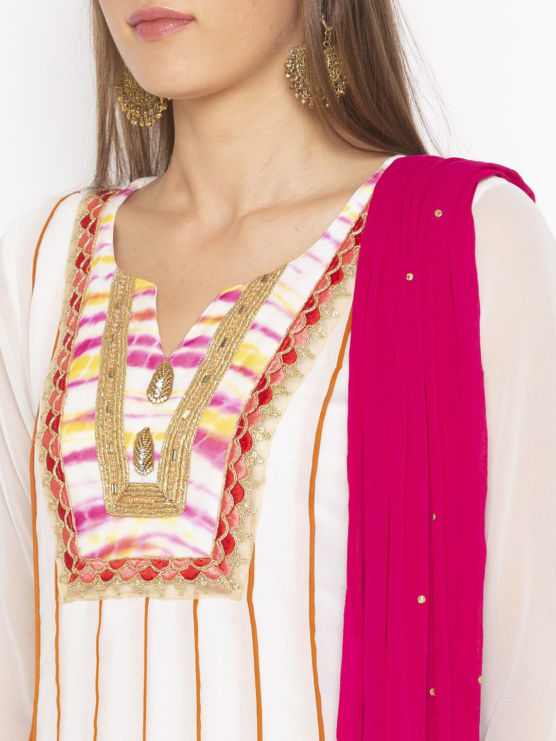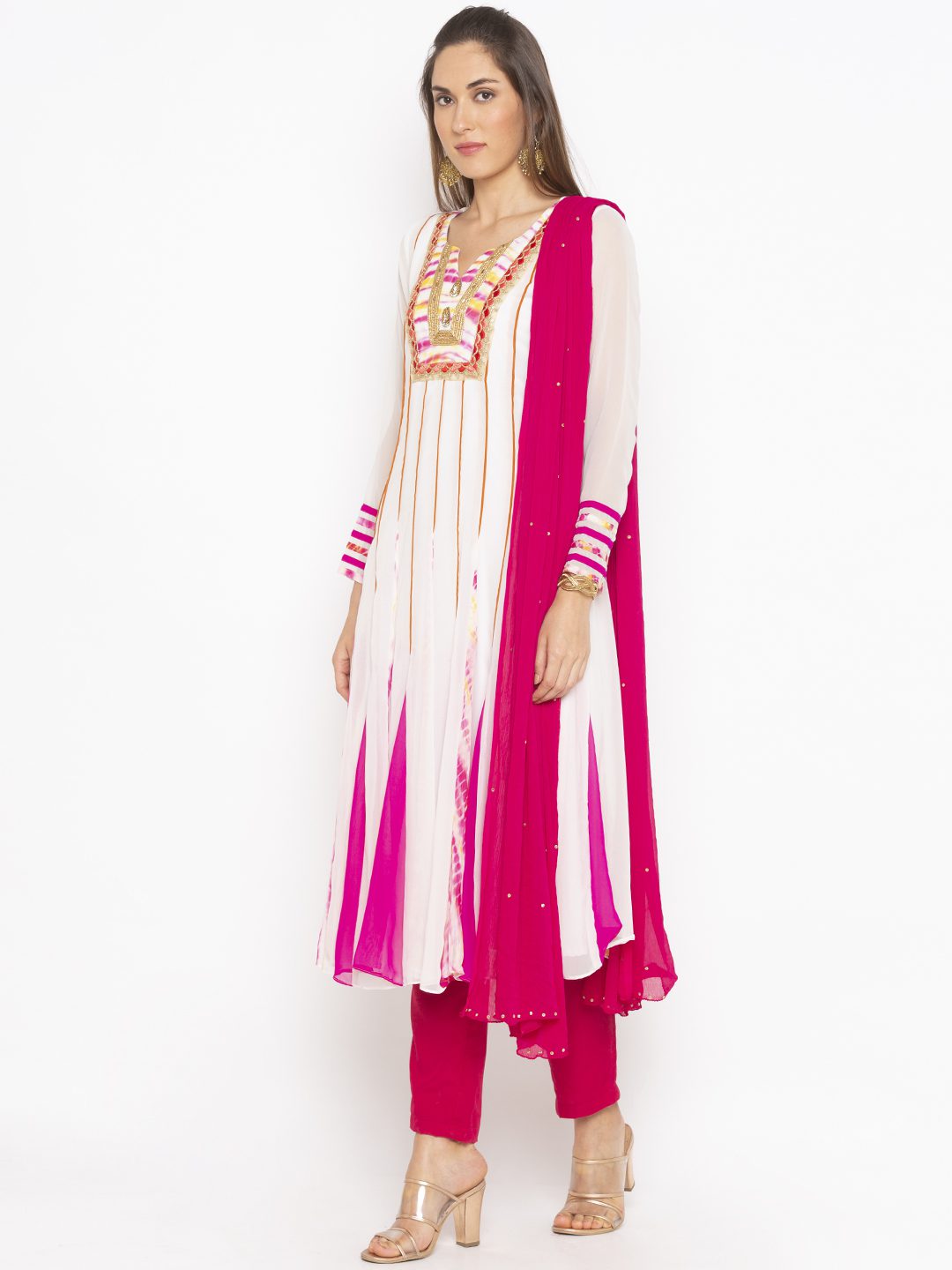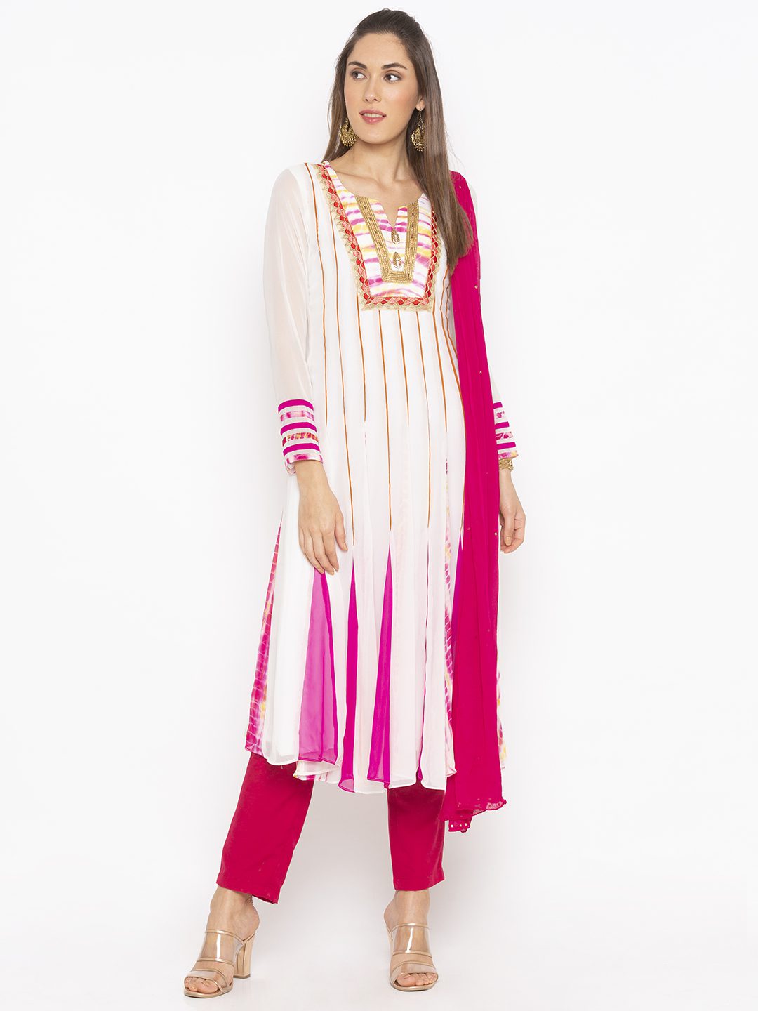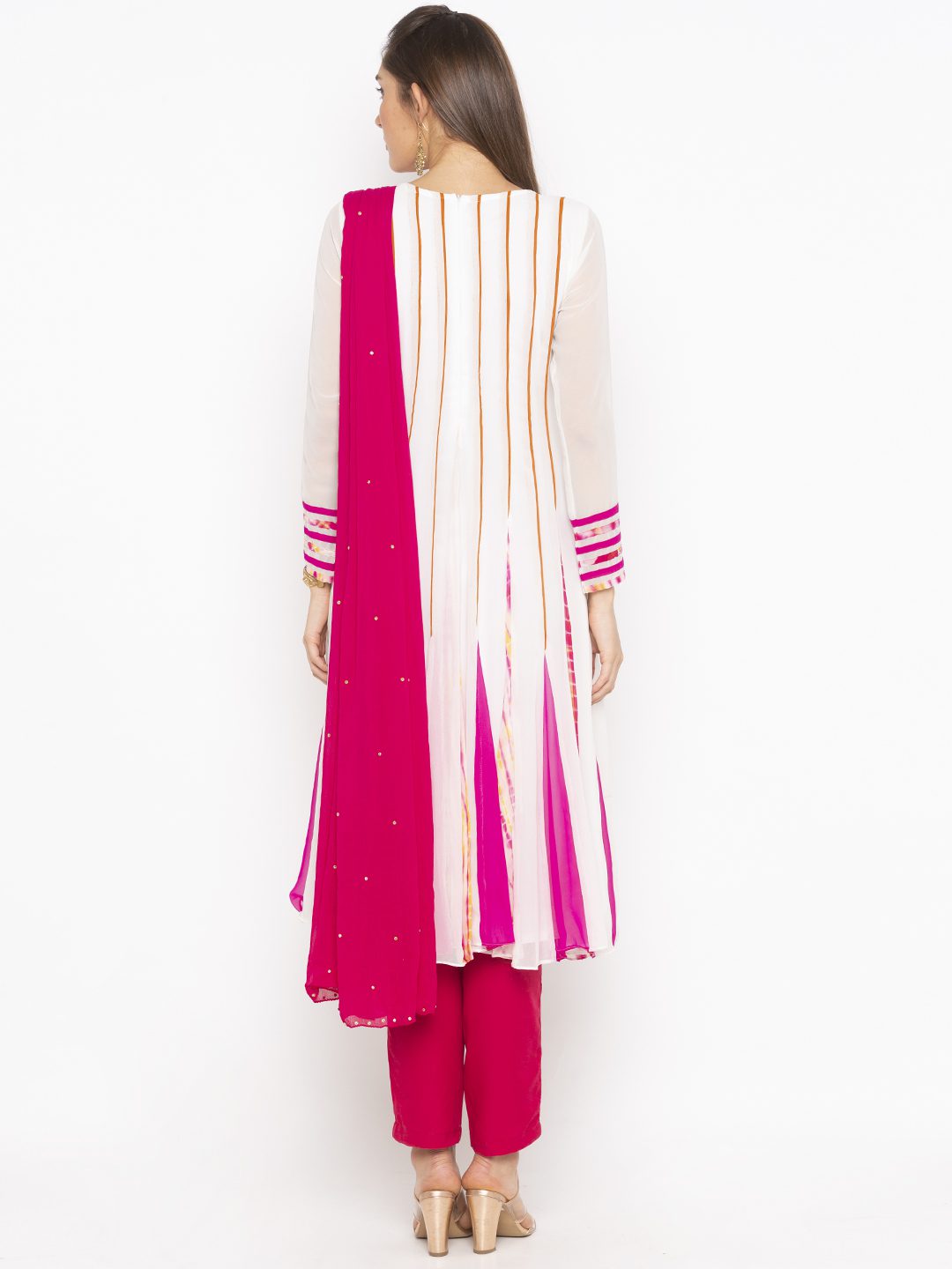White Pink Leheriya Shaded Georgette Kalidar Kurta With Rust Piping In Kalis And Contrast Plain/Lehariya Fish Kalis In Ghera Embroidered Border Ddetailing On Neck And Sleeves With Pink Pants And Pink Dupatta Chiffon With Diamantes On It.