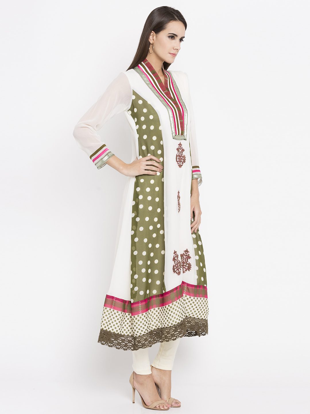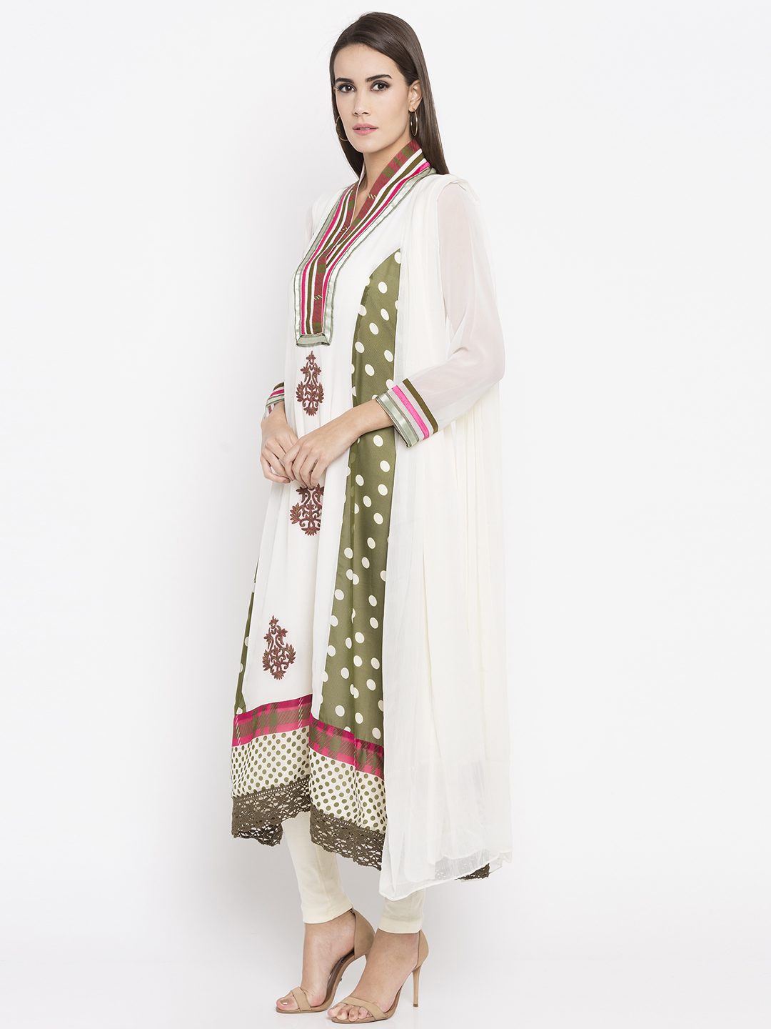 Off-white georgette readymade quarter sleeves asymmetrical kameez designed with rich embroidery detailing enhanced by polka dot printing at front panels and hemline.worn with off white churidar And Off White Chiffon Dupatta.