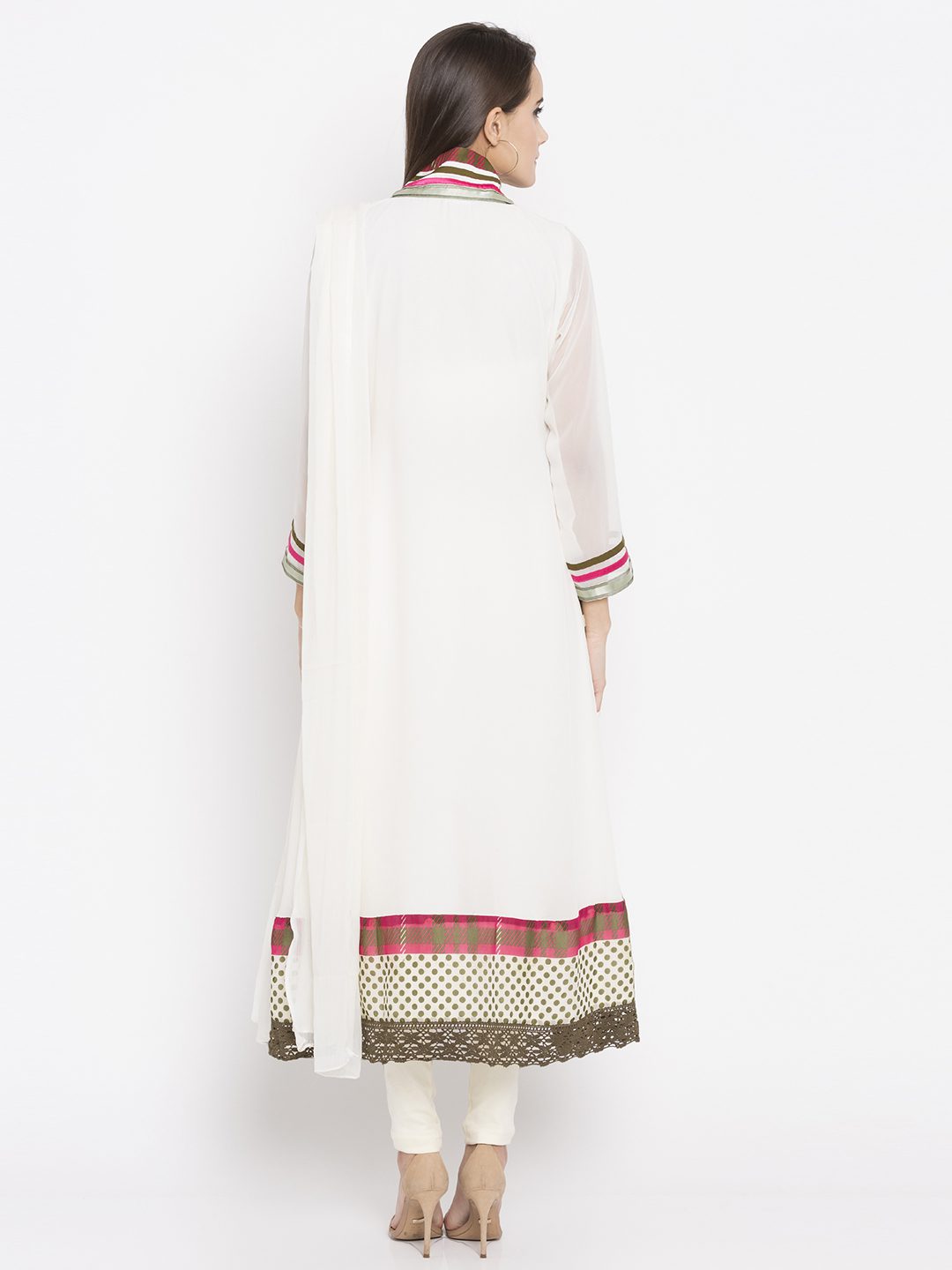 Nikhaar Creations Off White Embroidered Georgette Asymmetrical Churidar Kurta Dupatta