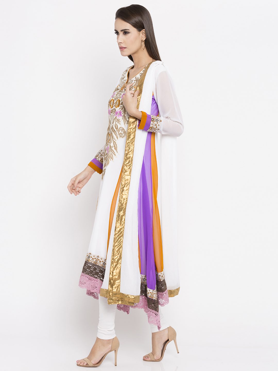 Off white georgette readymade asymmetrical kameez designed with rich zari and resham embroidery detailing at the neckyoke including mirror work .worn with white churidar And white chiffon dupatta.