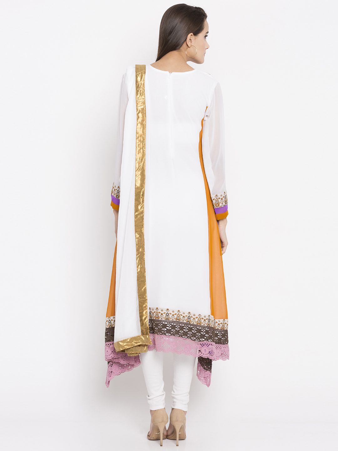 Nikhaar Creations Off White Embroidered Georgette Asymmetrical churidar Kurta Dupatta