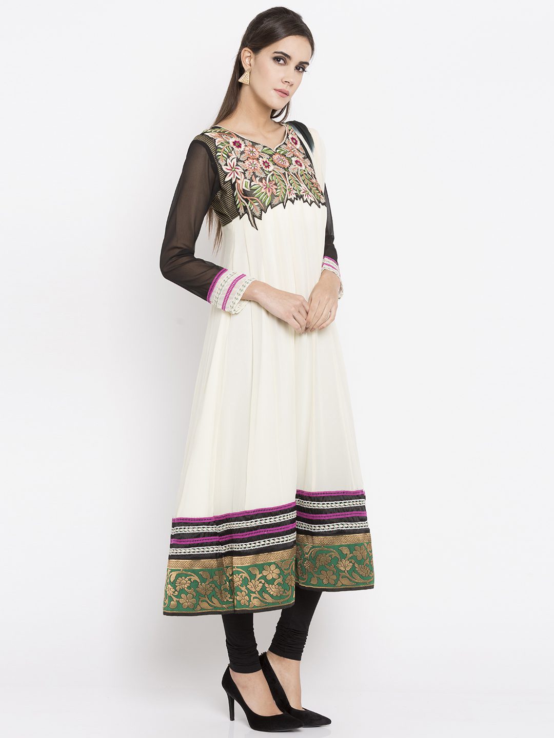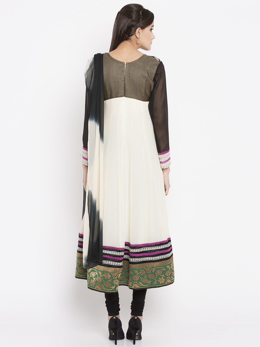 Off-white georgette readymade quarter sleeves kalidar kameez designed with rich resham embroidery detailing at the neckyoke including mirror work. This empire line flared kameez comes with a crape churidar in black and a chiffon in shaded black & white Dupatta.