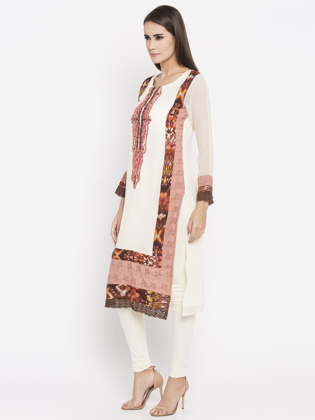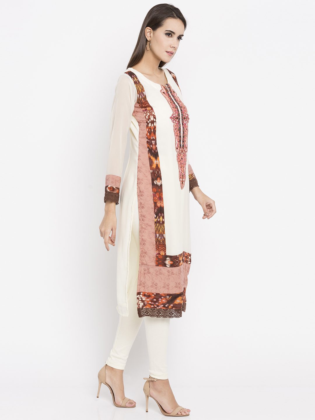 Off-white georgette readymade full sleeves straight cut kameez designed with rich embroidery detailing at the neckyoke including beads, stone and sequins work.