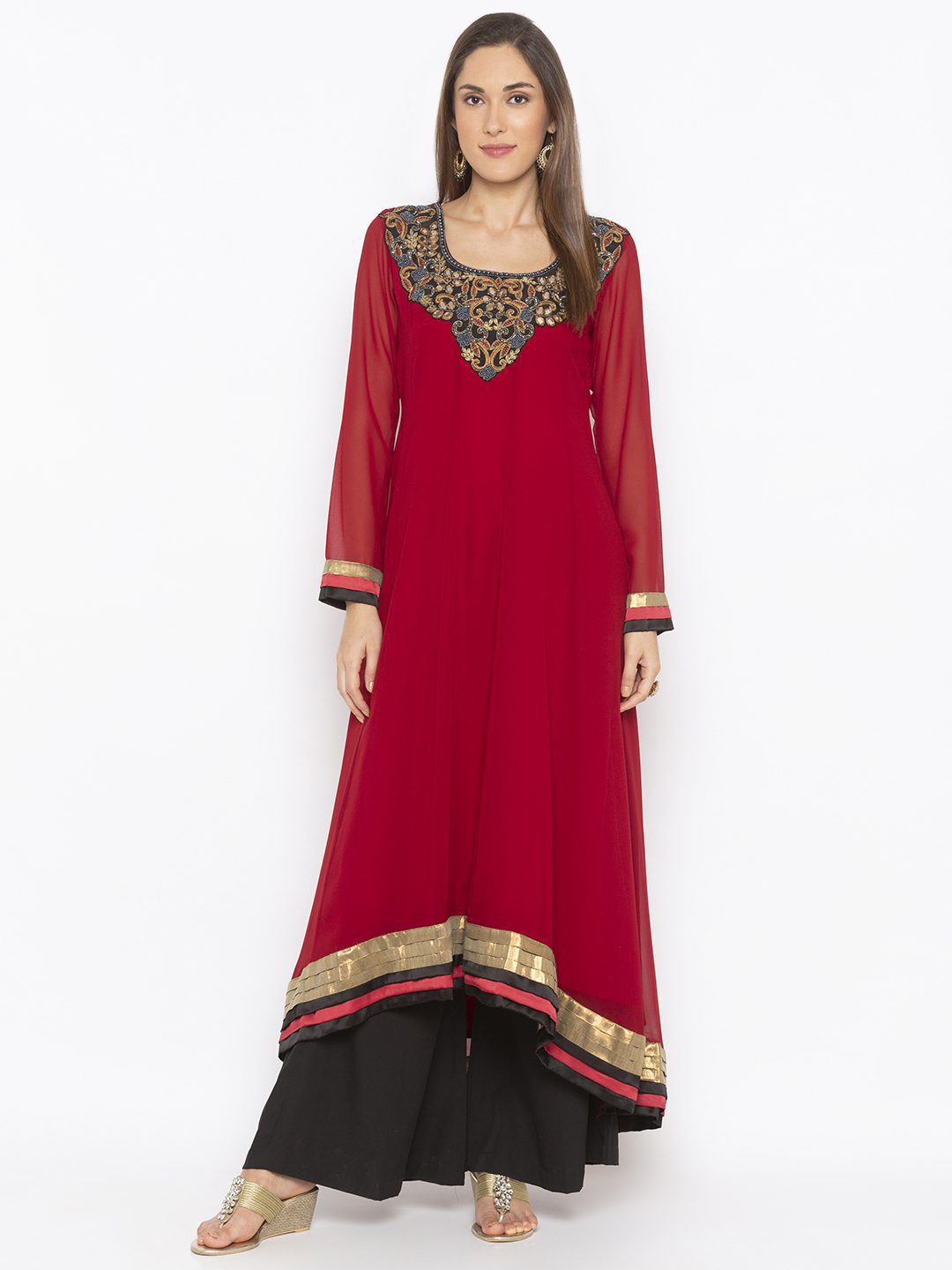 Maroon Asymmetrical Georgette Kalidaar Kurta With Hand Embroidered Neckline Full Sleeves ..Antique Gold And Contrast Satin Pleat Detailing On Asymmetrical Hemline And Sleeves Worn With Black Palazzo.