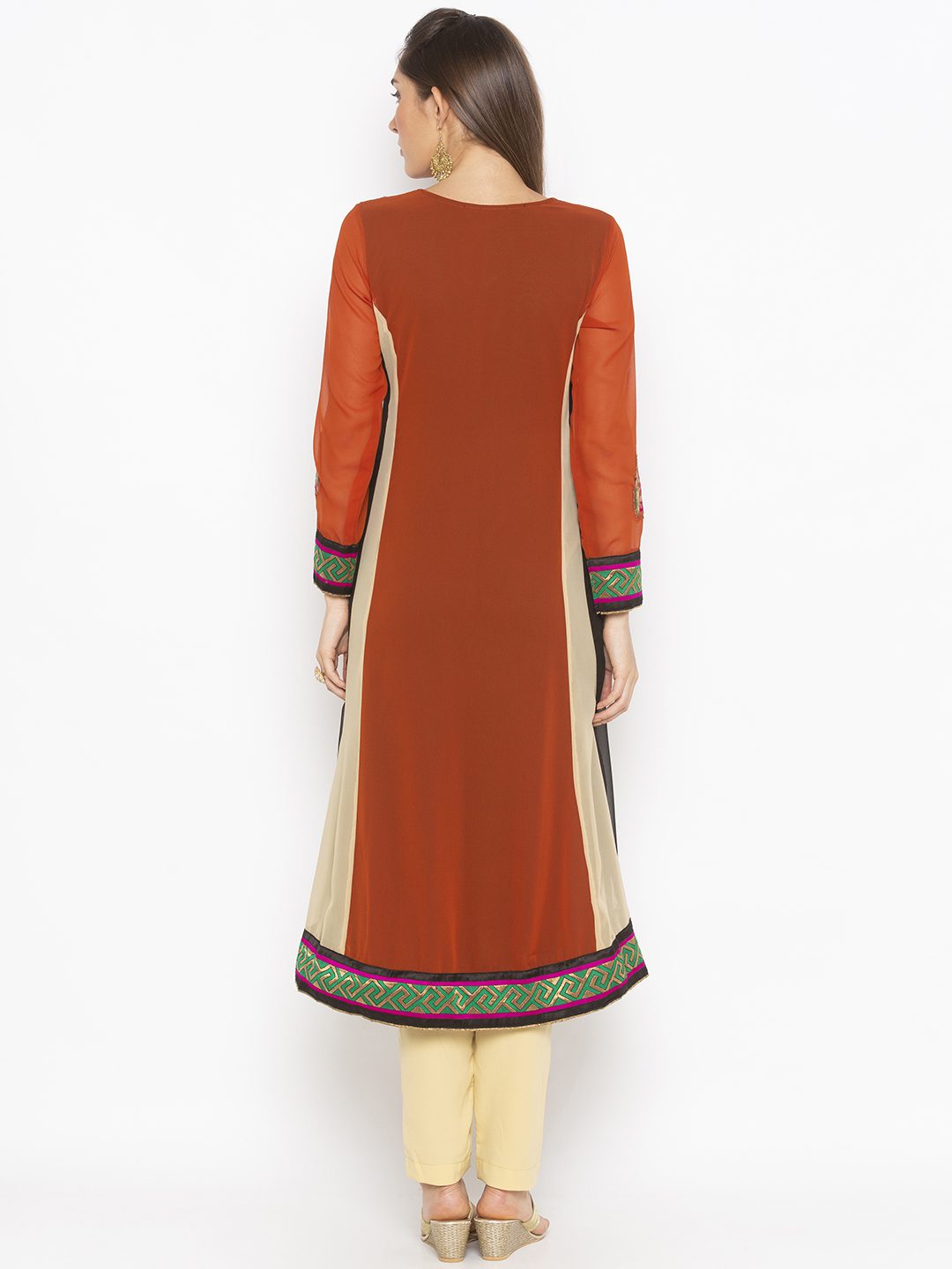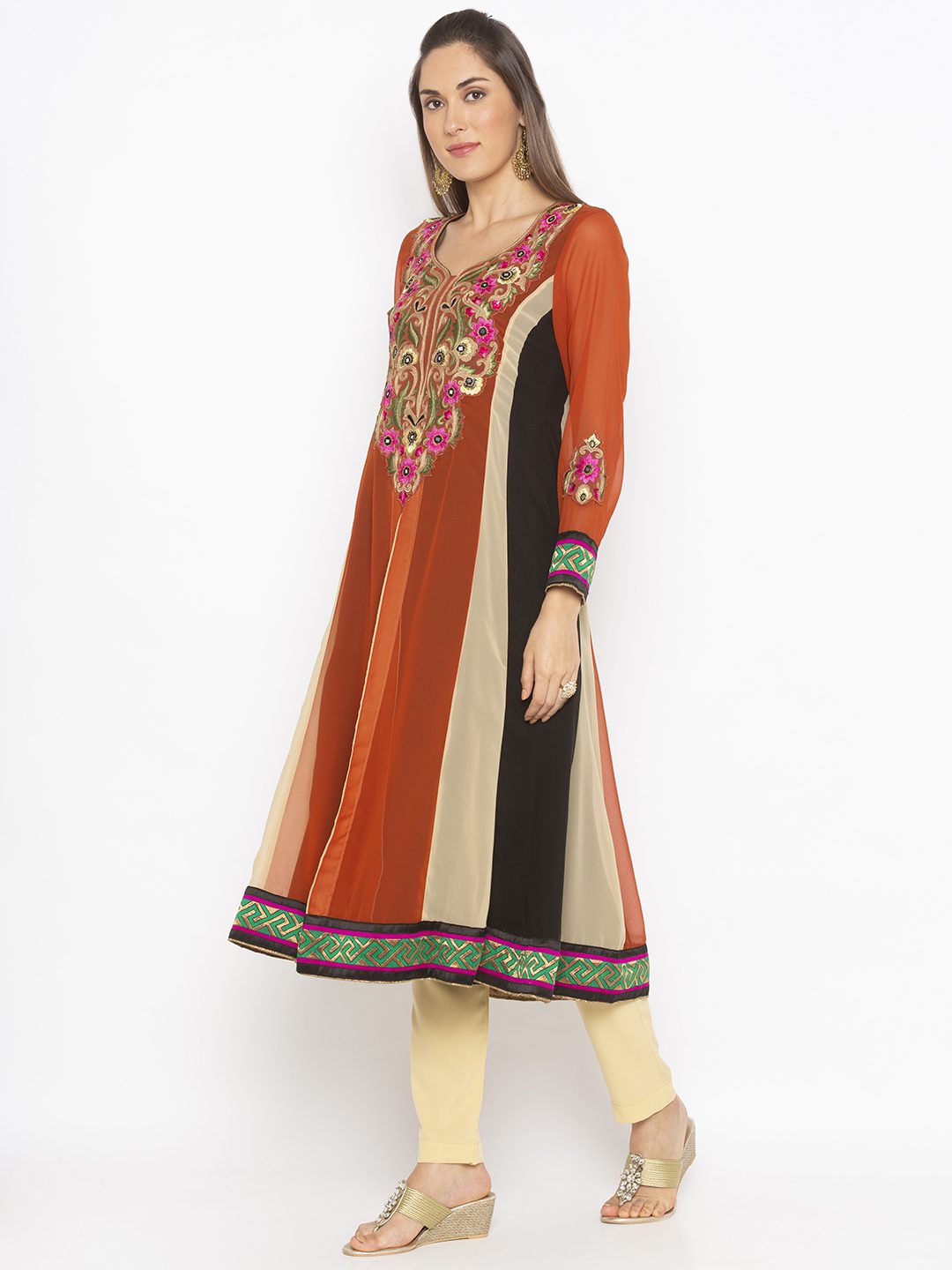 Rust Beige Black Georgette Kalidaar Kurta With Mock Jacket Style Effect Slitted In The Front With Piping S On It Having Full Sleeves… Embroidery On Neckline And Sleeves With Brocade.. Satin.. Tissue Detailing On Sleeves And Hemline.