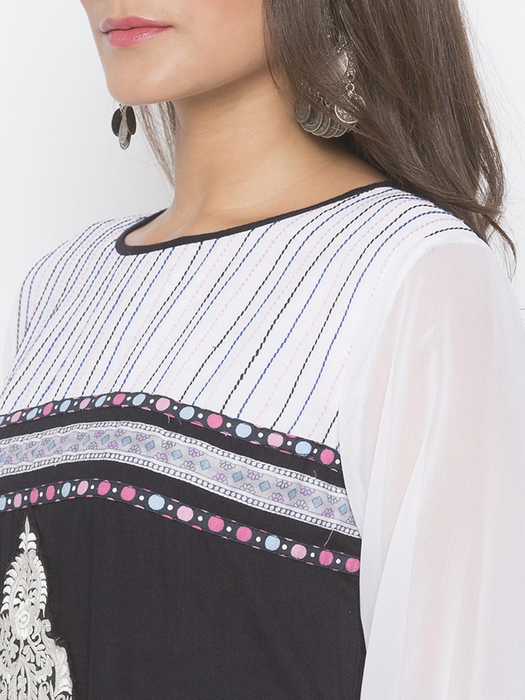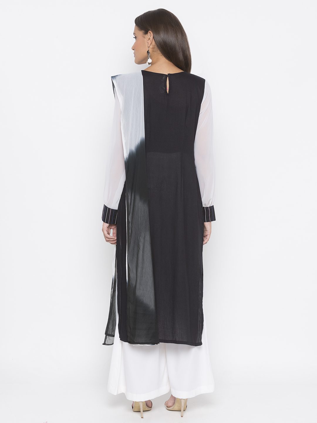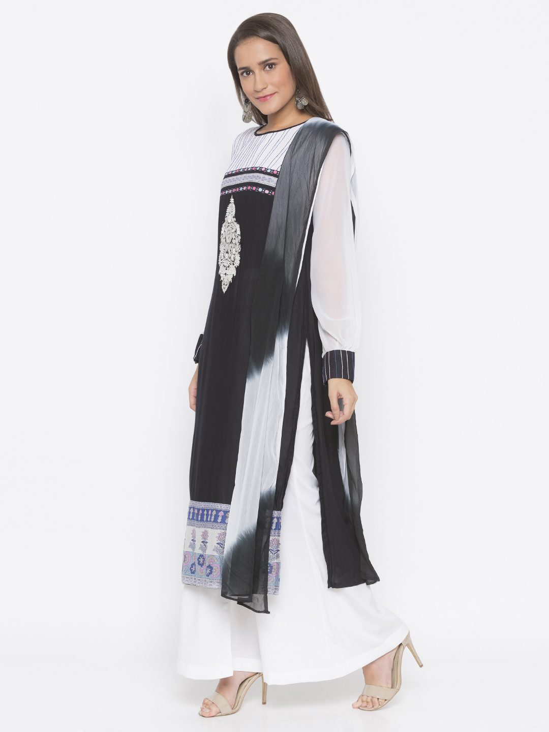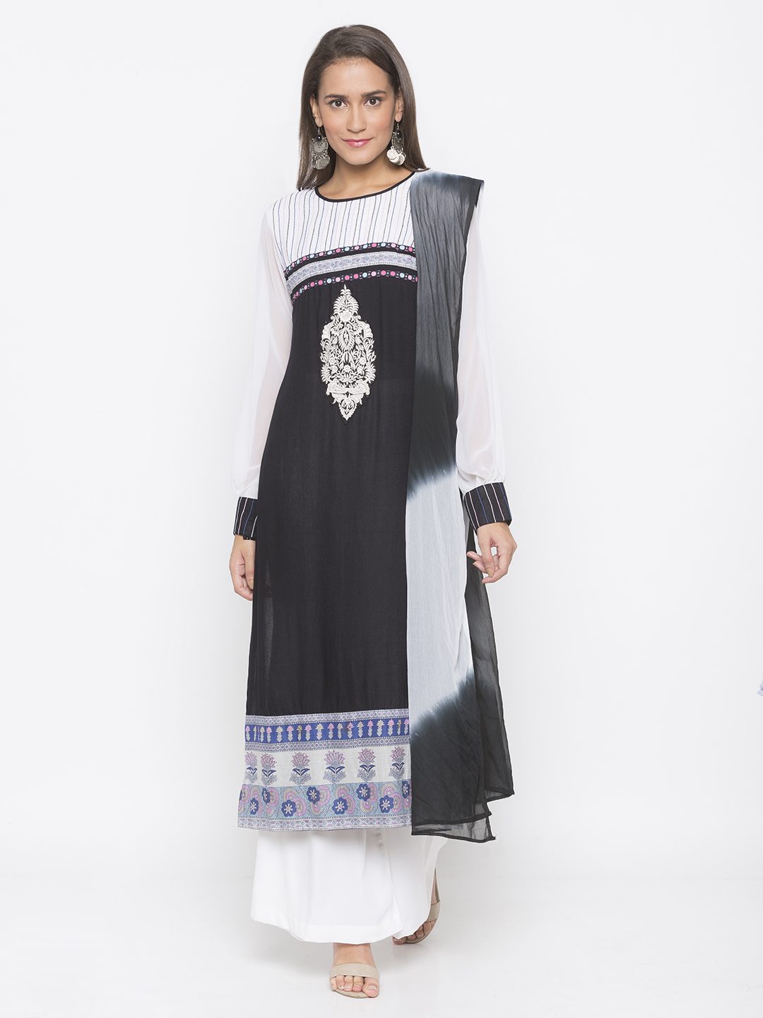 Black Cotton Straight Cut Kurta With Off White Georgette Empire Line Yoke And Full Sleeves With Anchor Thread Embroidery Detailing On It ..Black And White Embroidery Below Yoke With Print Polka Detailing Also On Hemline. Worn With Off White Palazzo And Shaded Black And White Chiffon Dupatta.