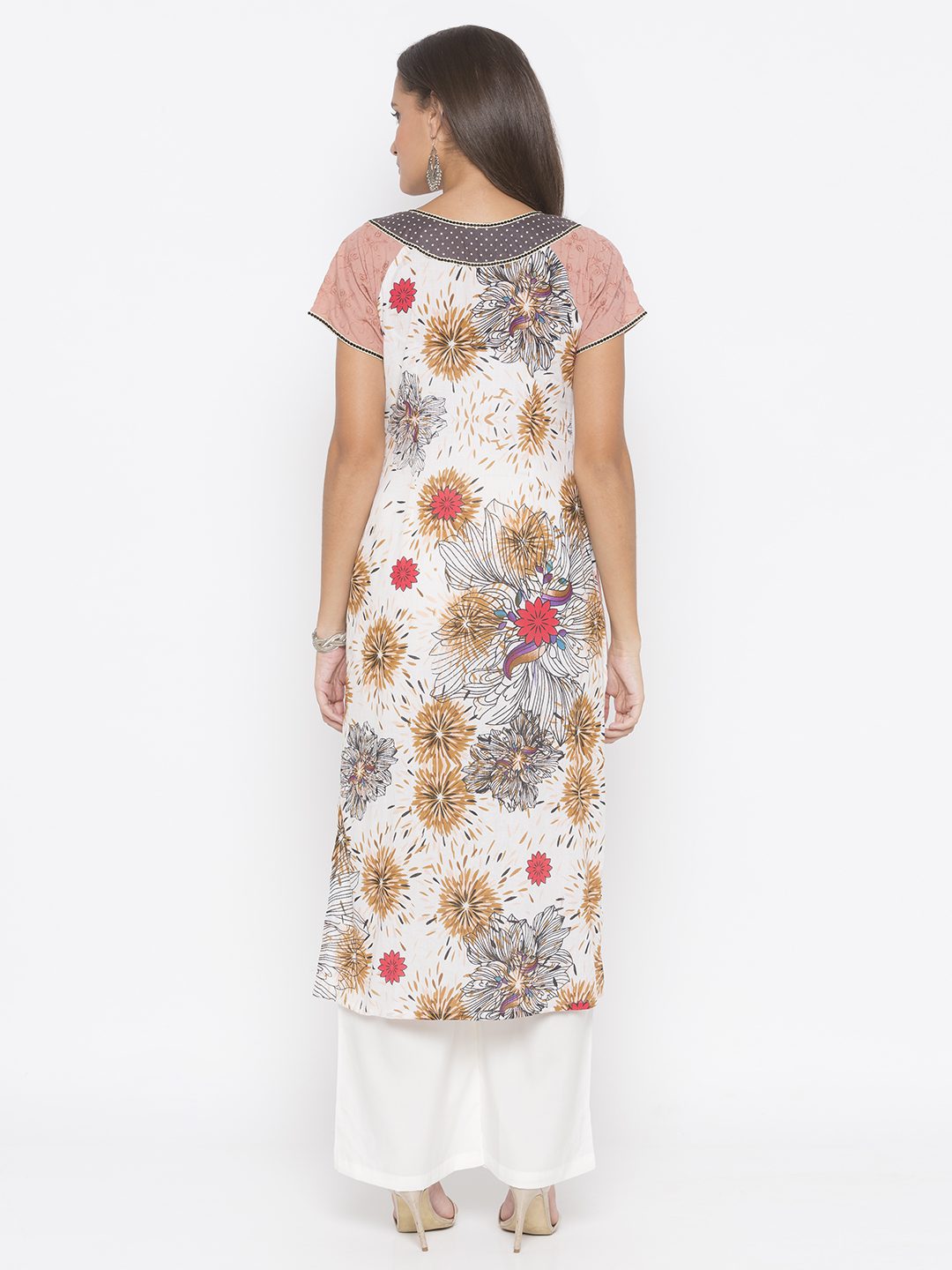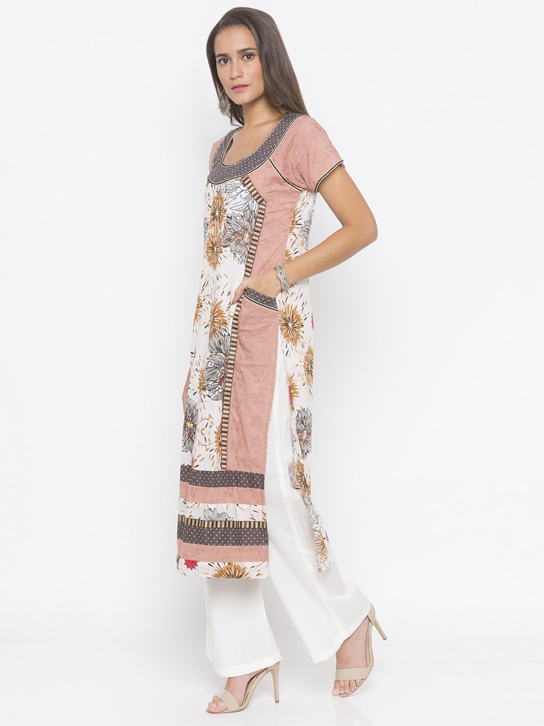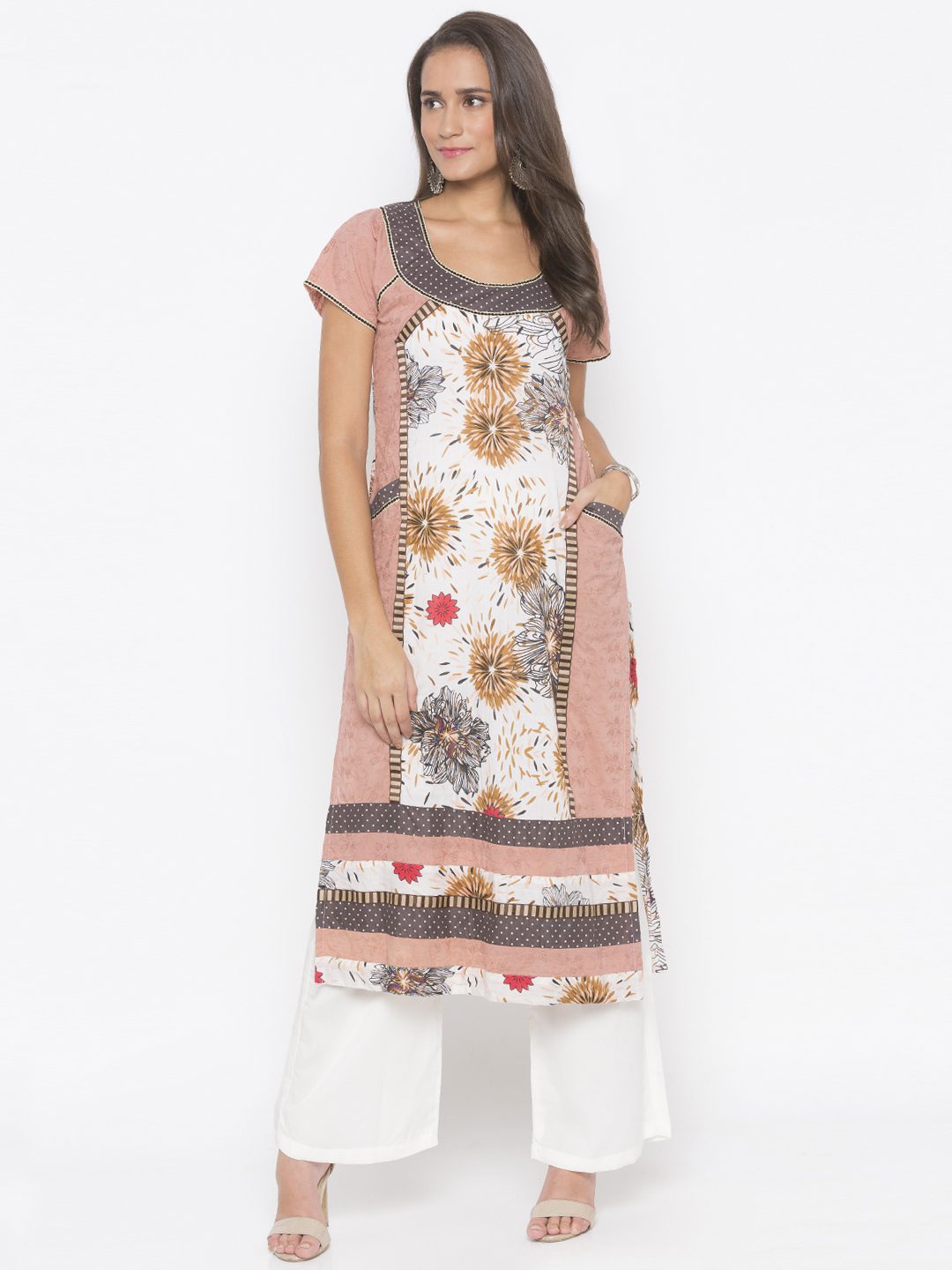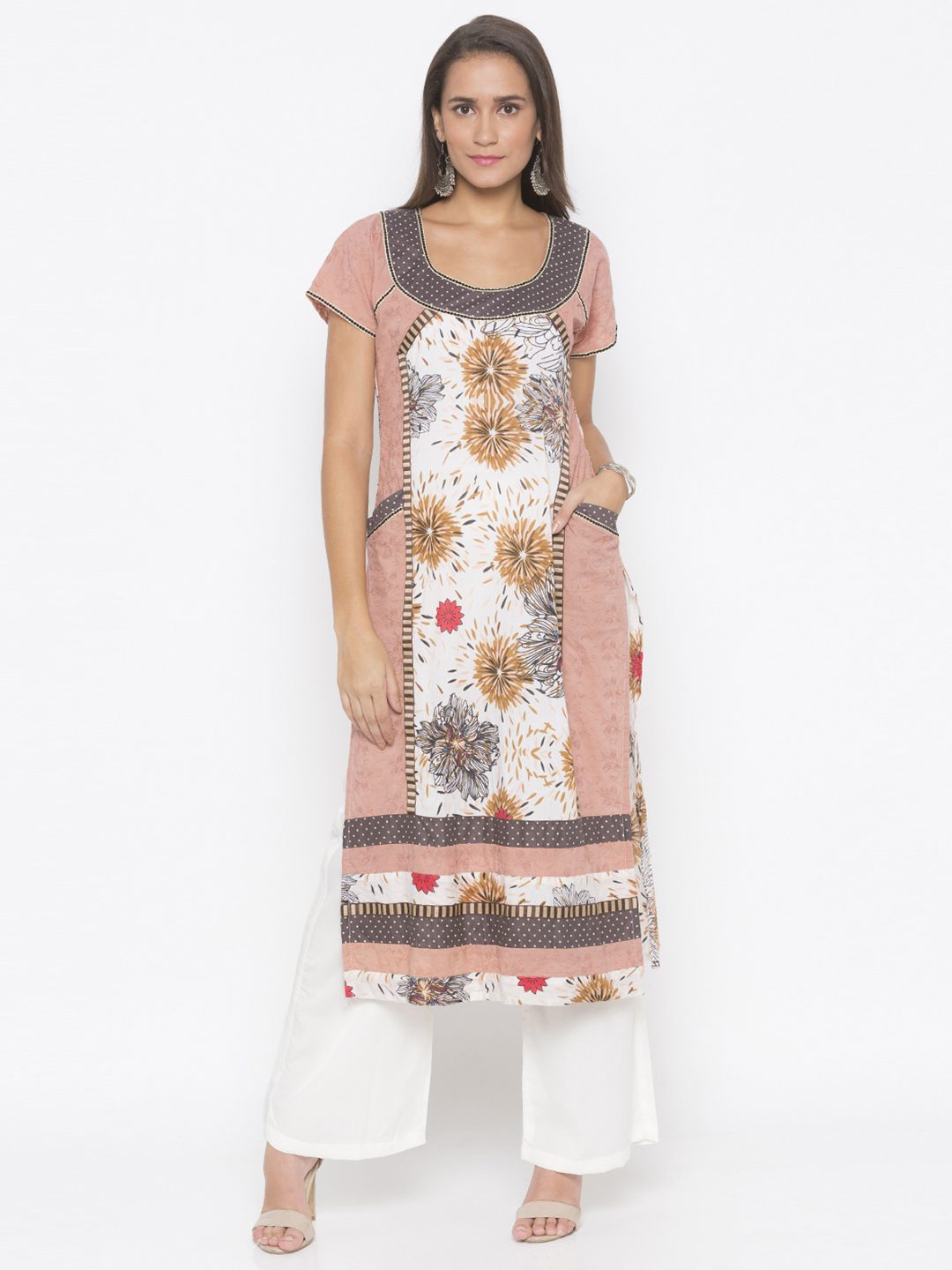 Dull Peach Hakoba Pure Cotton Kurta With Raglan Sleeves Having Printed Pure Cotton Centre Panel And Hem Lines With Polka Dot Yoke Detailing Around Front And Back Neck Having Embroidered Small Polka Dot Border Around It And On Raglan Sleeves And Polka Dot Pockets Having Same Detailing On It Also… Embroidered Resham Border Around Centre Panel And Hemline. Worn With Off-White Parallel Pants.