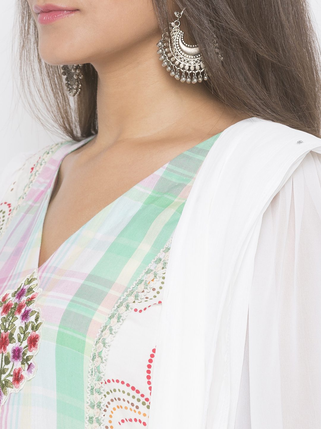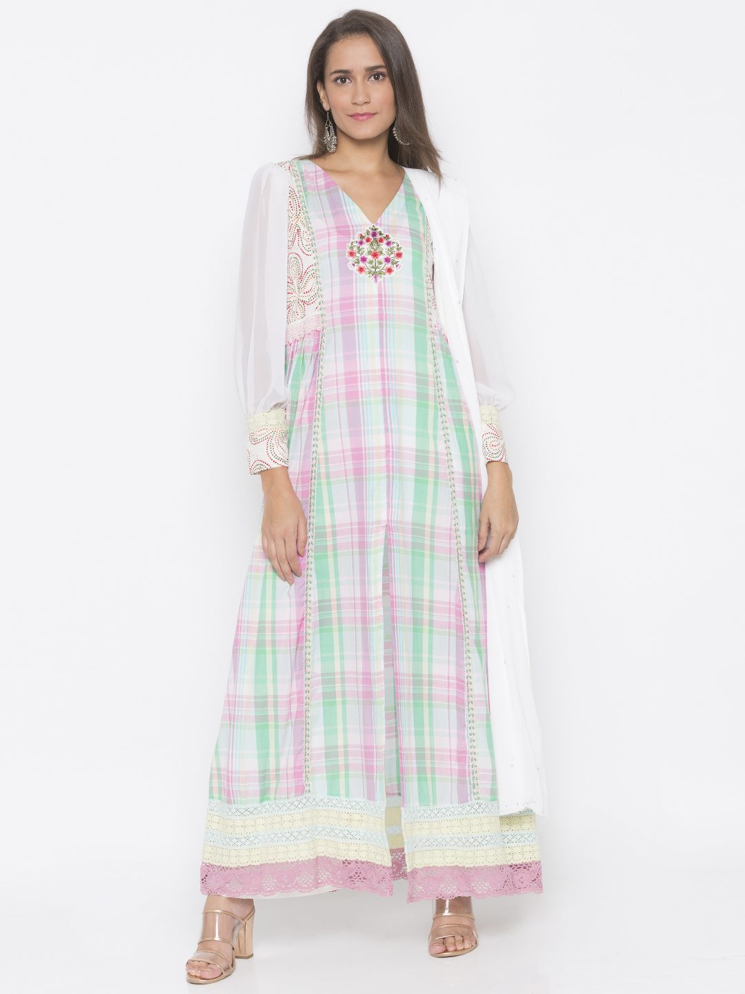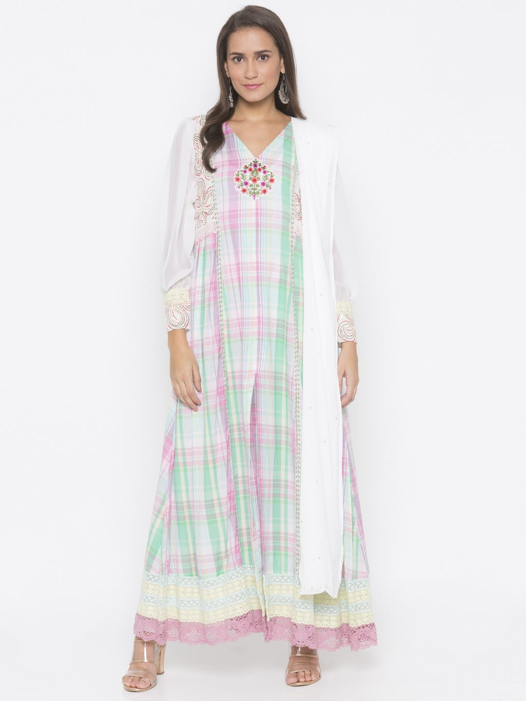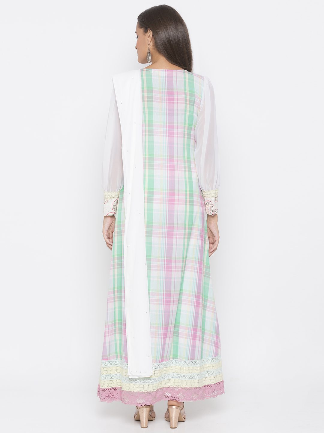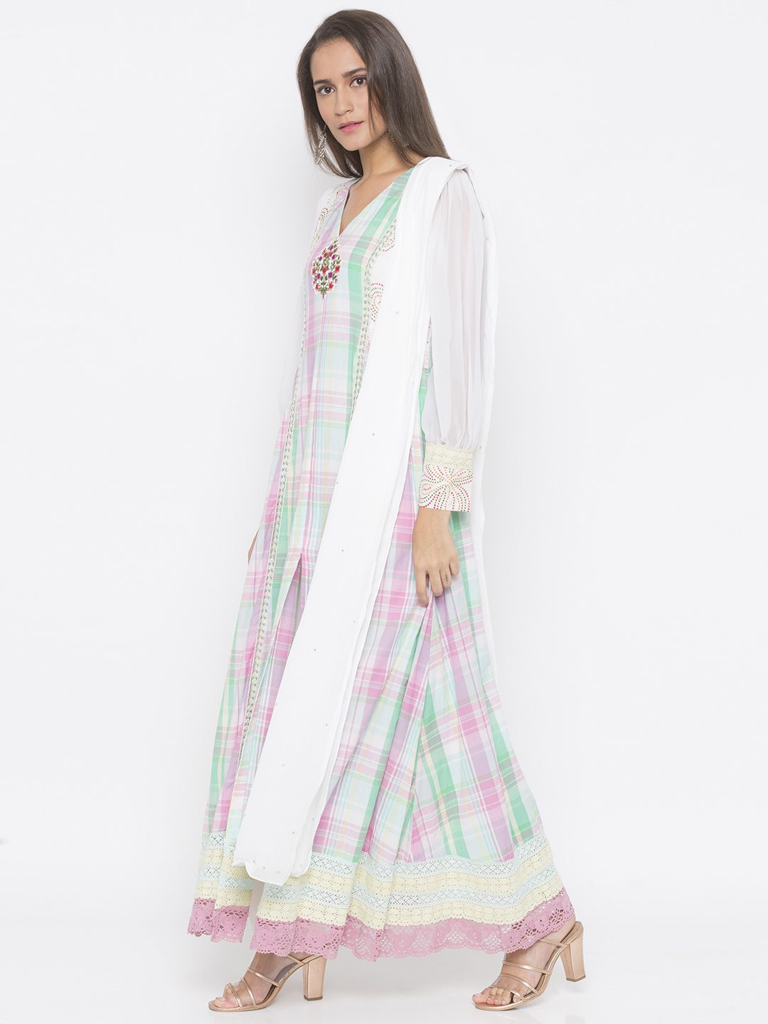 Pink Checked Cotton Full Length Slightly Flared Kurta With Chikan Detailing On Upper Body And Embroidery Below Neckline Having Full Sleeves Of Cream Georgette With Chikan And Lace Detailing On Front, Waist, Sleeves And Hemline. Paired with Off White Cigarette Pants and Dupatta.
