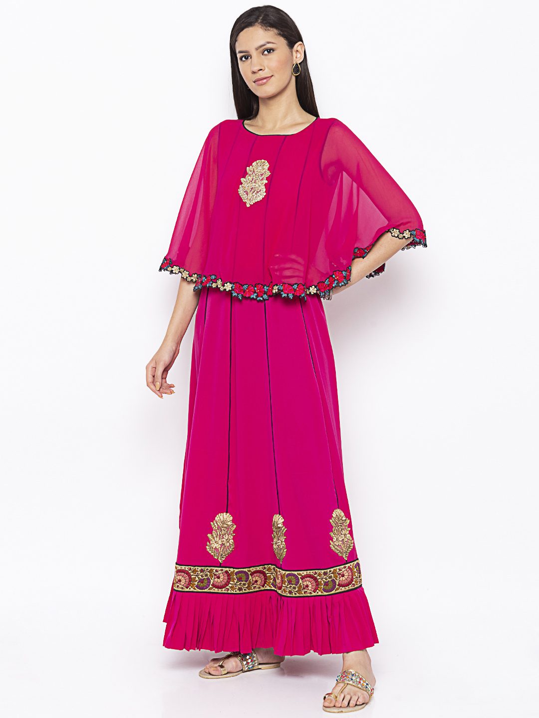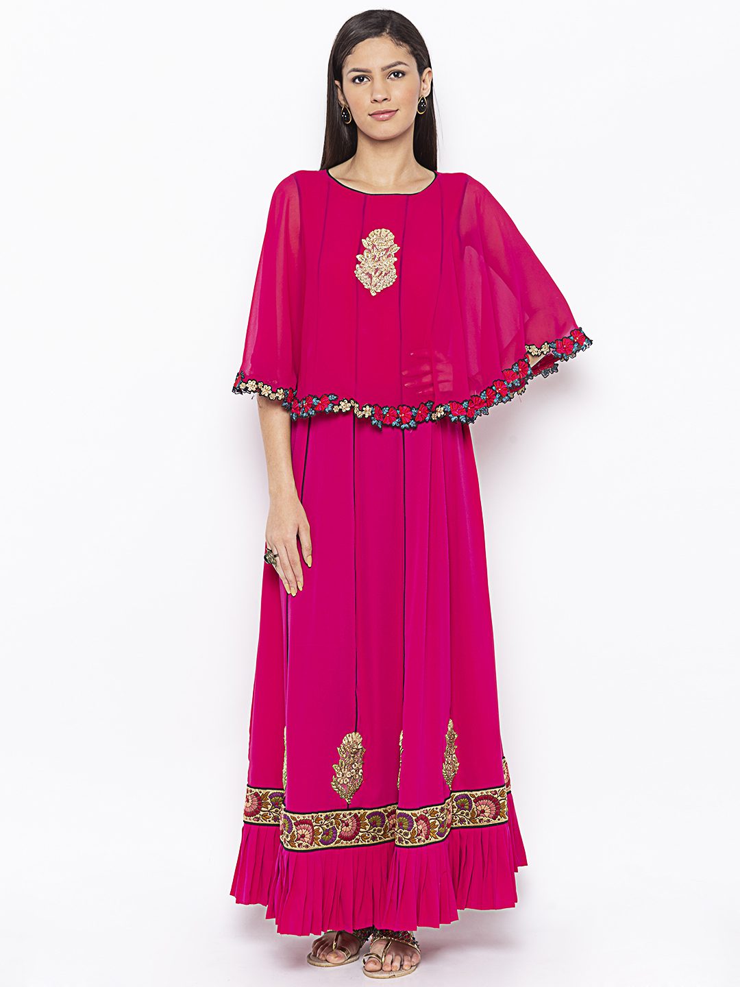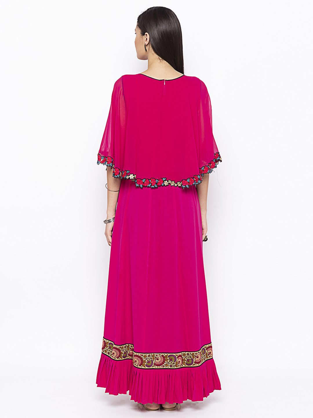 Magenta Pink Georgette Cape With American Crepe Kalidar Floor Length Kurta Having Black Pipings In Panels With Pleated Details In Hemline Embroidery All Over In The Front And Back Of Cape With Embroidery Also In The The Centre Panels (Lower )And Thread Embroidered Border In The Hemline. Won With Black Cigarette Pants.