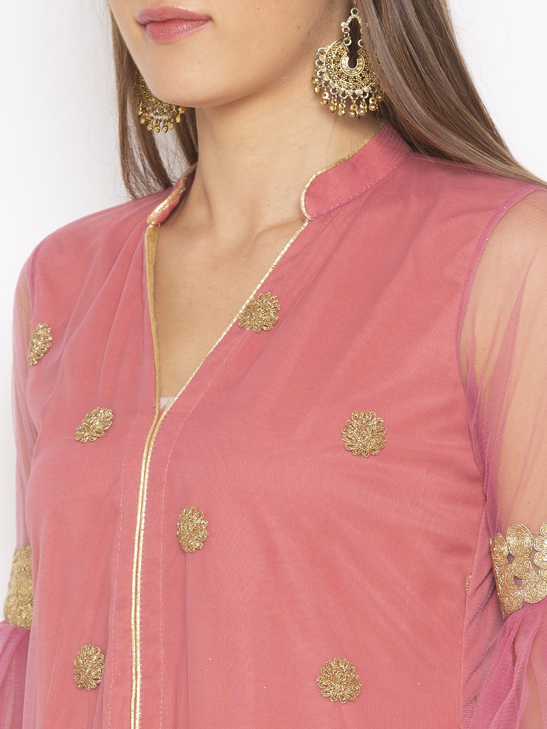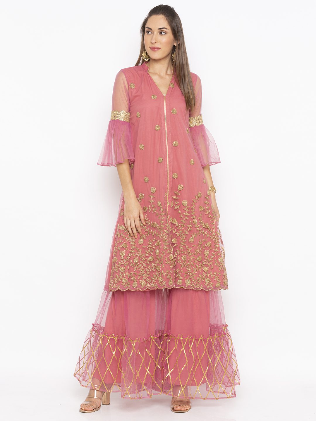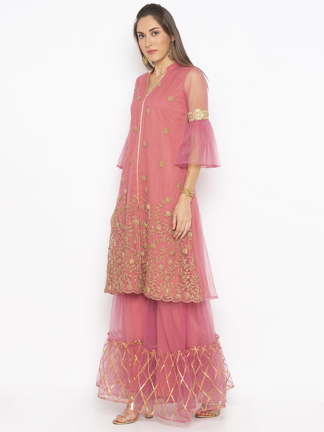 pink net embroidered kurta with bell sleeves.